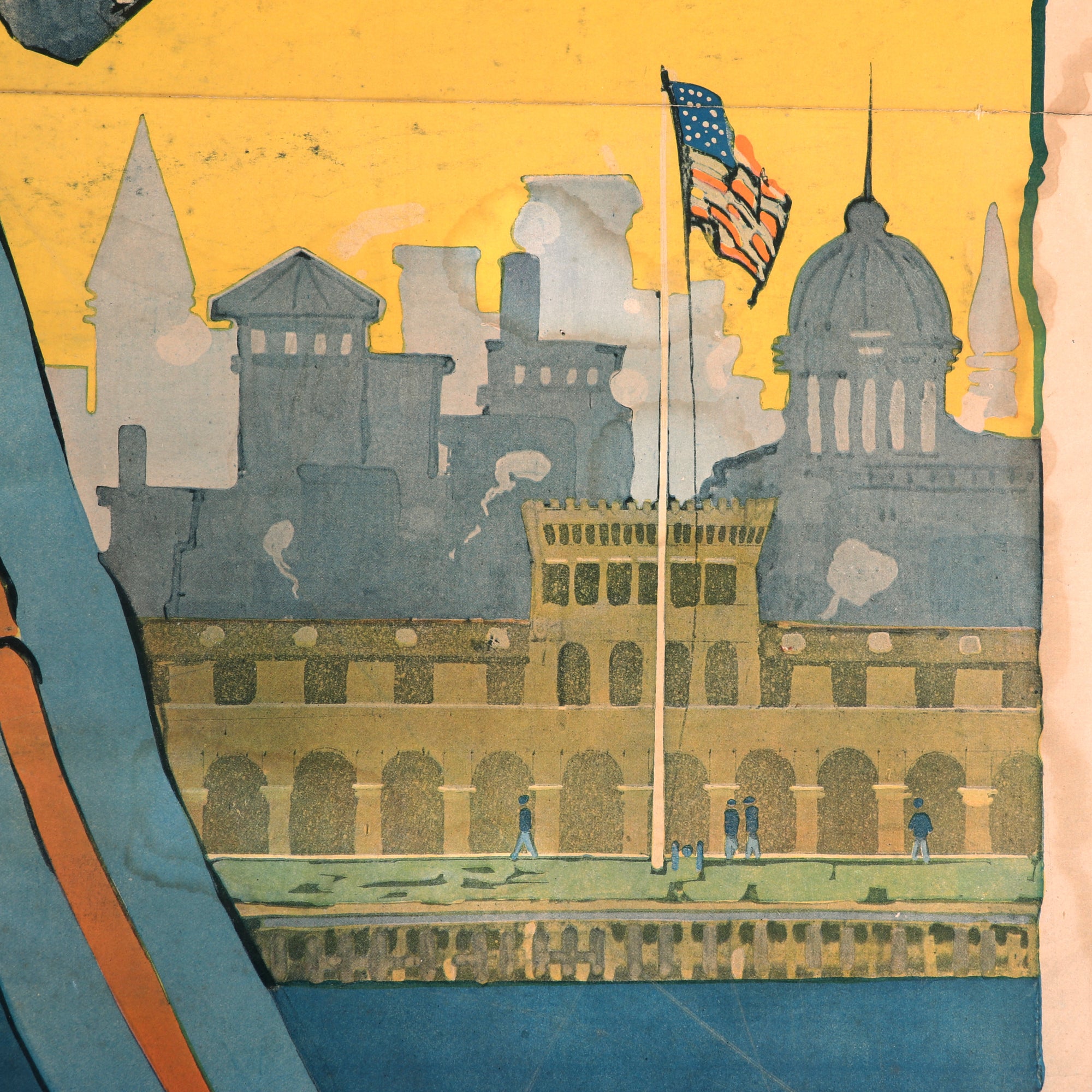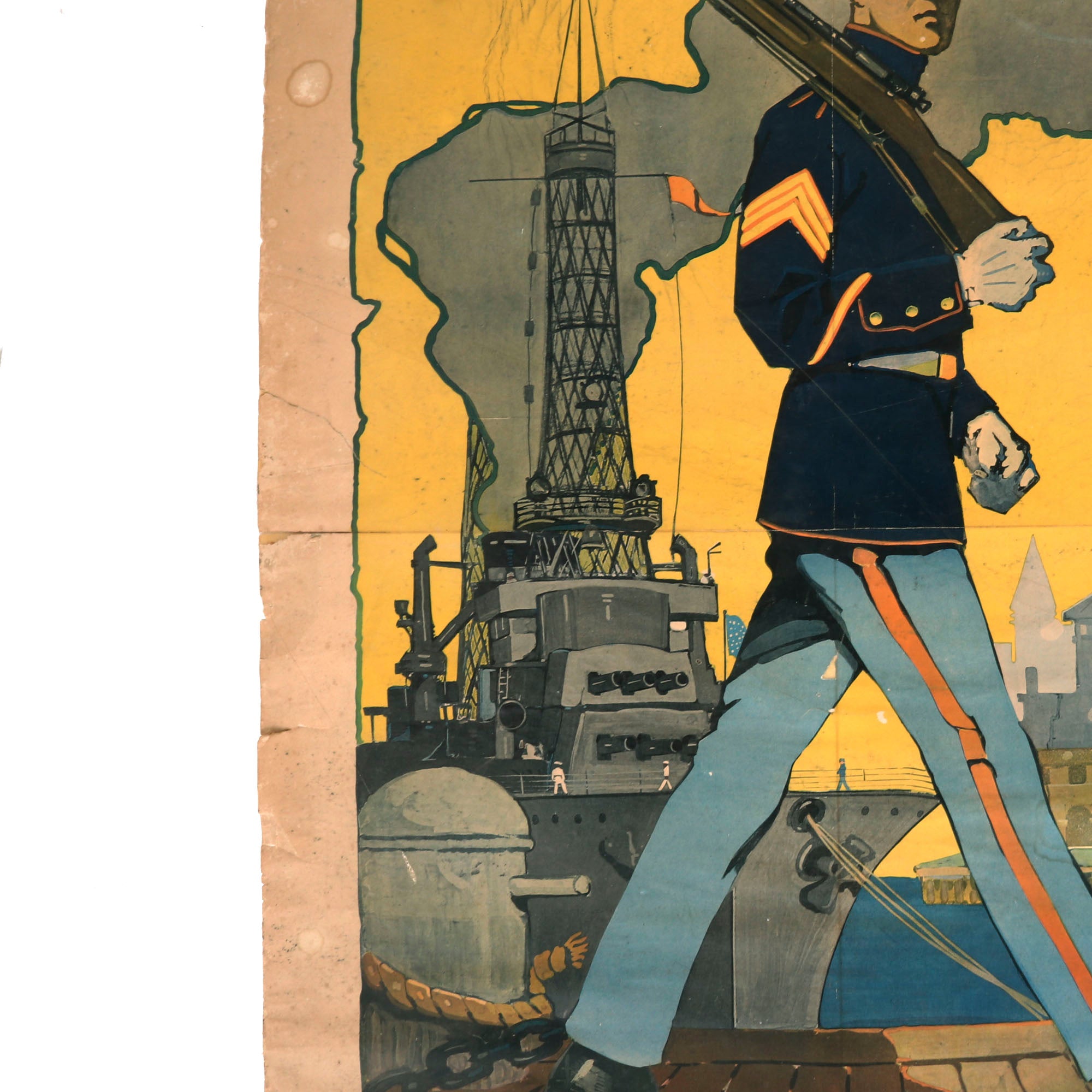 This 1917 poster with artwork by Sidney H. Riesenberg features a US Marine in Dress Blues with a rifle shouldered. He is marching along a dock with a ship, Fort and city skyline in the background.