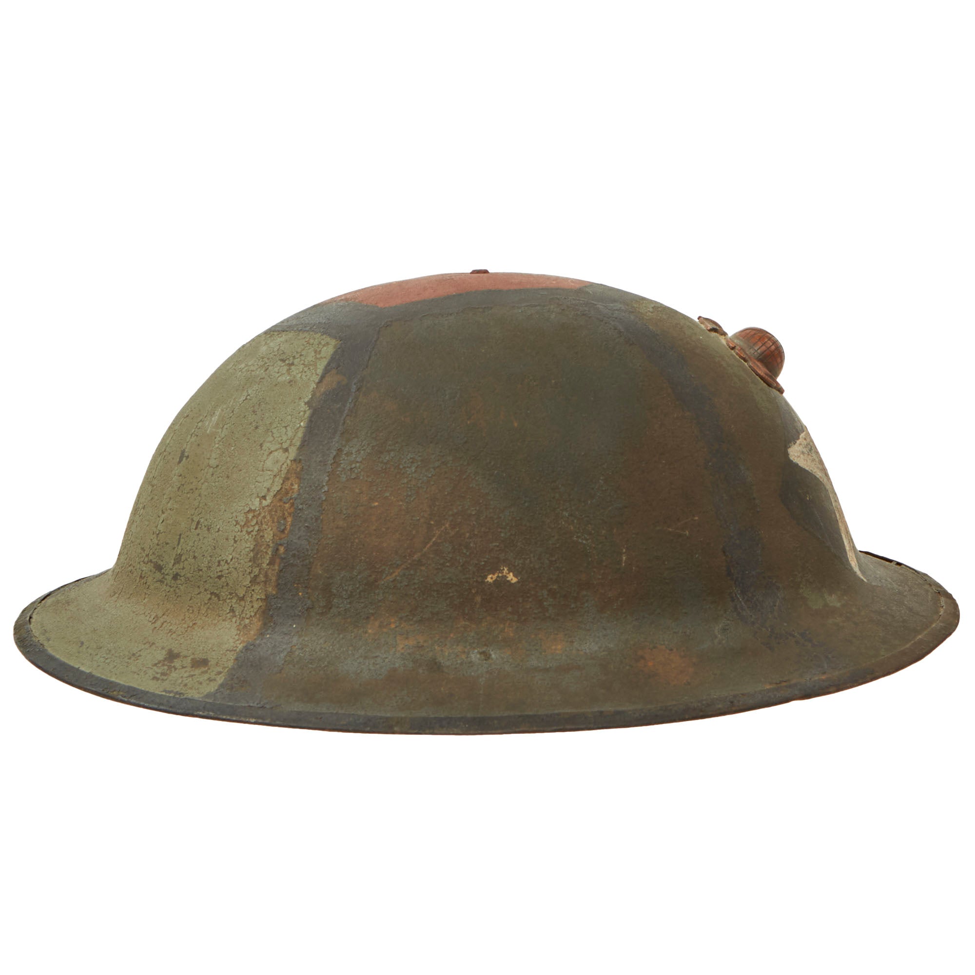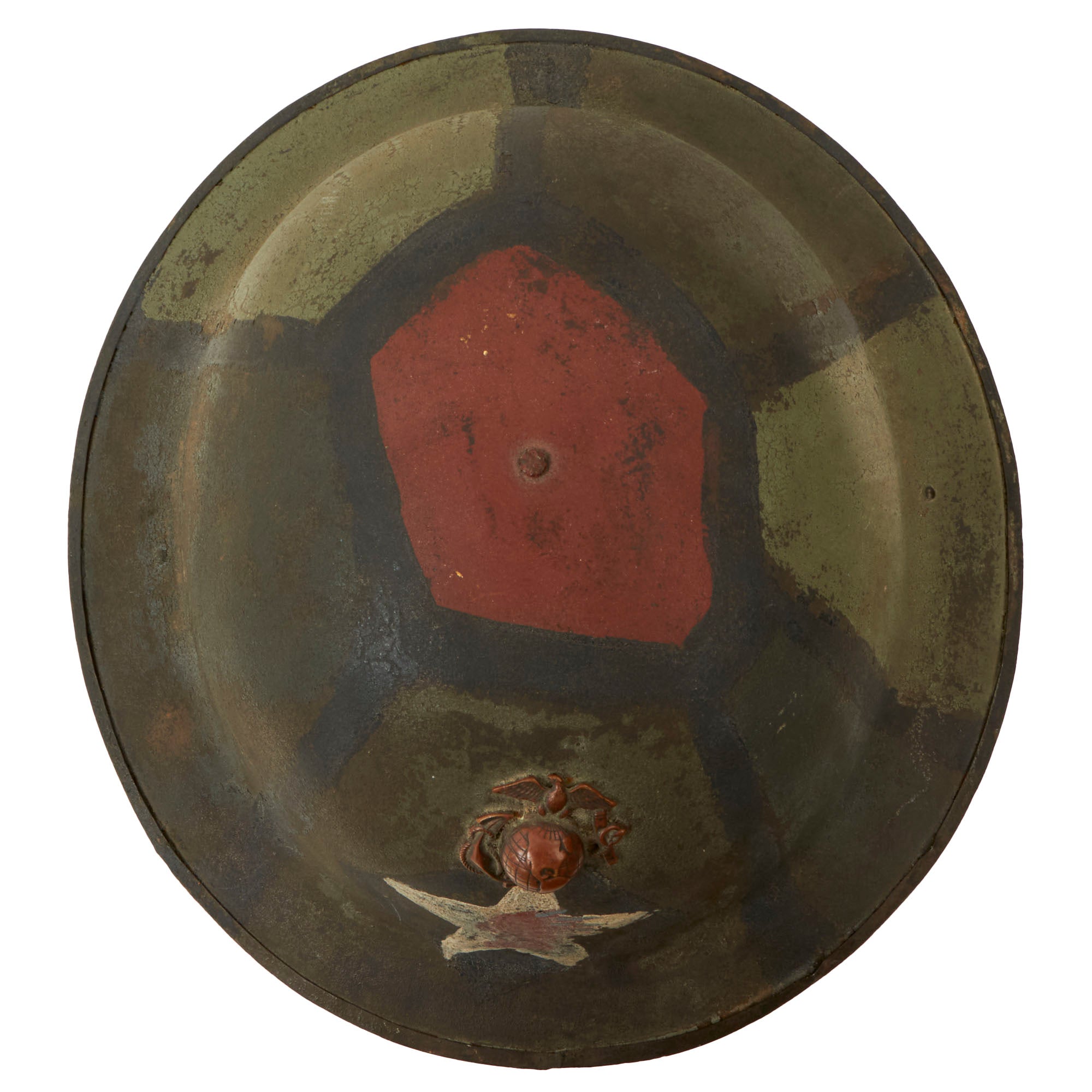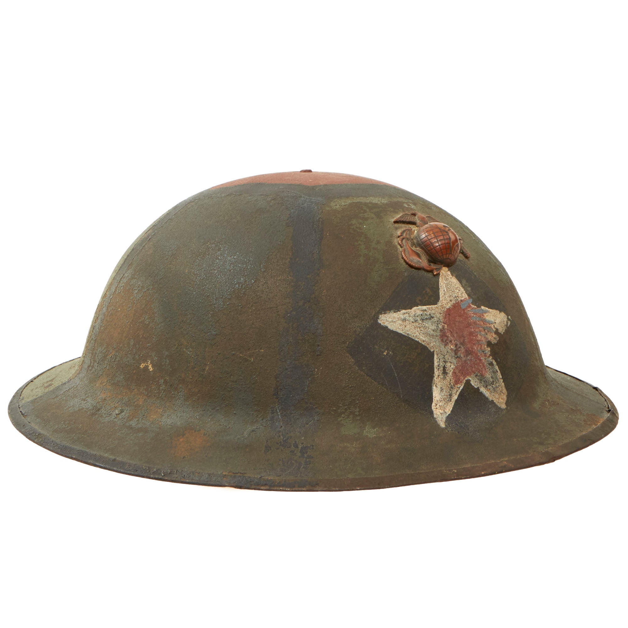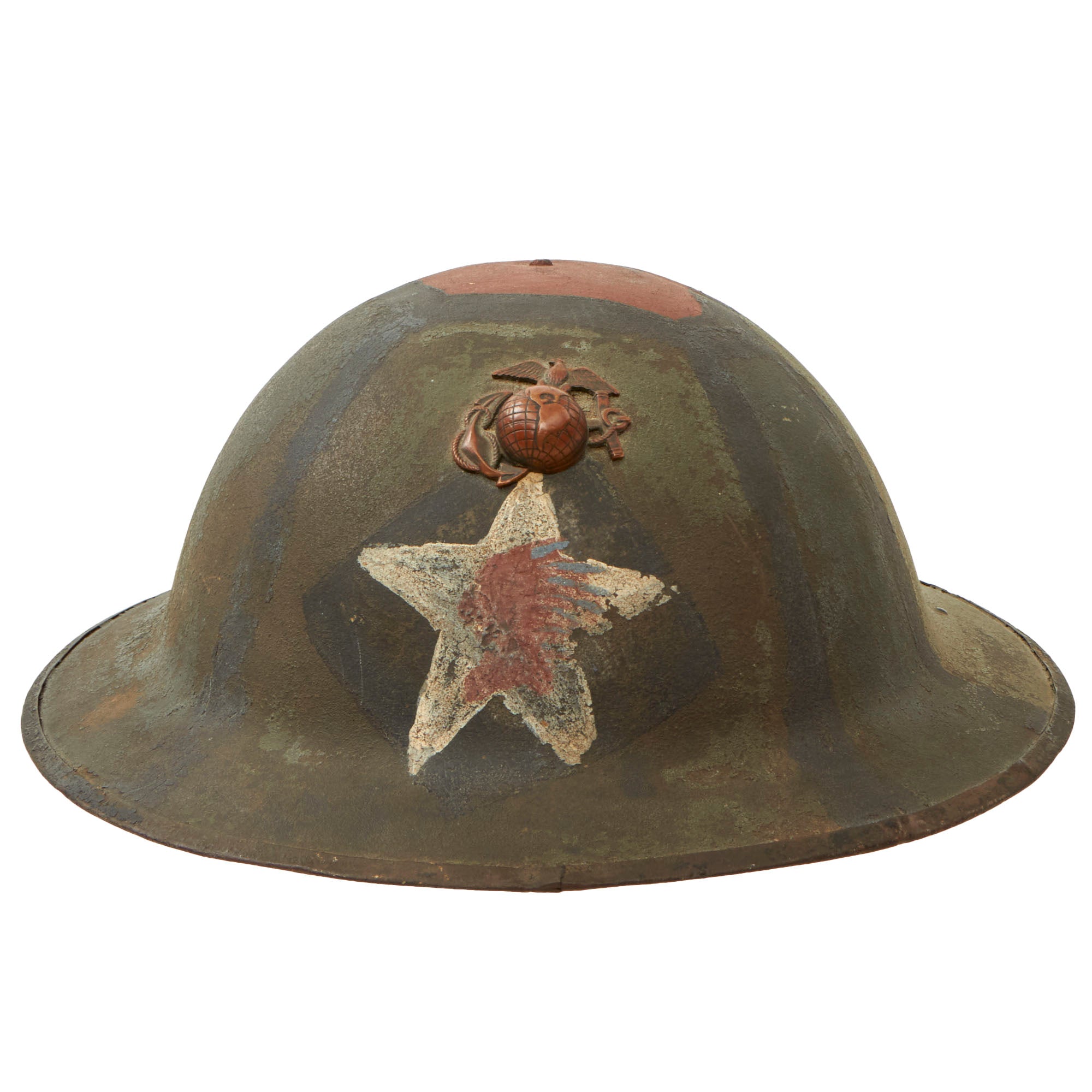 Original Item: Only One Available. This is an extremely rare example of an original U.S. Marine Corps M1917 "Doughboy" helmet, which is painted camouflage and marked on the front with a Headquarters Company, 6th Marines, 2nd Division insignia. All U.S.M.C. WWI helmets are rare, but those bearing the painted Indian Head of the 2nd Division are the most sought after, and have become increasingly scarce as time marches on.