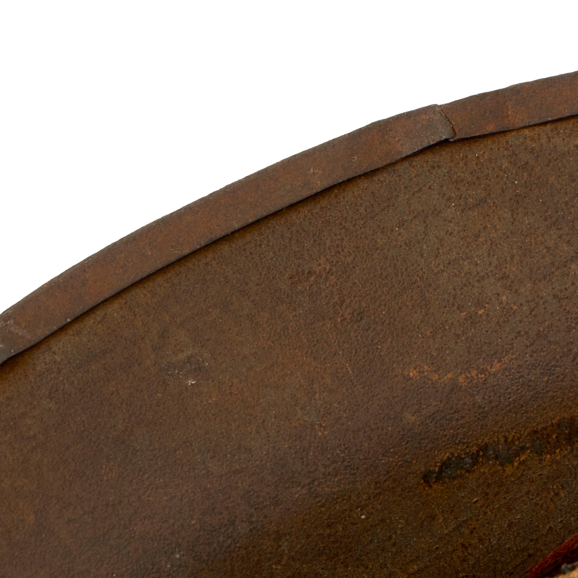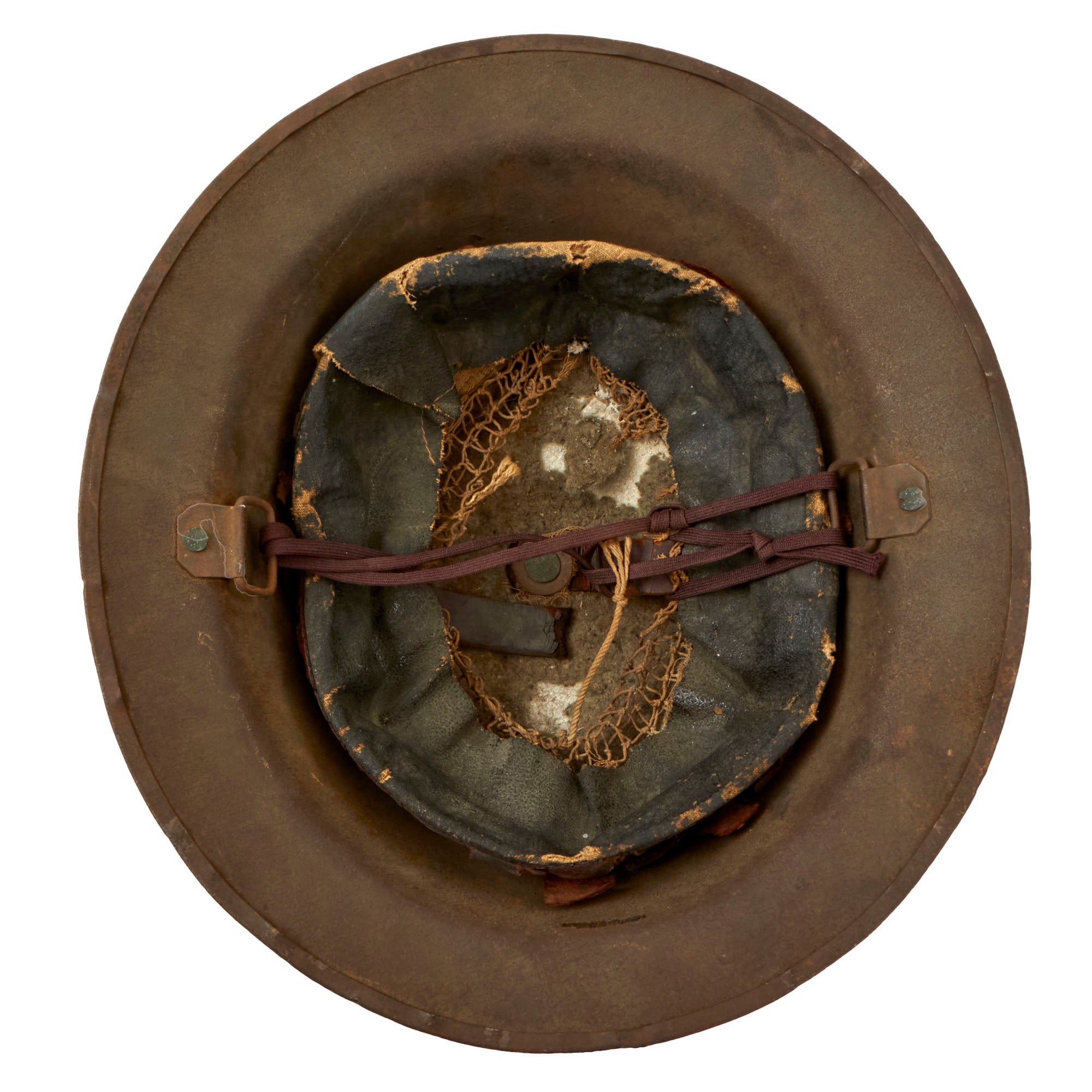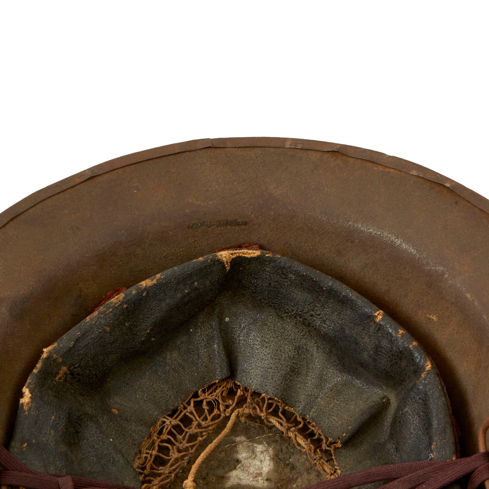 This gorgeous example retains its original liner, although it appears to be held in place by a shoelace, so the liner itself may be detached from the helmet. More importantly, the front still has a genuine blacked brass WWI USMC EGA Badge over the division insignia! The hole made for the insignia is most likely punched, but we have not attempted to remove it to check, as the paint 100% verifies this helmet as genuine. We would not recommend removing the EGA, as it’s certainly been where it is for 100+ years.
