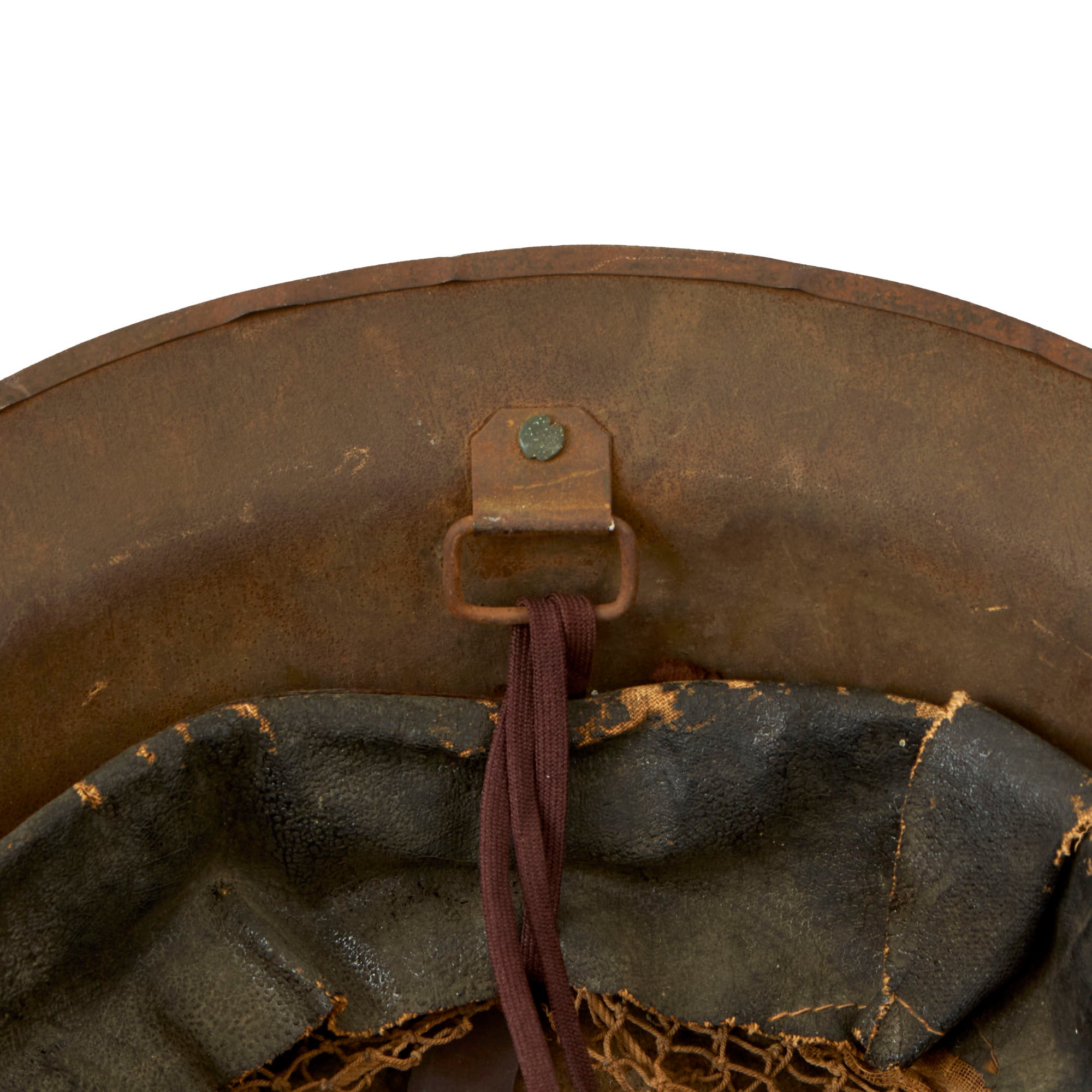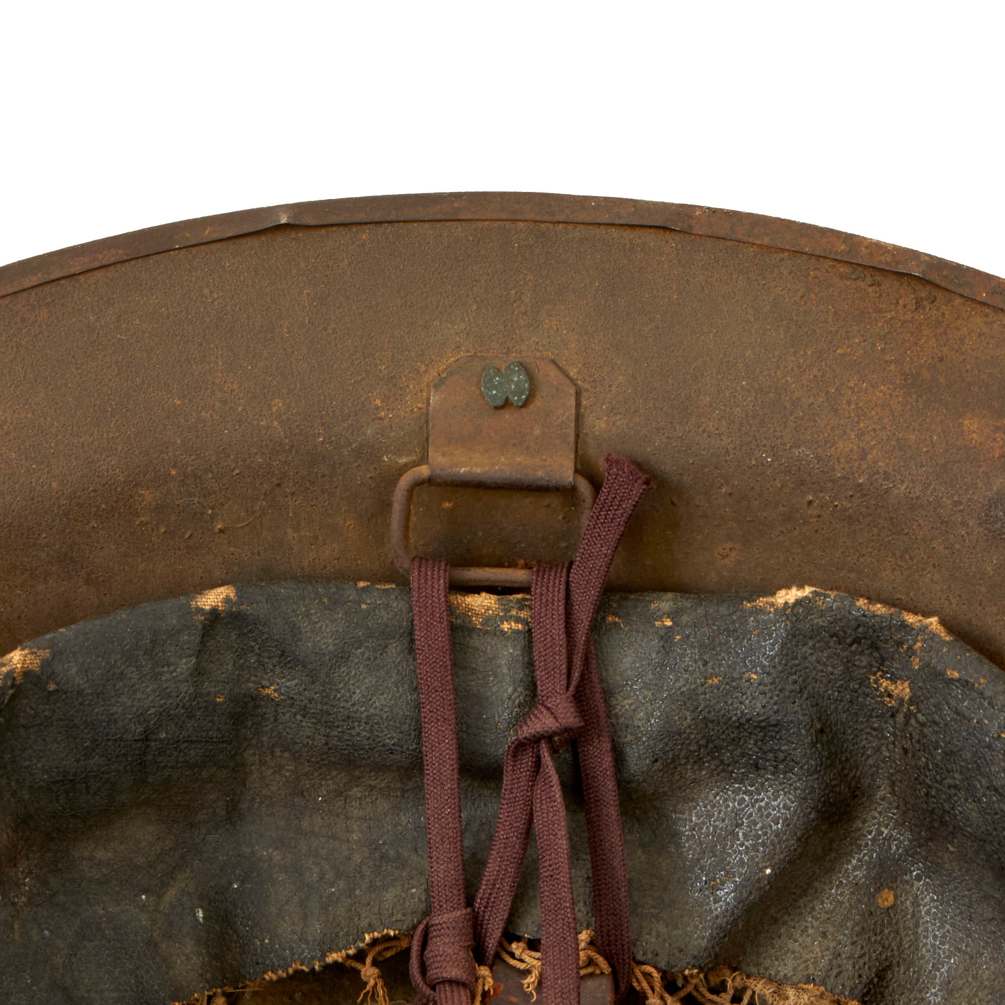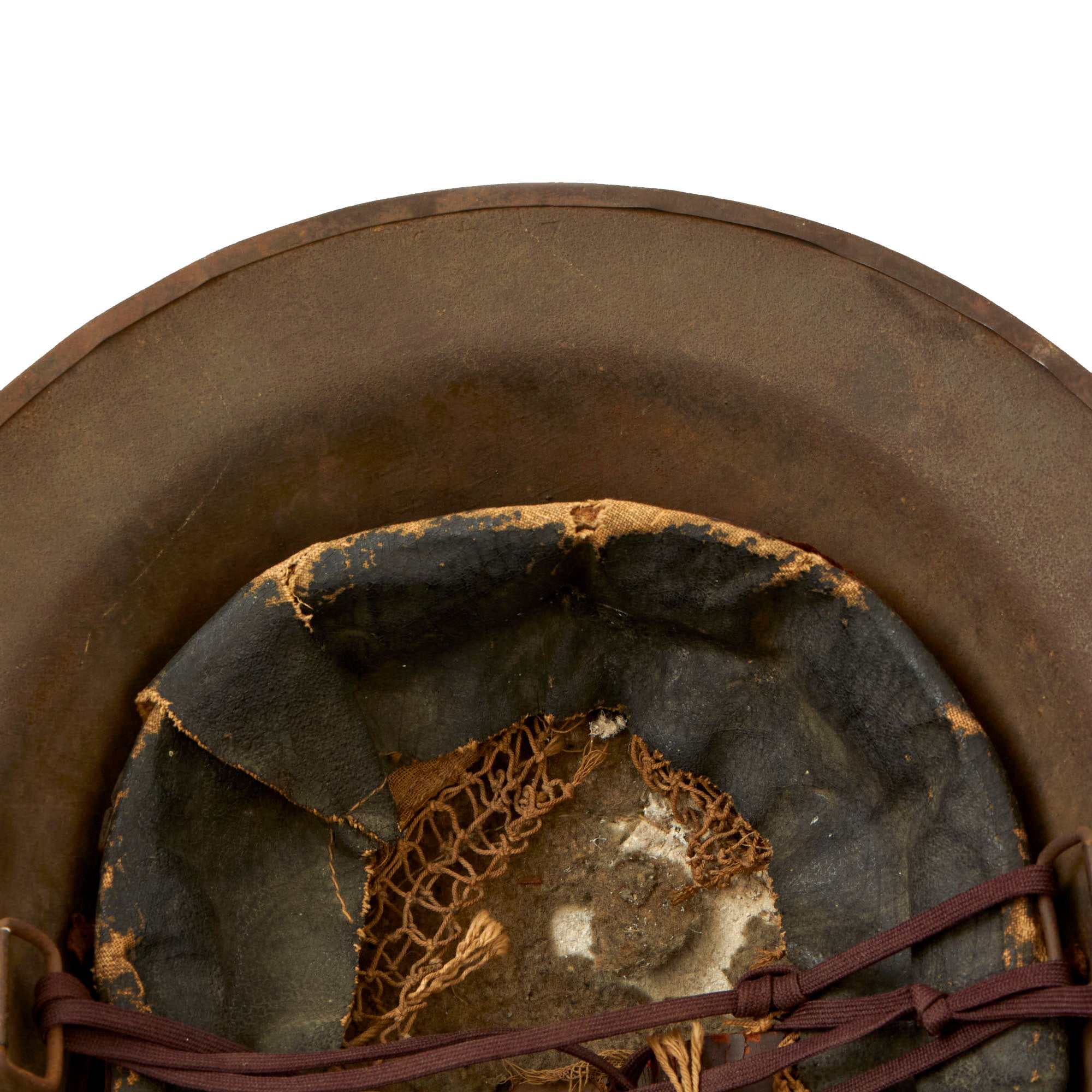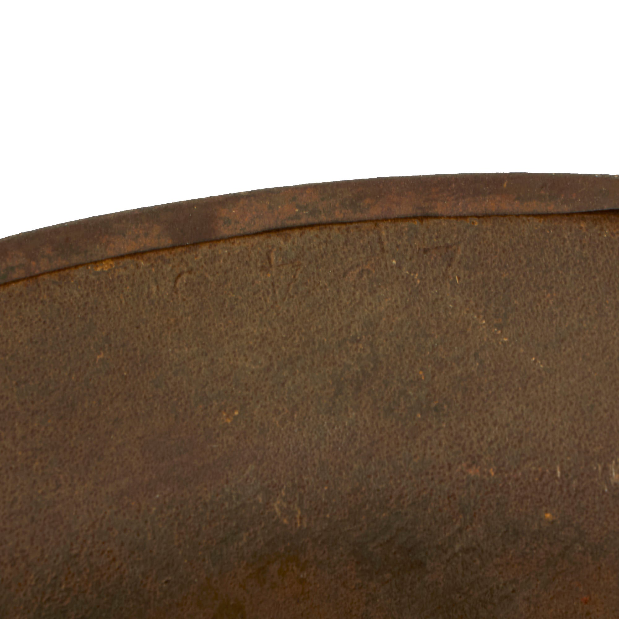 This gorgeous example retains its original liner, although it appears to be held in place by a shoelace, so the liner itself may be detached from the helmet. More importantly, the front still has a genuine blacked brass WWI USMC EGA Badge over the division insignia! The hole made for the insignia is most likely punched, but we have not attempted to remove it to check, as the paint 100% verifies this helmet as genuine. We would not recommend removing the EGA, as it’s certainly been where it is for 100+ years.