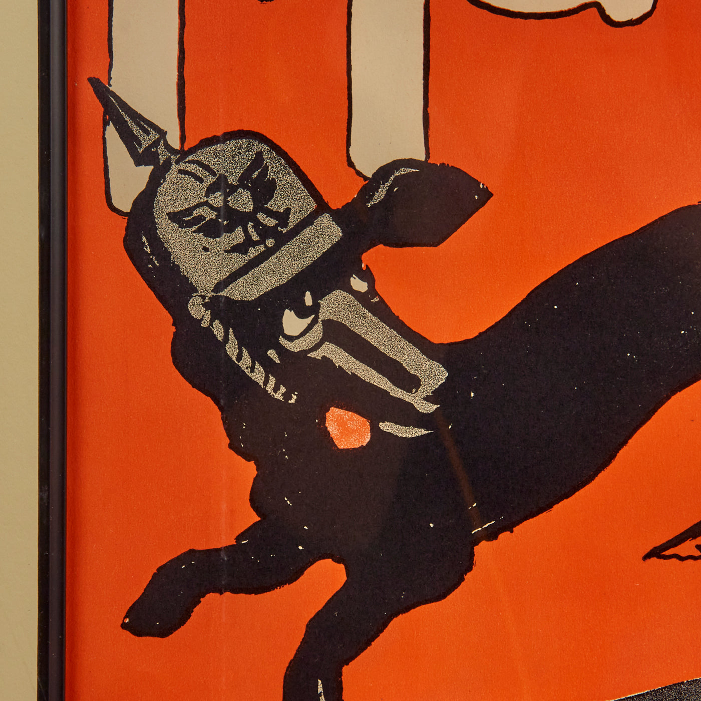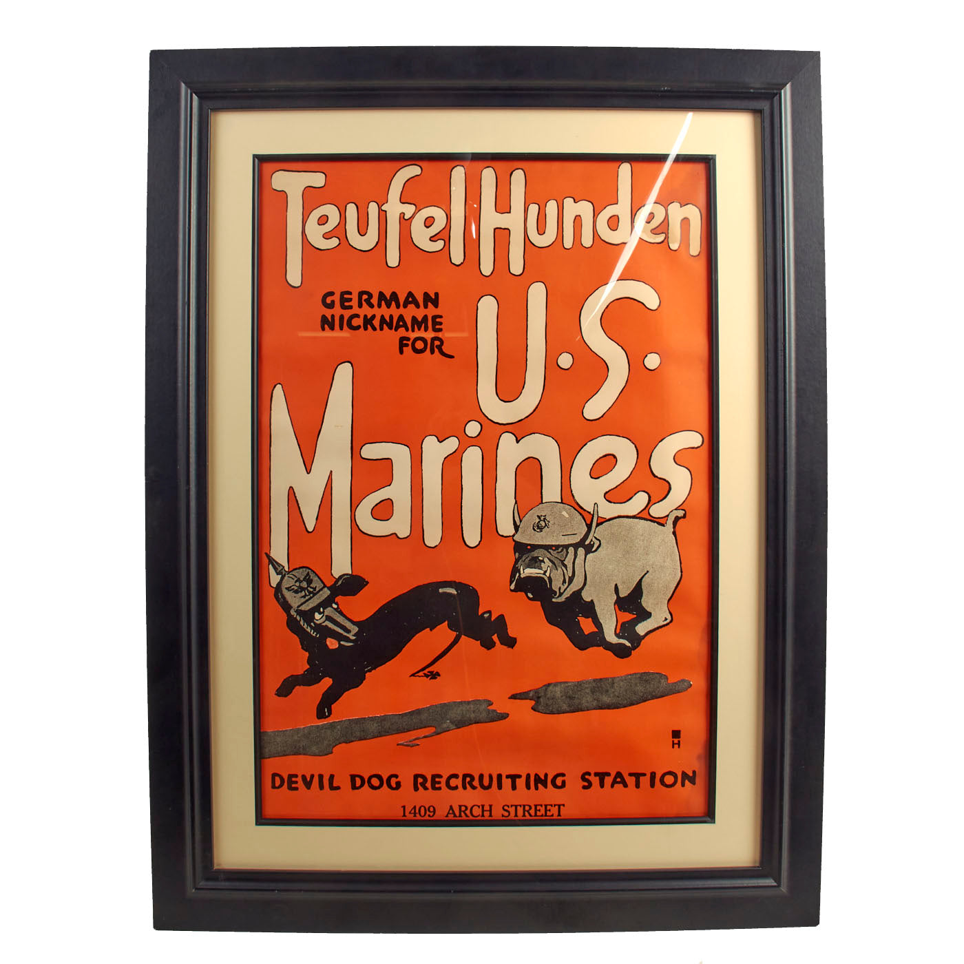 “Teufel Hunden” was one of many posters issued by the United States government during World War I to encourage support of the war. This poster was created as a military recruitment and enlistment poster for the Marine Corps in 1917. The name “Teufel Hunden” stated on the poster refers to a term German soldiers would use when describing World War I American Marines. “Teufel Hunden” translates to “Devil's Dogs” and was a popular nickname for the Marines and many U.S. newspaper headlines adopted it. Other nicknames that were used to describe Marines such as “Leatherneck” and “Jarhead” but these nicknames were not adopted in popular media. The term “Devil Dog” was so well-liked and embraced by the Marines that eventually an assault ship was named after it. This poster includes one of the earliest published usages of the term and helped spread its popularity.