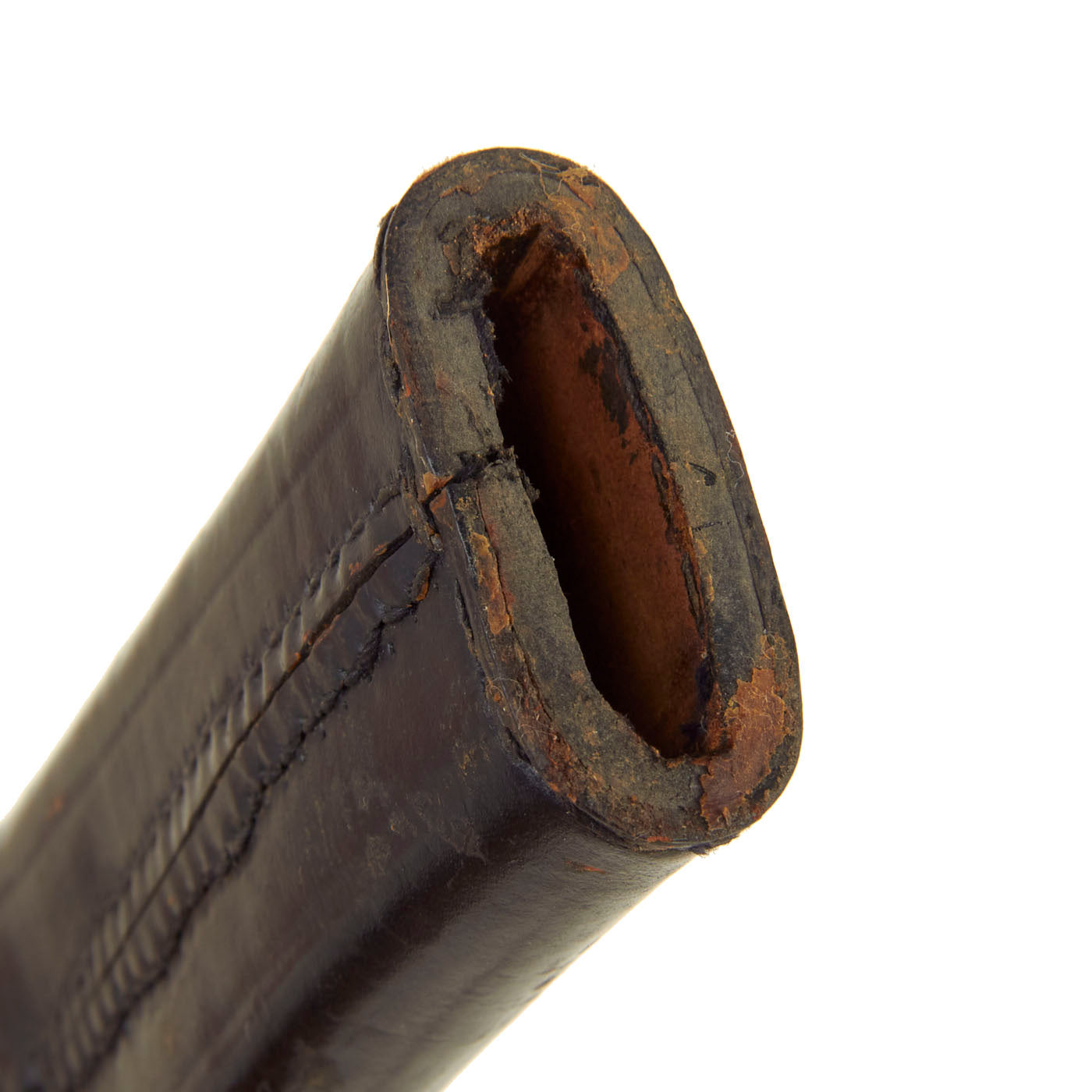 This example is in exceptional condition, one we will most certainly never see again! This Cutlass and scabbard is in unissued, near mint condition and retains 99 percent of all of the original blackened finish. There are some areas on the leather scabbard where the finish has rubbed off from years of storage, but it is still in incredible condition.