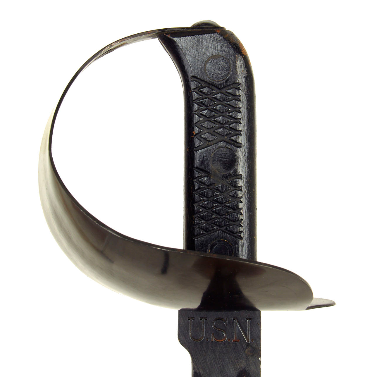 Along with the distinctive clipped point, full half basket cup, and wooden cross-hatched grip the only other identifying mark on this cutlass are the large initials U.S.N. found on the obverse ricasso.
