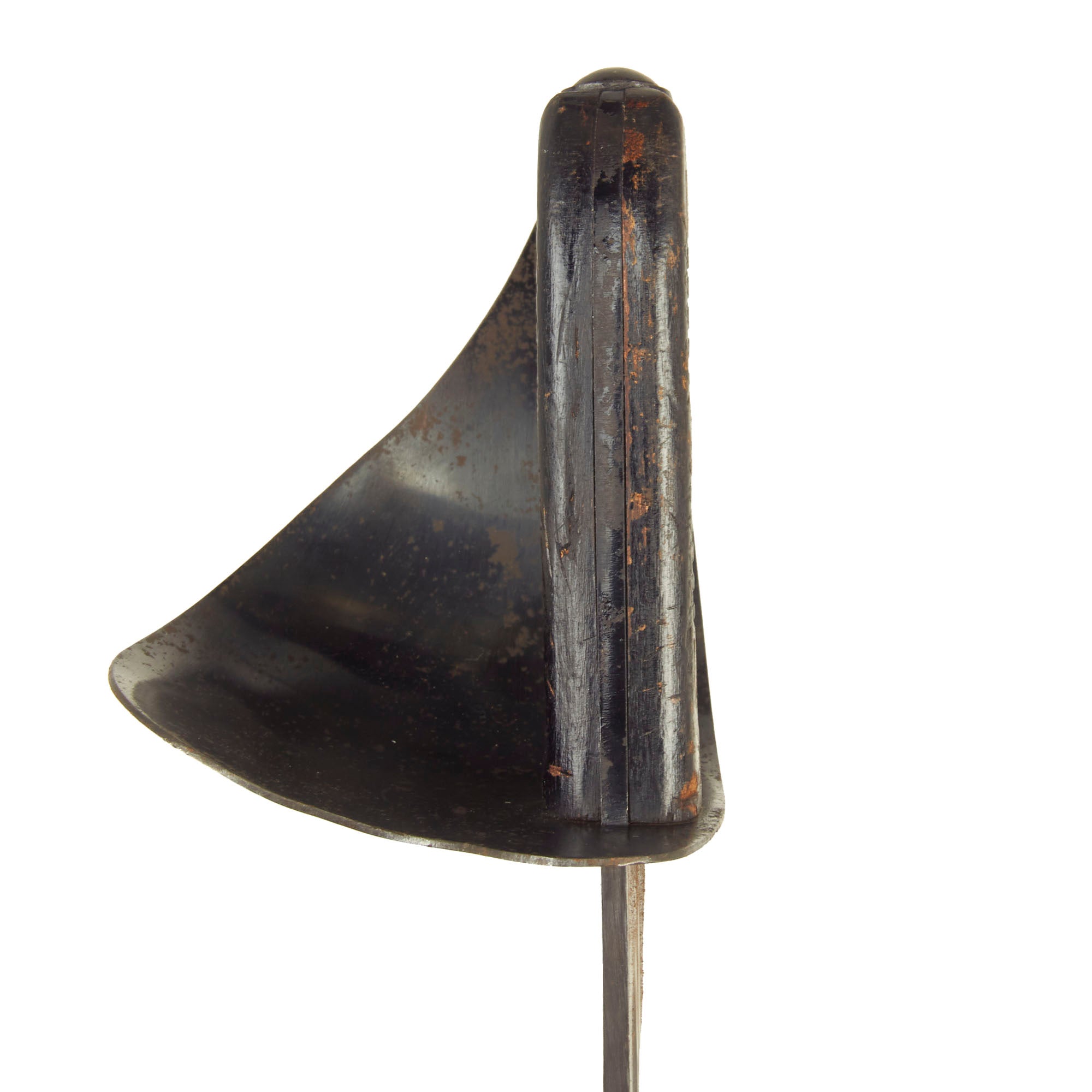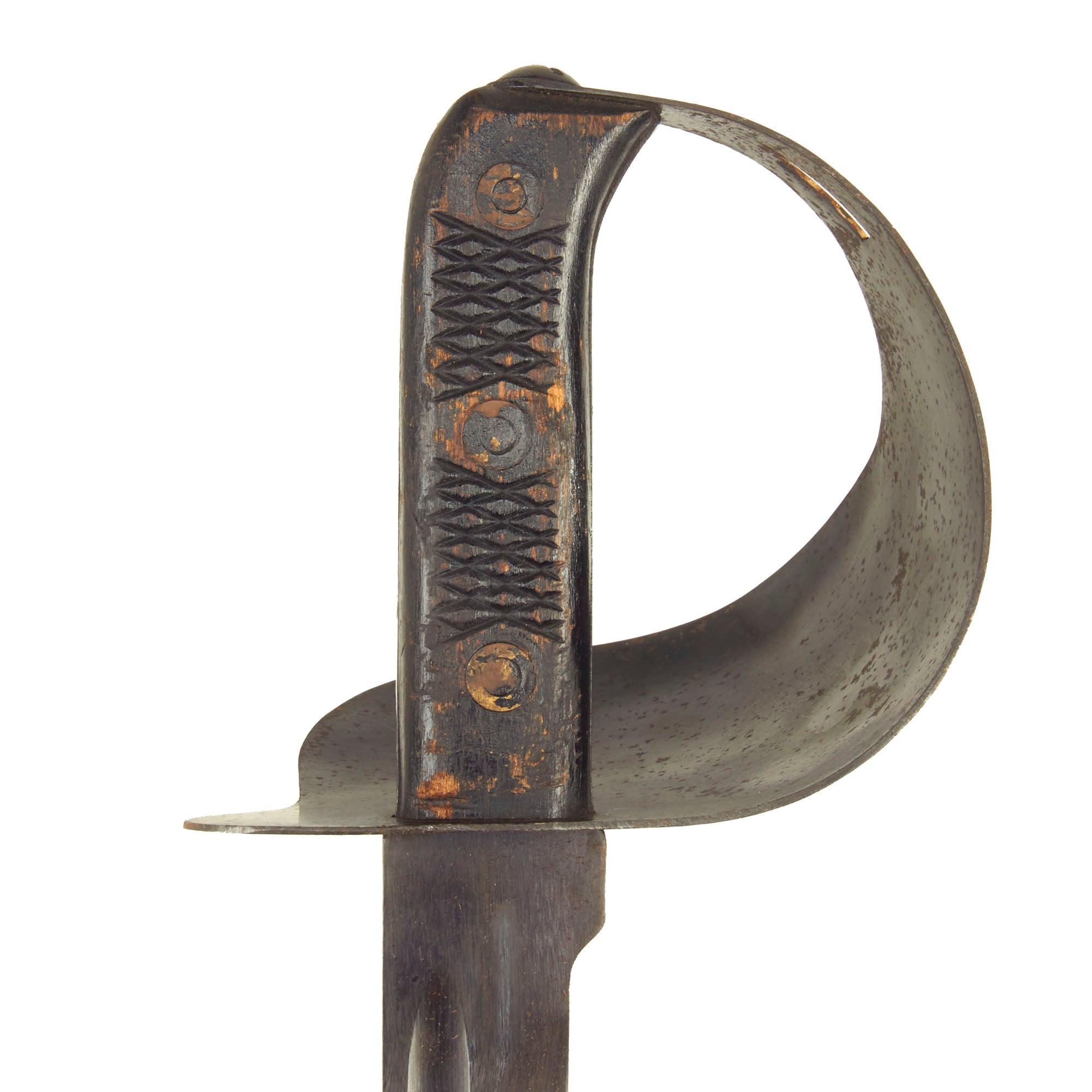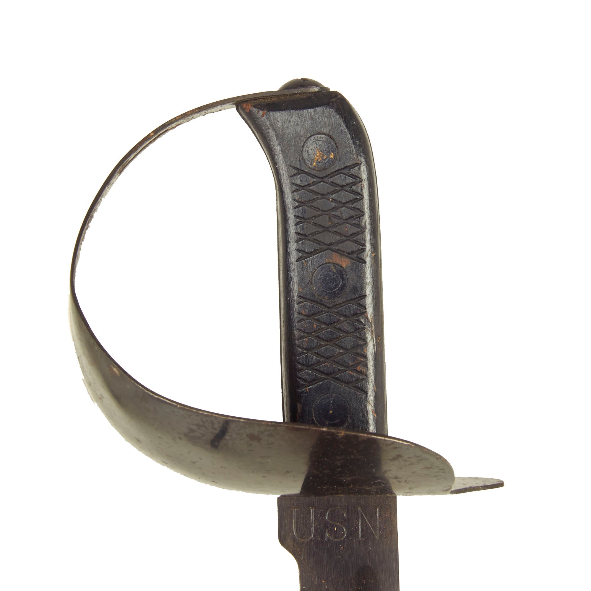 Along with the distinctive clipped point, full half basket cup, and wooden cross-hatched grip the only other identifying mark on this cutlass are the large initials U.S.N. found on the obverse ricasso.
