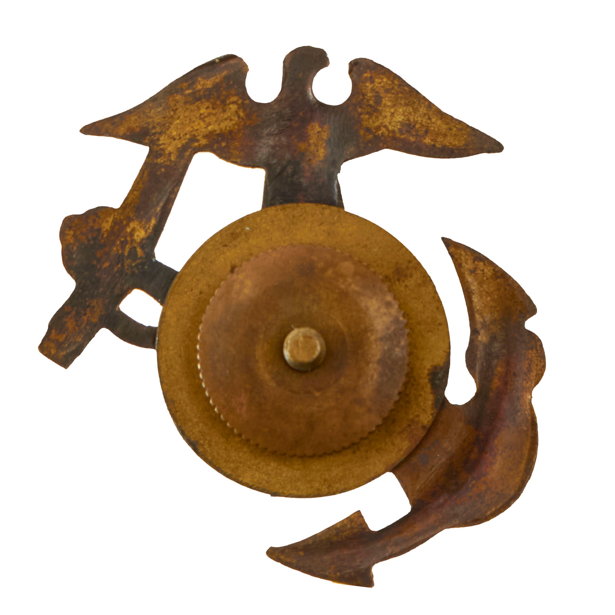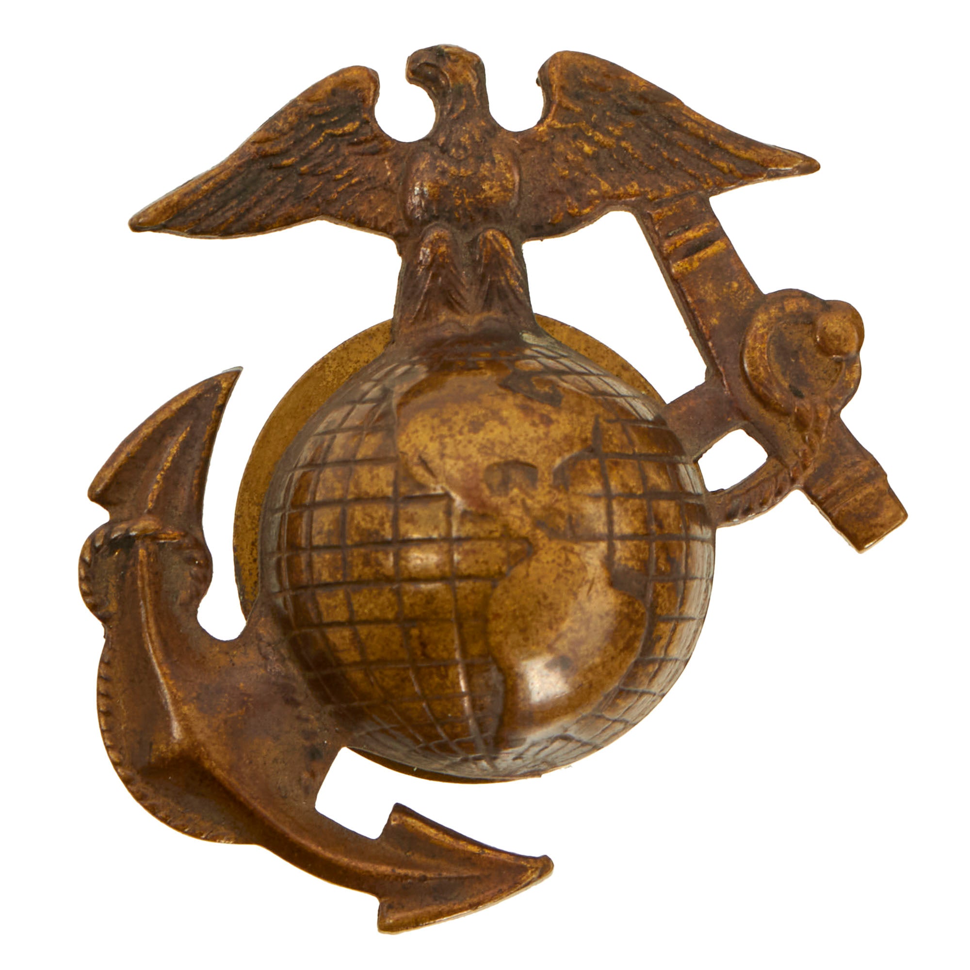 Original Item. Only One Available. This is a gorgeous example of a WWI Period Marine Corps EGA Device. EGA stands for Eagle, Globe, Anchor, the three parts that make up the insignia. What specifies this example as World War I period is the globe having both latitude and longitude lines. After World War I, this was changed to just latitude lines. This example has a gorgeous brown color, with a great patina.