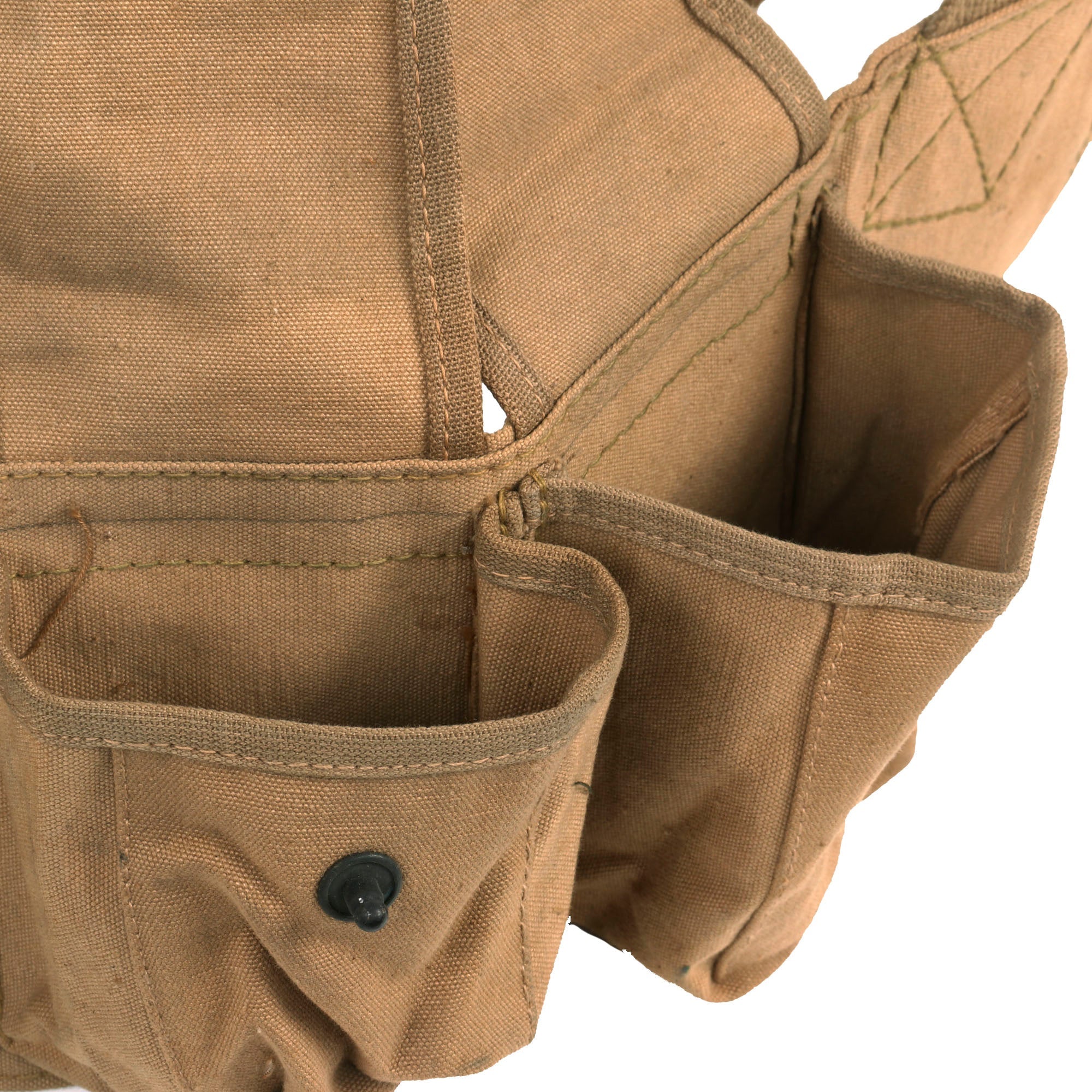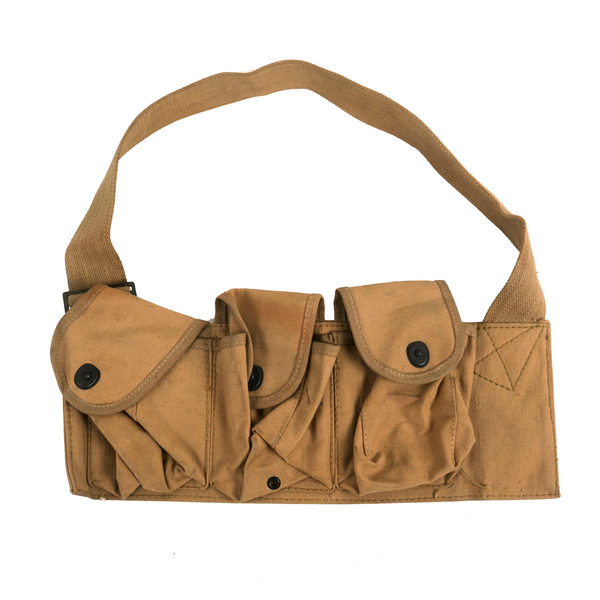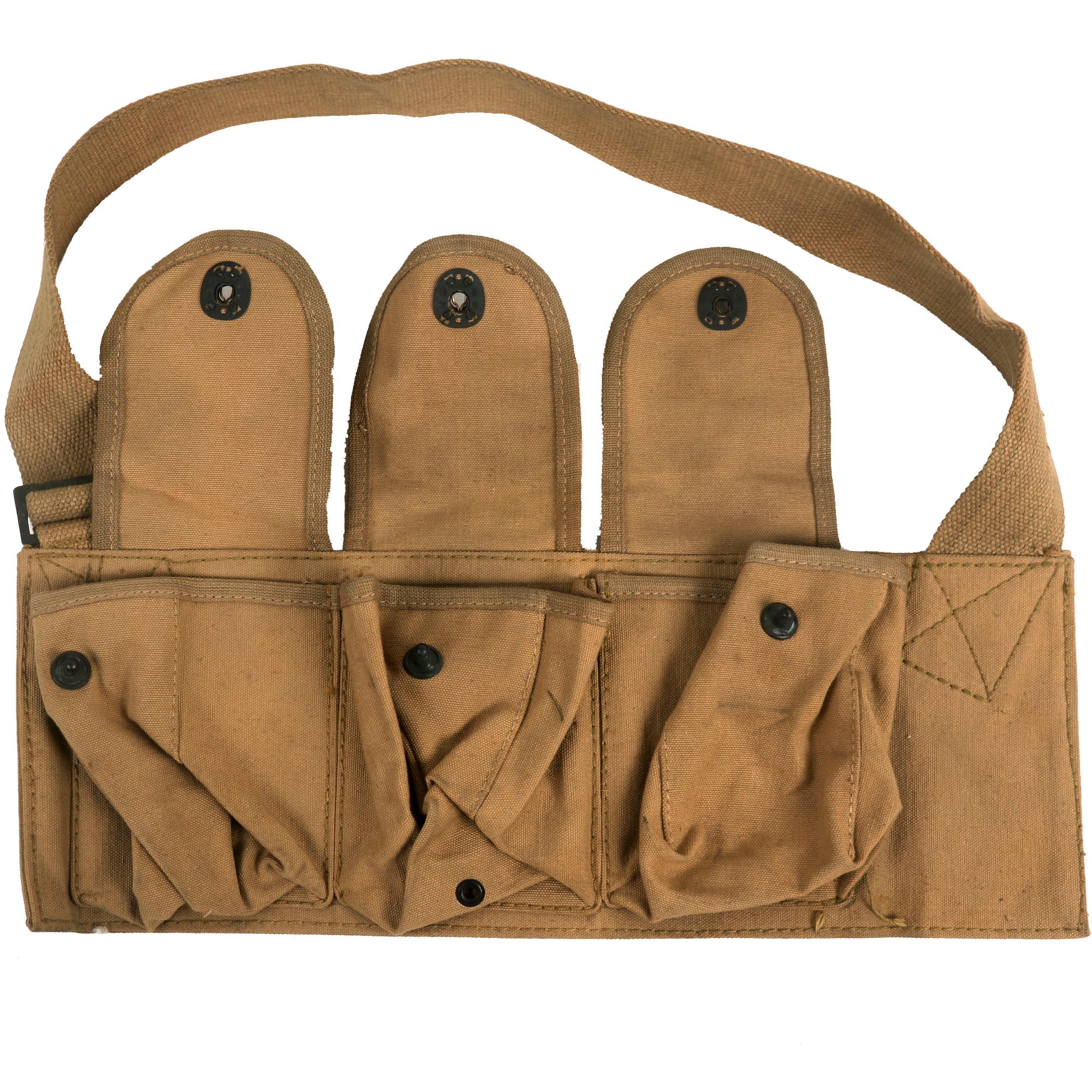 The bandolier is in excellent condition, with no noticeable tears or stains that would detract from its appeal to collectors or enthusiasts. The stitching is tight and secure, and the material is robust, ensuring that the item is both durable and long-lasting. The bandolier is designed to hold at least 6 magazines, and its left-side orientation indicates that there would have also been a right side to complete the set.
