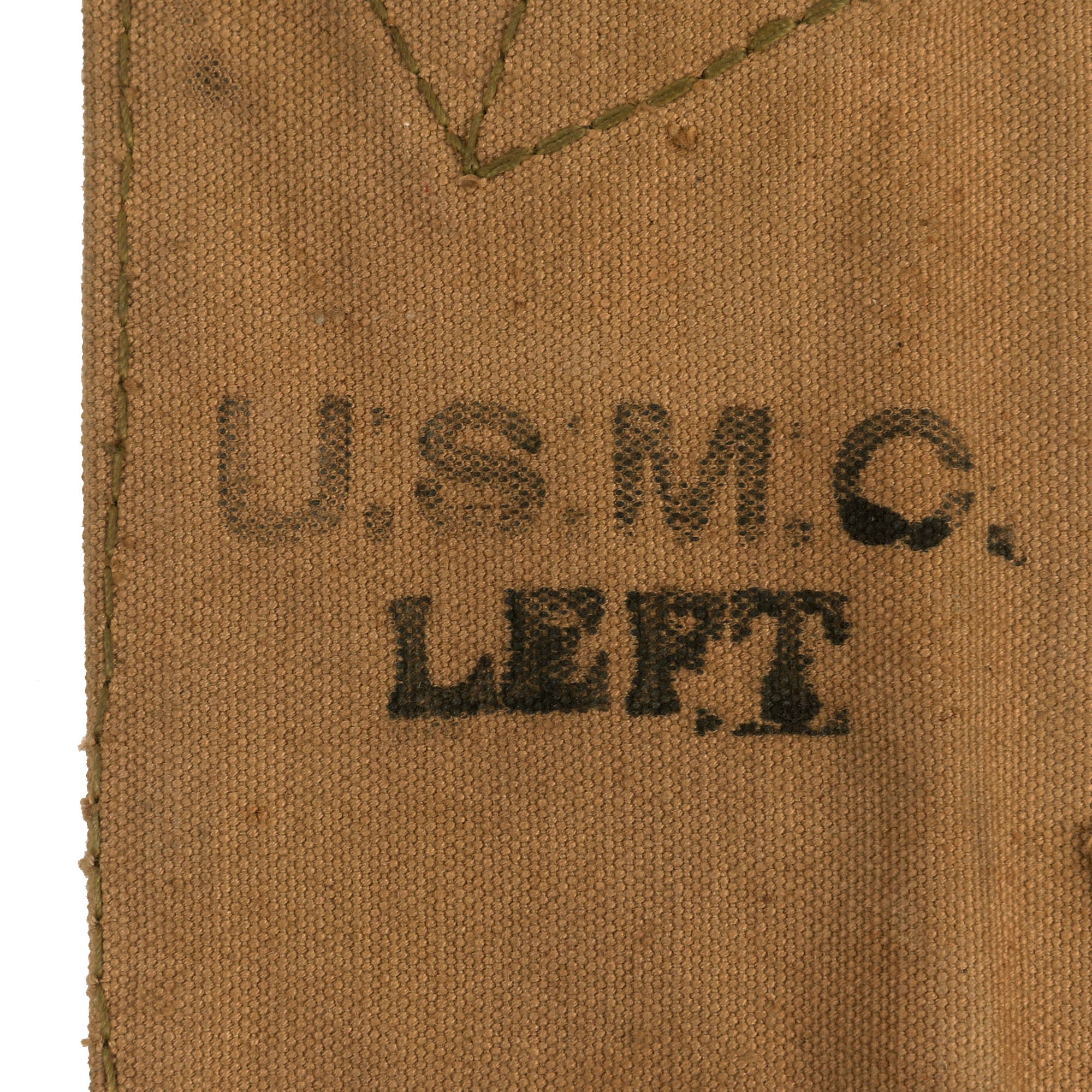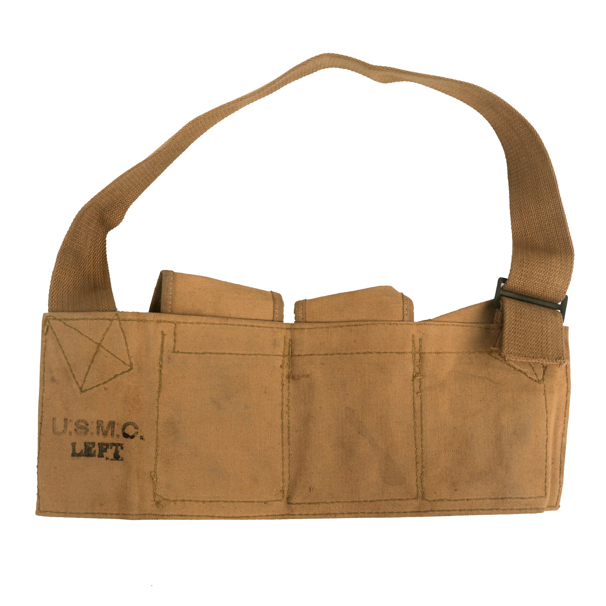 Original Item: Only One Available. This unissued US Marine Corps left side magazine bandolier is a remarkable example that was designed for the 1918A2 BAR Browning Automatic Rifleman. The pouch is not marked with any particular identification or date except for "USMC / LEFT", which indicate the military branch and the side of the bandolier where it should be worn.