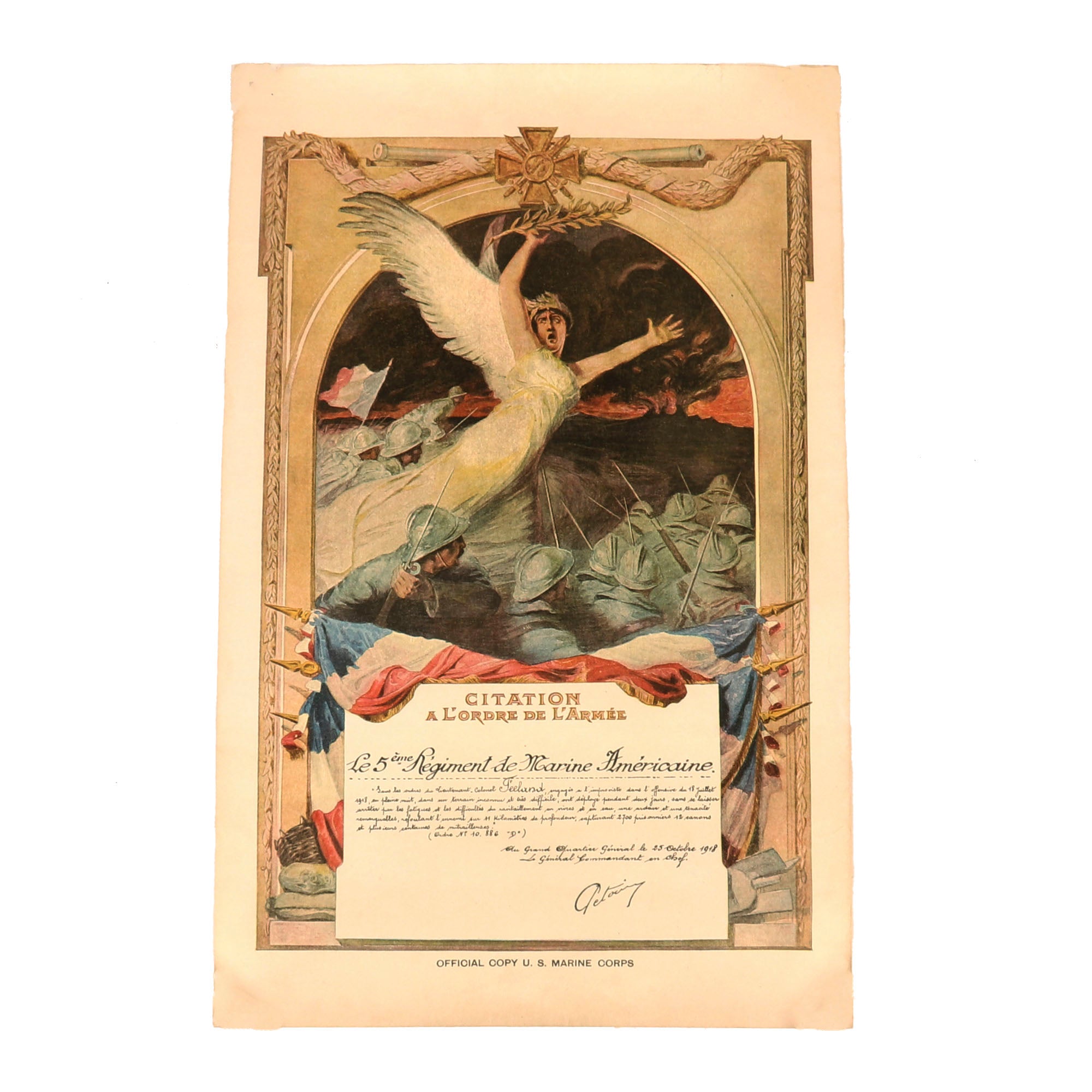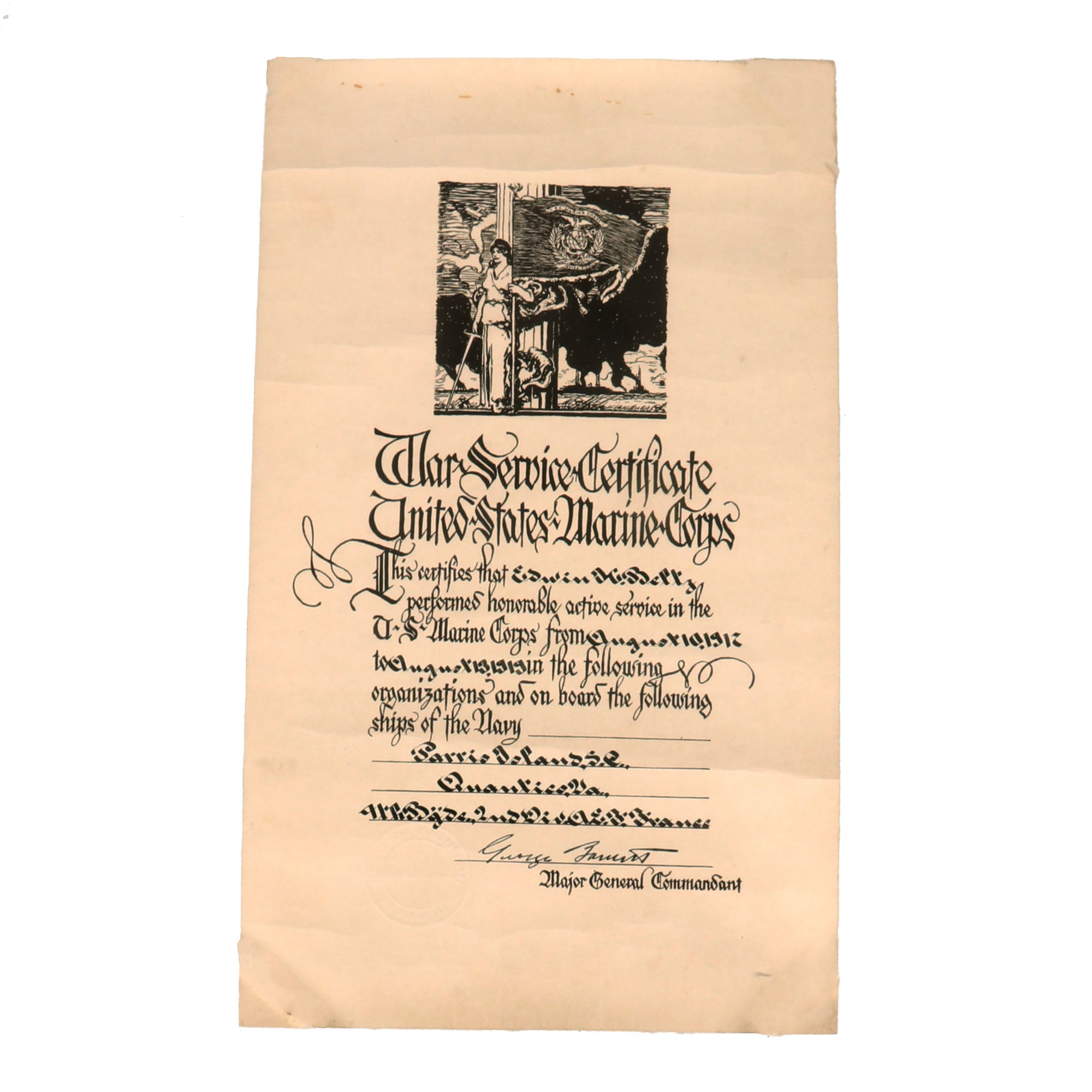Original Items. One-of-a-Kind. This is an extremely scarce set of three documents including a Wound Certificate, Marine War Service Certificate, and French Citation certificate named to Corporal Edwin H. Beltz, 8th Company, 5th Regiment, USMC, 2nd Division. Beltz was wounded severely on October 4th, 1918, by a gunshot wound through both of his hands. The set comes in its original shipping tube addressed to Beltz, which is unbelievably scarce to find all together.