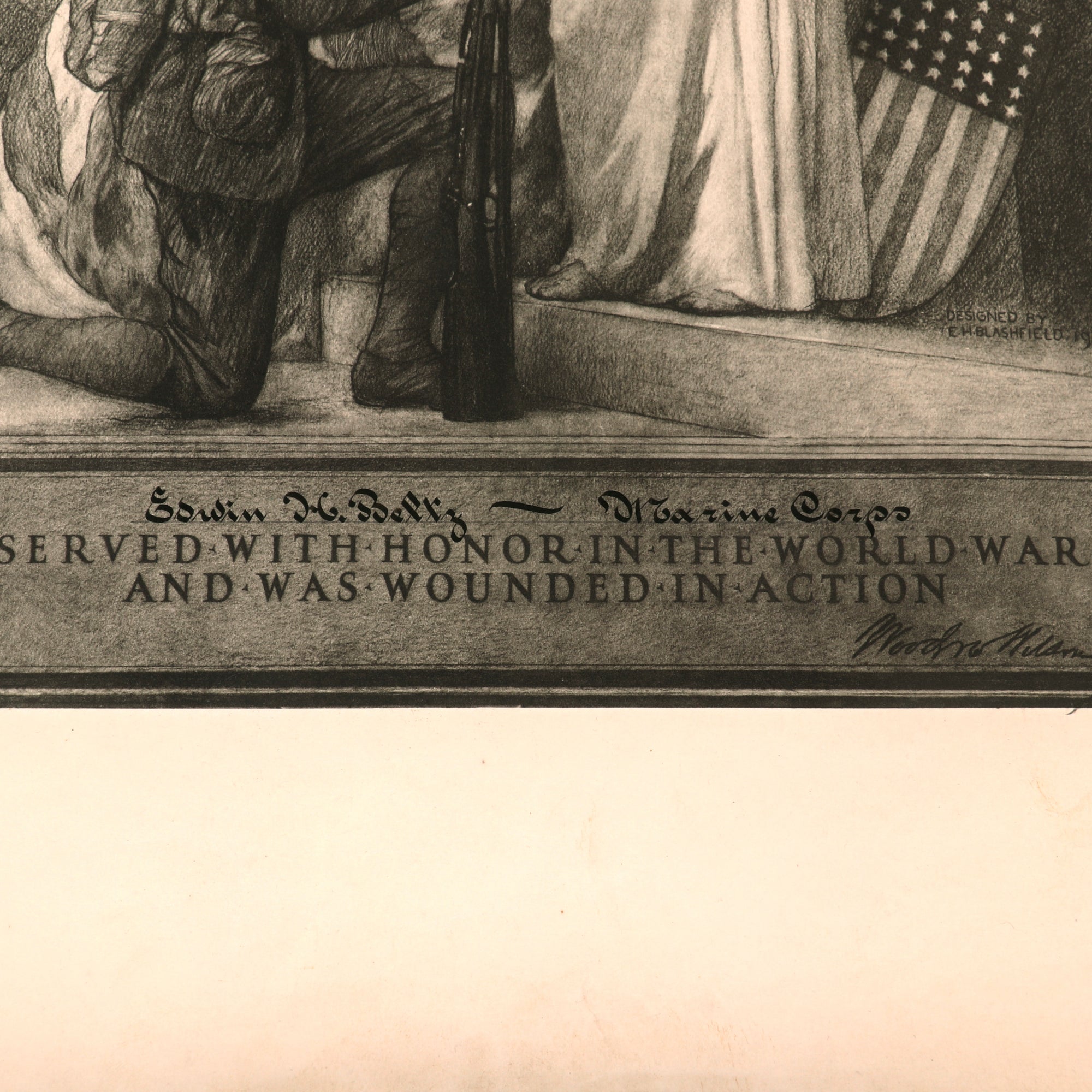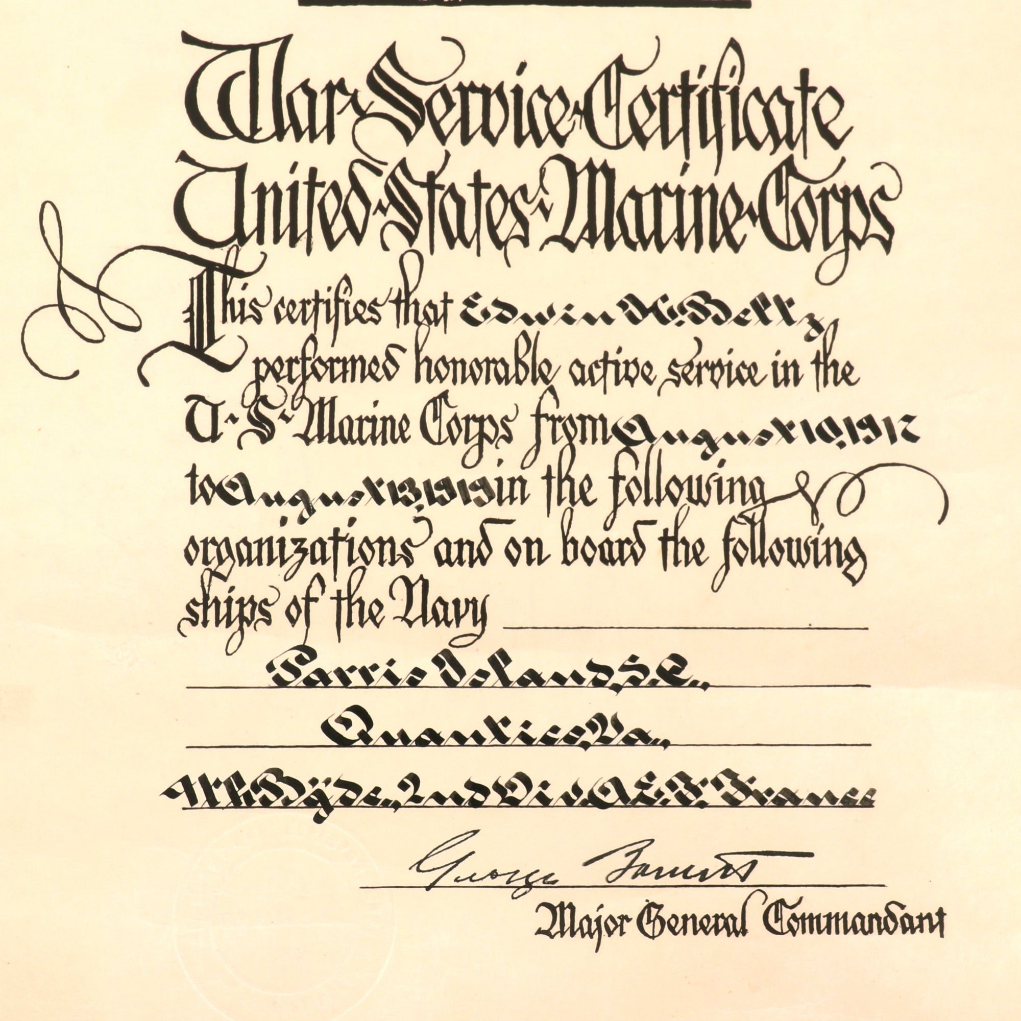 Edwin Herman Beltz was born on November 7th, 1896 in Oneida, New York. On August 7th, 1917, Beltz enlisted in the U.S. Marine Corps. He was assigned to the 12th Company, 5th Regiment on December 7th, 1917. He arrived in France on December 31st, 1917, being transferred to the 17th Company in January. Beltz participated in every bit of combat the 5th Regiment saw, including the Battle of Belleau Wood, the Toulon Sector, the Aisne Defensive, Chateau Thierry, Aisne-Marne, Marbache, St. Mihiel, Champagne, and the Meuse-Argonne Offensive. He was wounded severely on October 4th, 1918, during the Battle of Blanc Mont. He went into Germany with the Army of Occupation and returned to the U.S. on July 25th, 1919. He was awarded the French Fourragere and was discharged on August 13th, 1919.