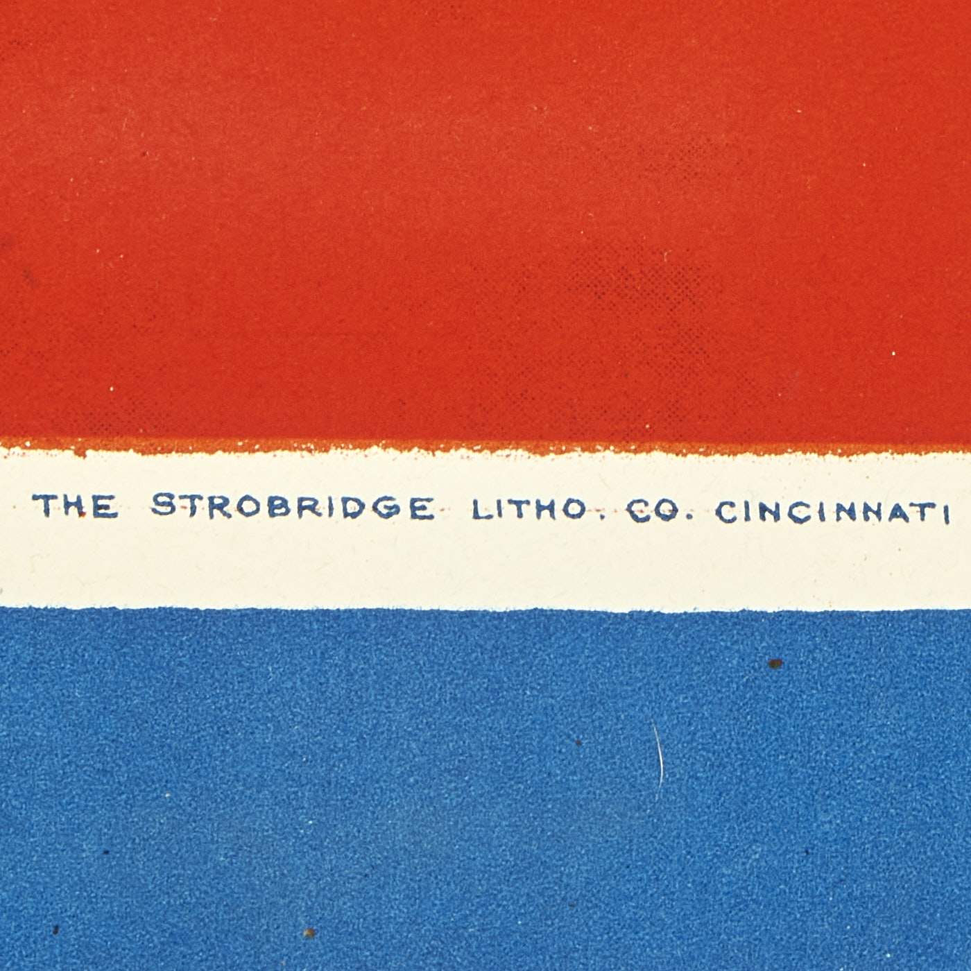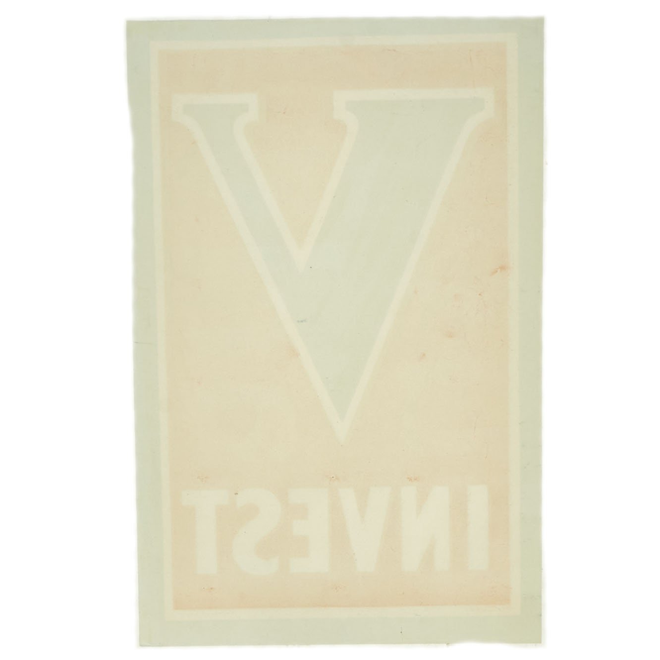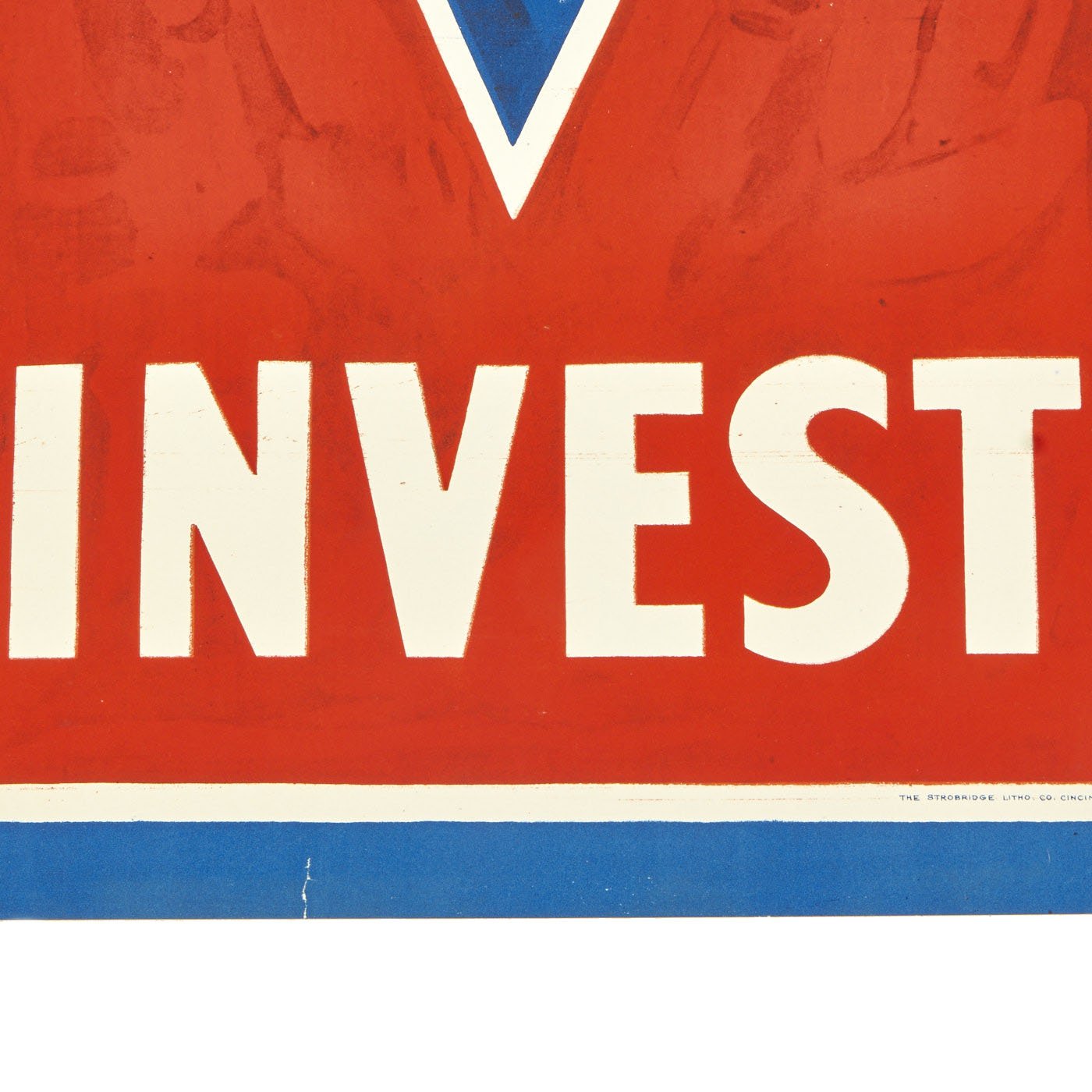 Original Item: Only One Available. WWI Liberty Loan propaganda poster featuring a bright design with a blue V for victory sign against a red background with bold white lettering below. Published by the United States Government to encourage people to help win the war by investing in victory bonds and liberty loans. Printed by the Strobridge Lithograph Company of Cincinnati, Ohio. Measures 21” x 33”. Excellent original condition, with bright, vibrant, color and crisp edges. Only detraction is one small tear, approximately 1” long on the bottom edge.