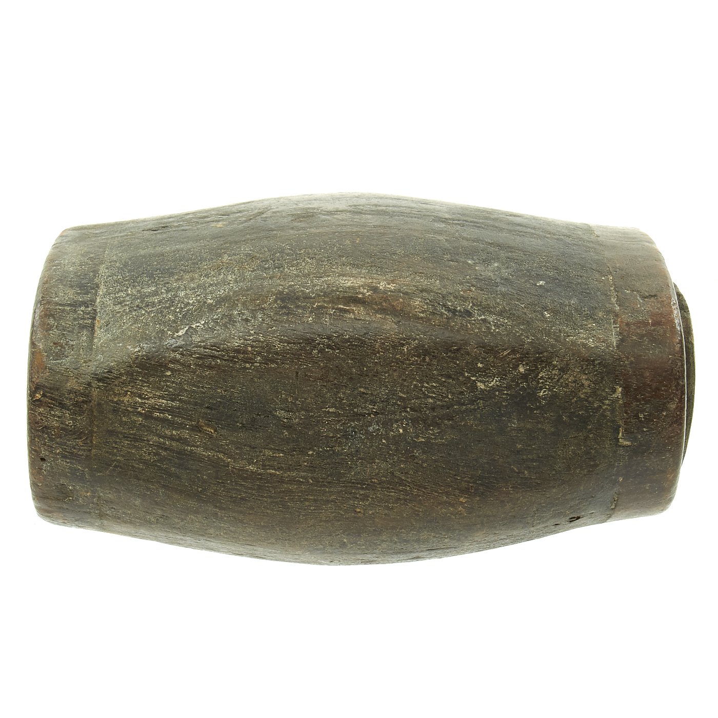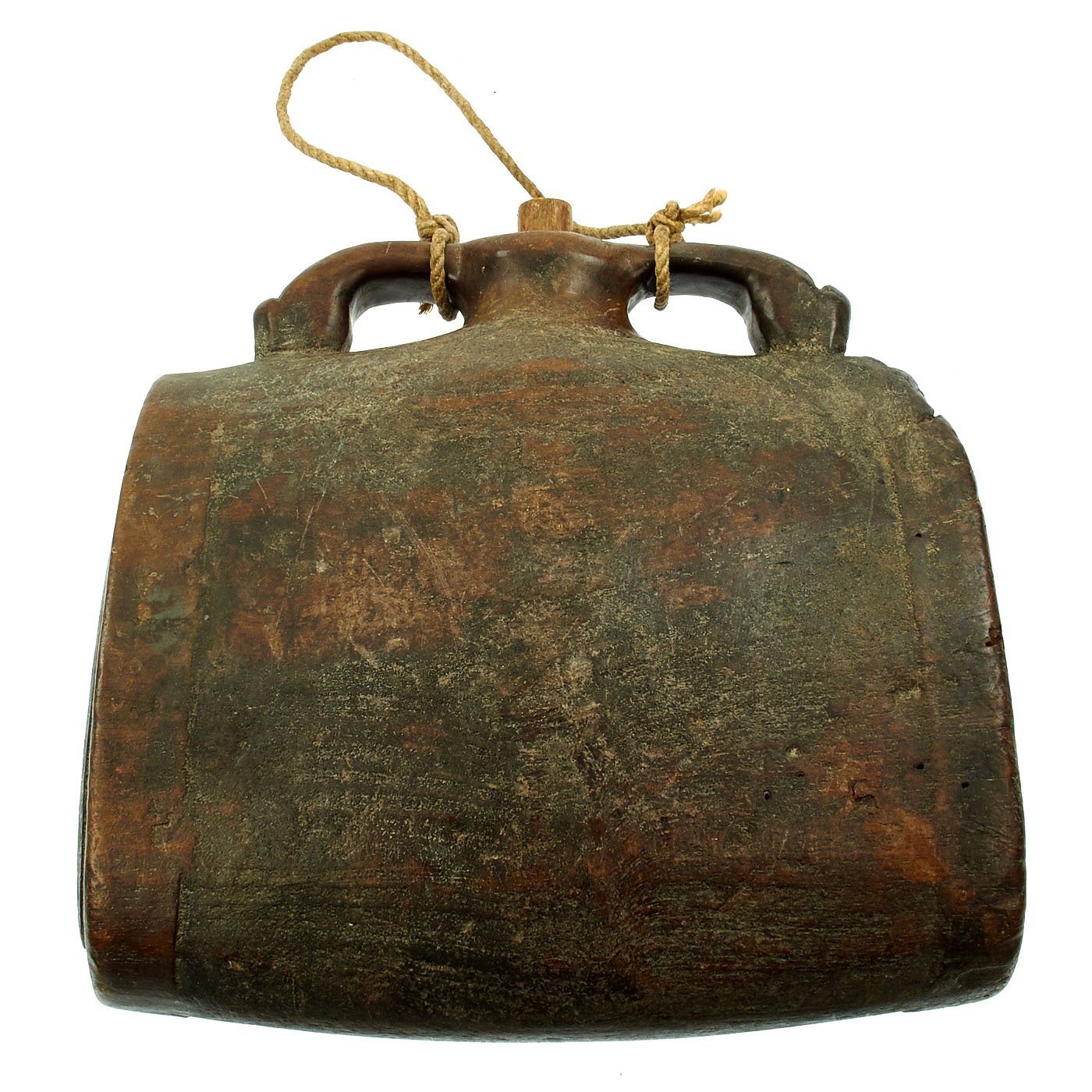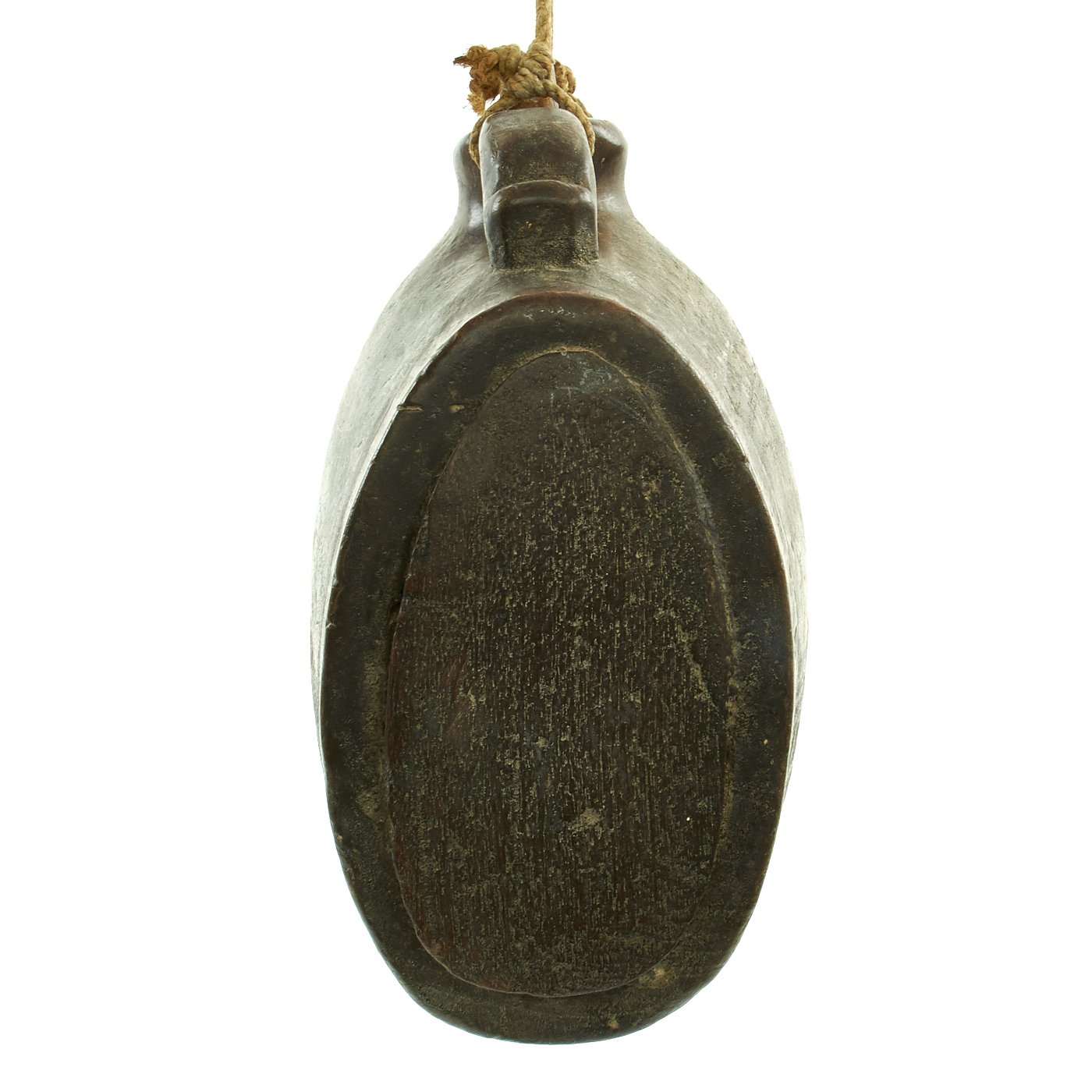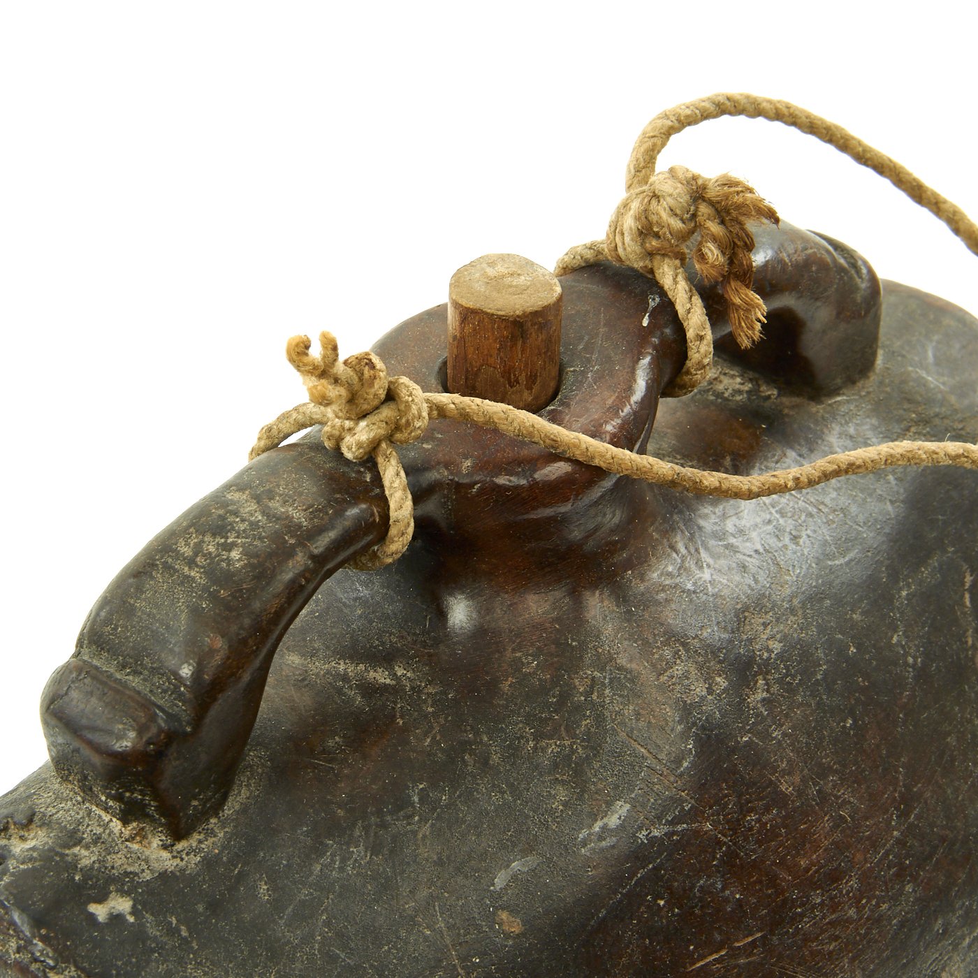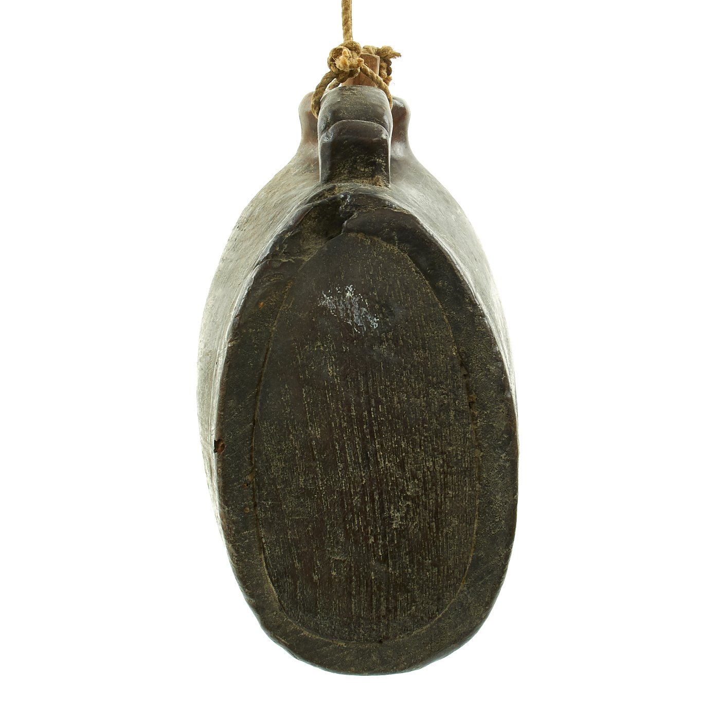 This is a genuine 19th century or early 20th century Canine canteen water bottle. Constructed of wood with double loops for hanging underneath the dog's neck with a cork stopper. Reminiscent of a St. Bernards brandy barrel, tt measures 7 inches across by 8 inches tall and 3 inches wide. Overall condition is excellent.