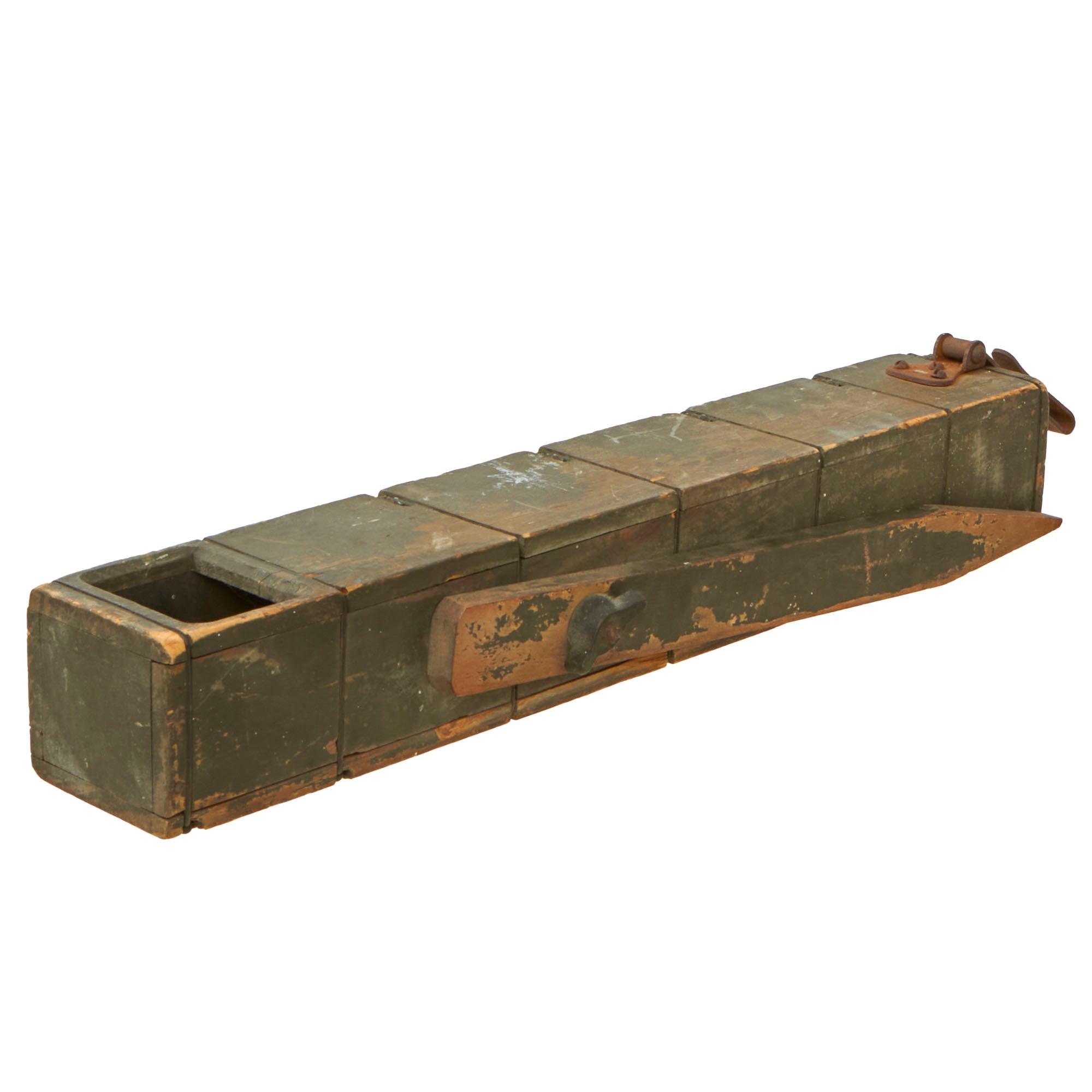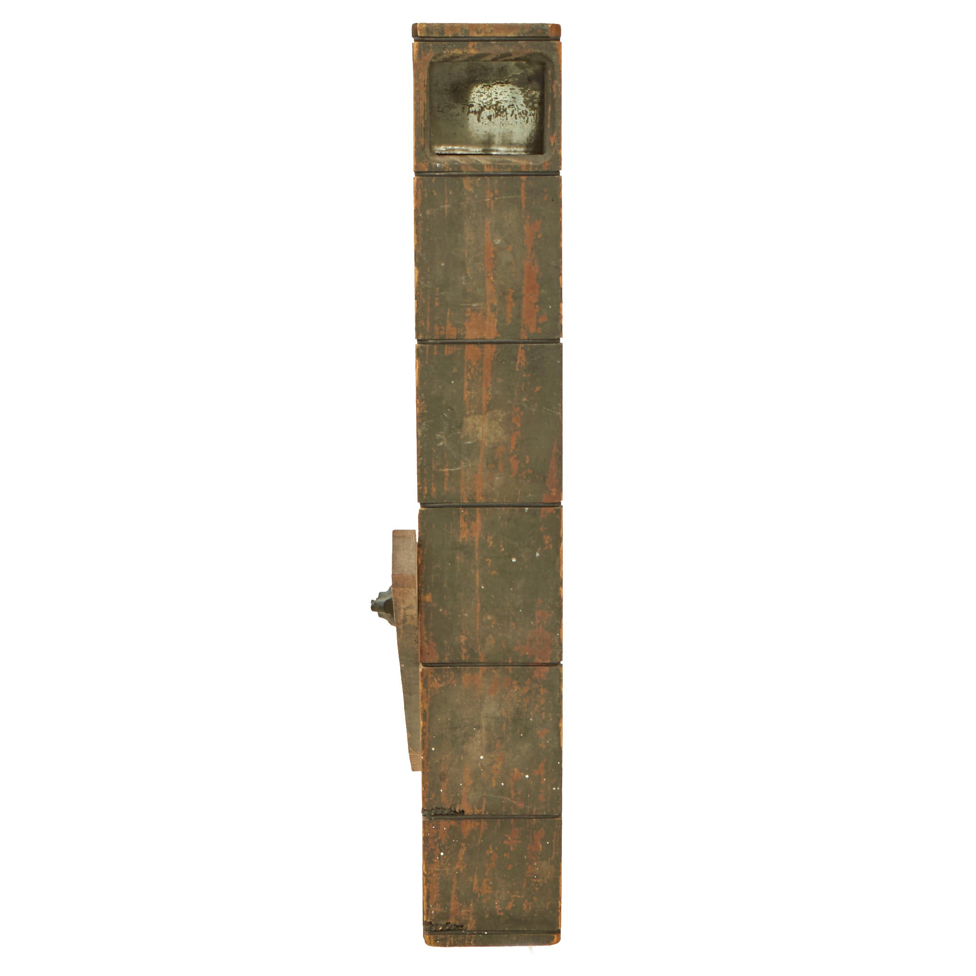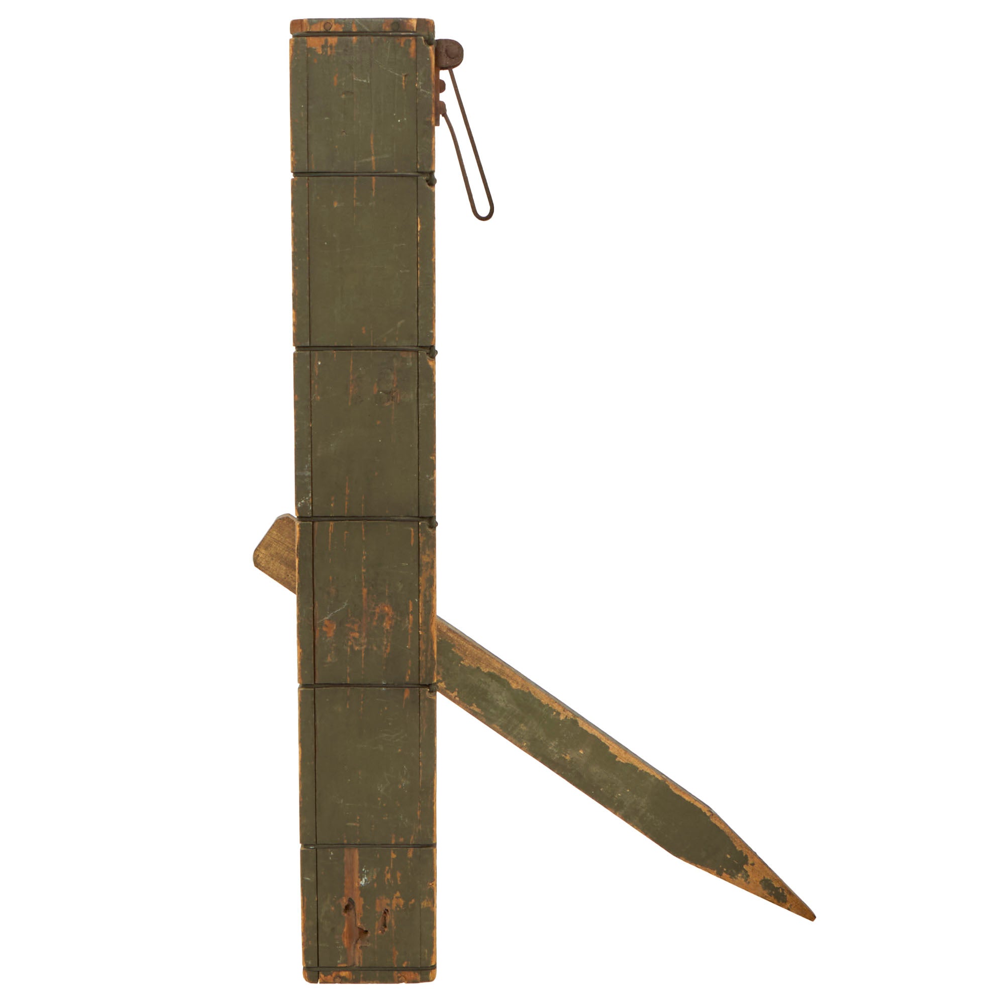 Original Item: Only One Available. This trench periscope is an authentic and invaluable tool from the First World War, which played an essential role in trench warfare. It has been prudently preserved and has retained most of its original olive drab green paint. The periscope is accompanied by its original adjustable leg and belt clip, which are equally well-preserved.