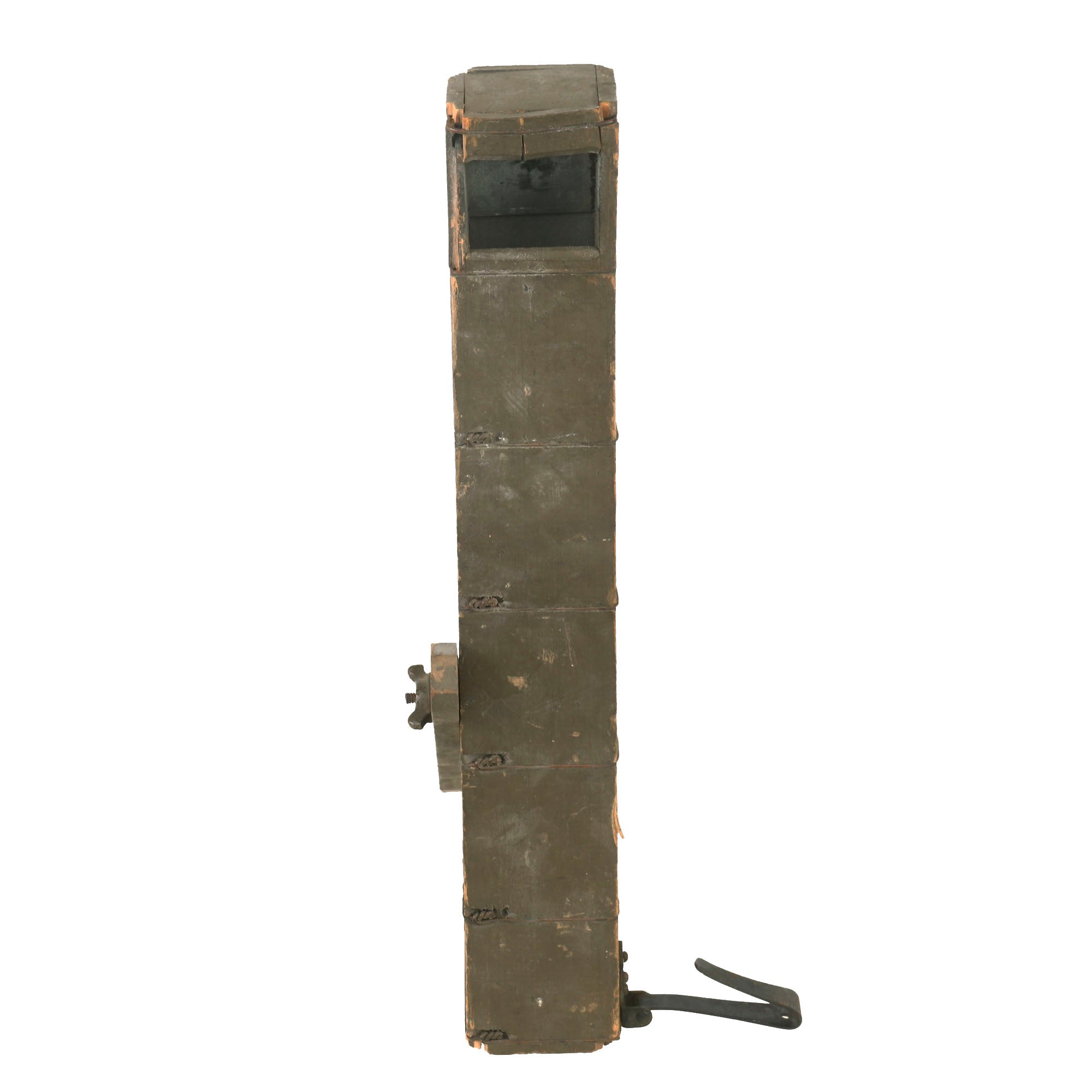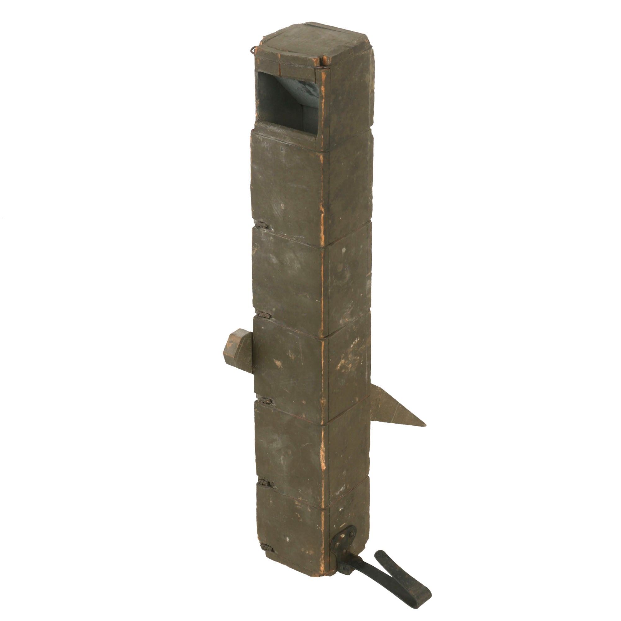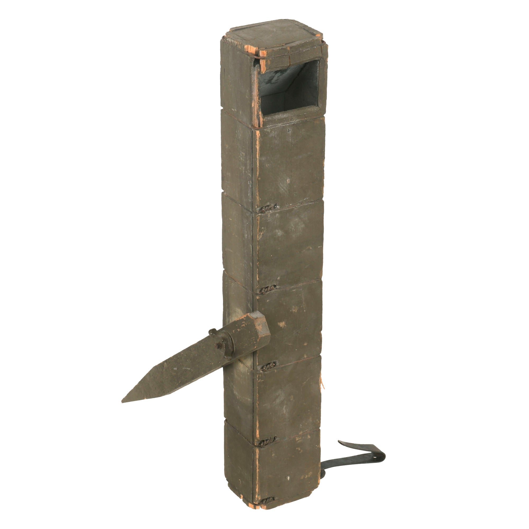 Original Item: Only One Available. This trench periscope is an authentic and invaluable tool from the First World War, which played an essential role in trench warfare. It has been prudently preserved and has retained most of its original olive drab green paint. The periscope is accompanied by its original adjustable leg and belt clip, which are equally well-preserved.