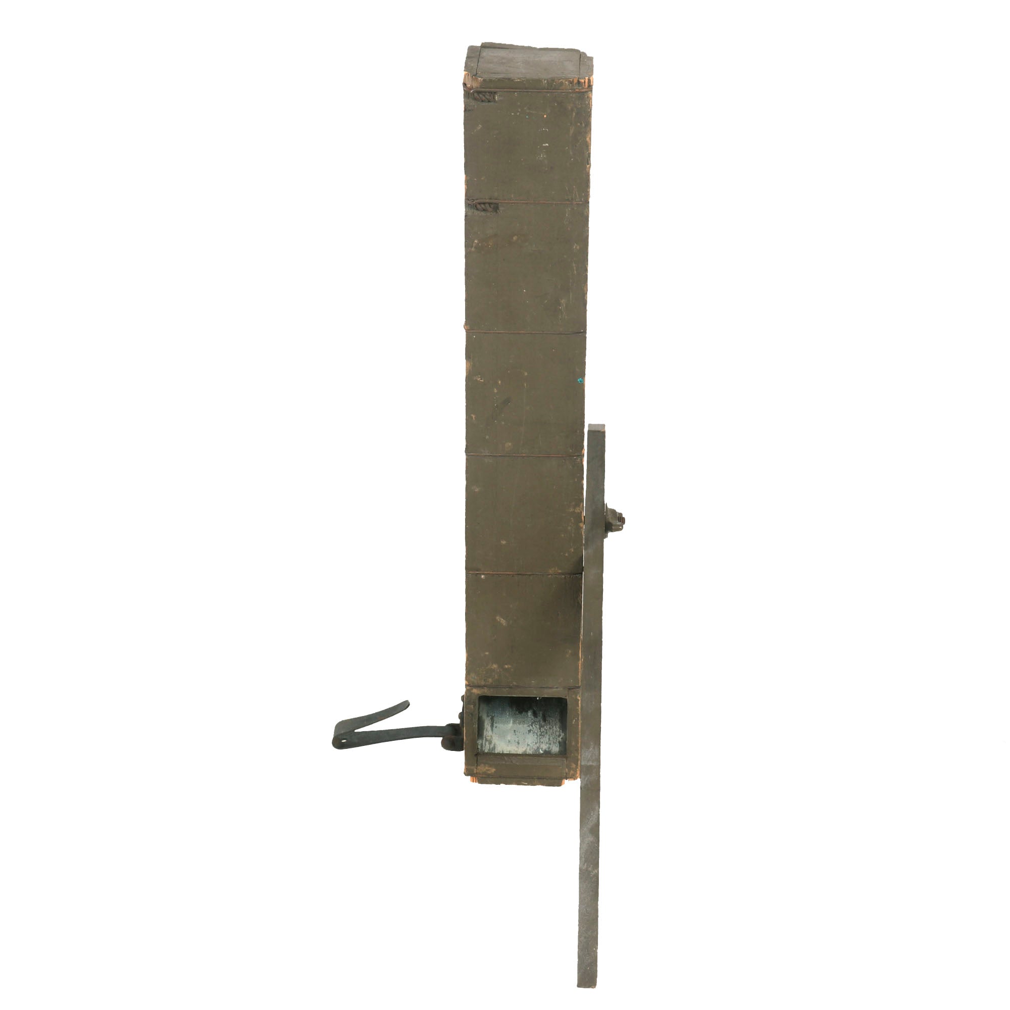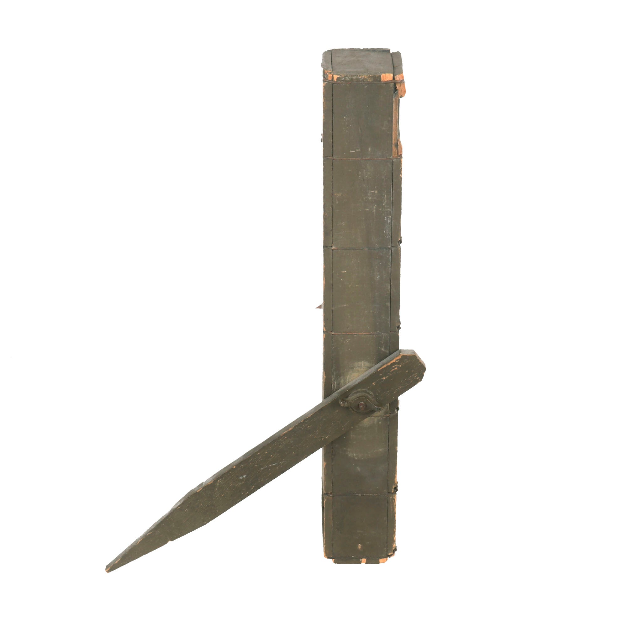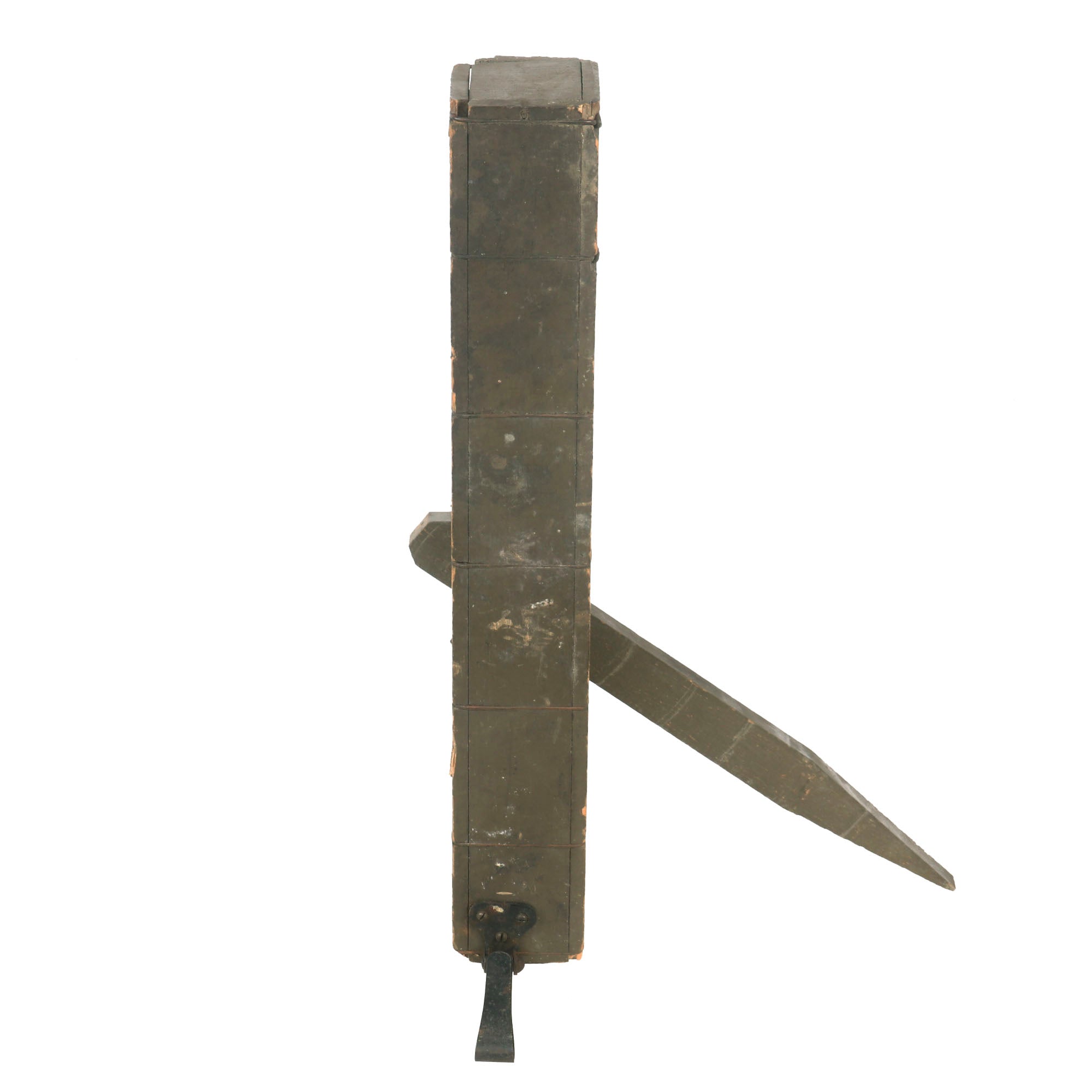 Original Item: Only One Available. This trench periscope is an authentic and invaluable tool from the First World War, which played an essential role in trench warfare. It has been prudently preserved and has retained most of its original olive drab green paint. The periscope is accompanied by its original adjustable leg and belt clip, which are equally well-preserved.