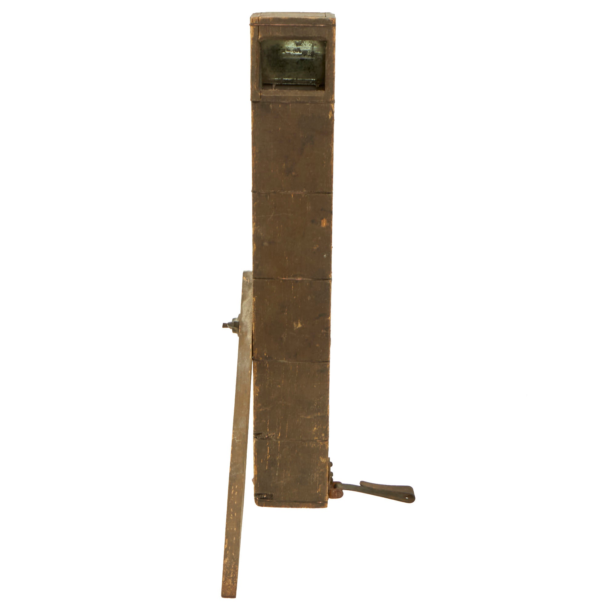 The battlefield is viewed by the use of two opposing glass mirrors, one top, one bottom, held in a wooden case held together by twisted wire. A fairly crude design but it got the job done, and was cheap and easy to mass produce at the time.