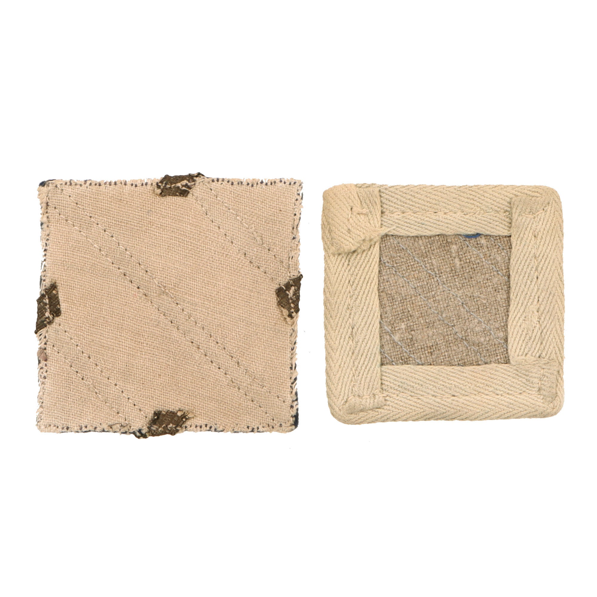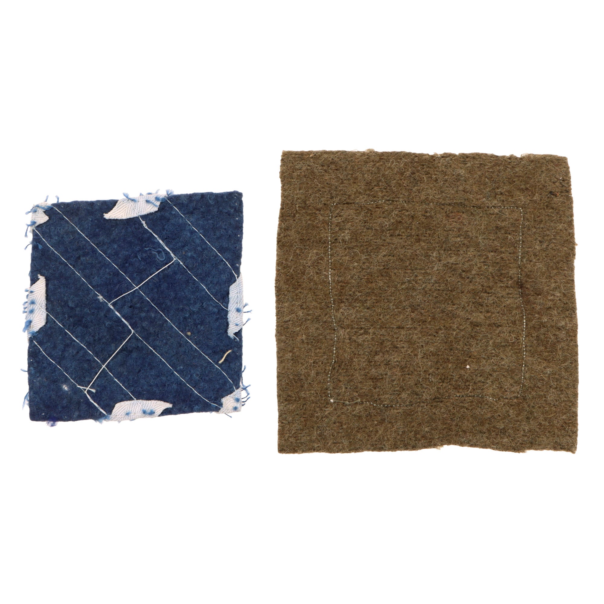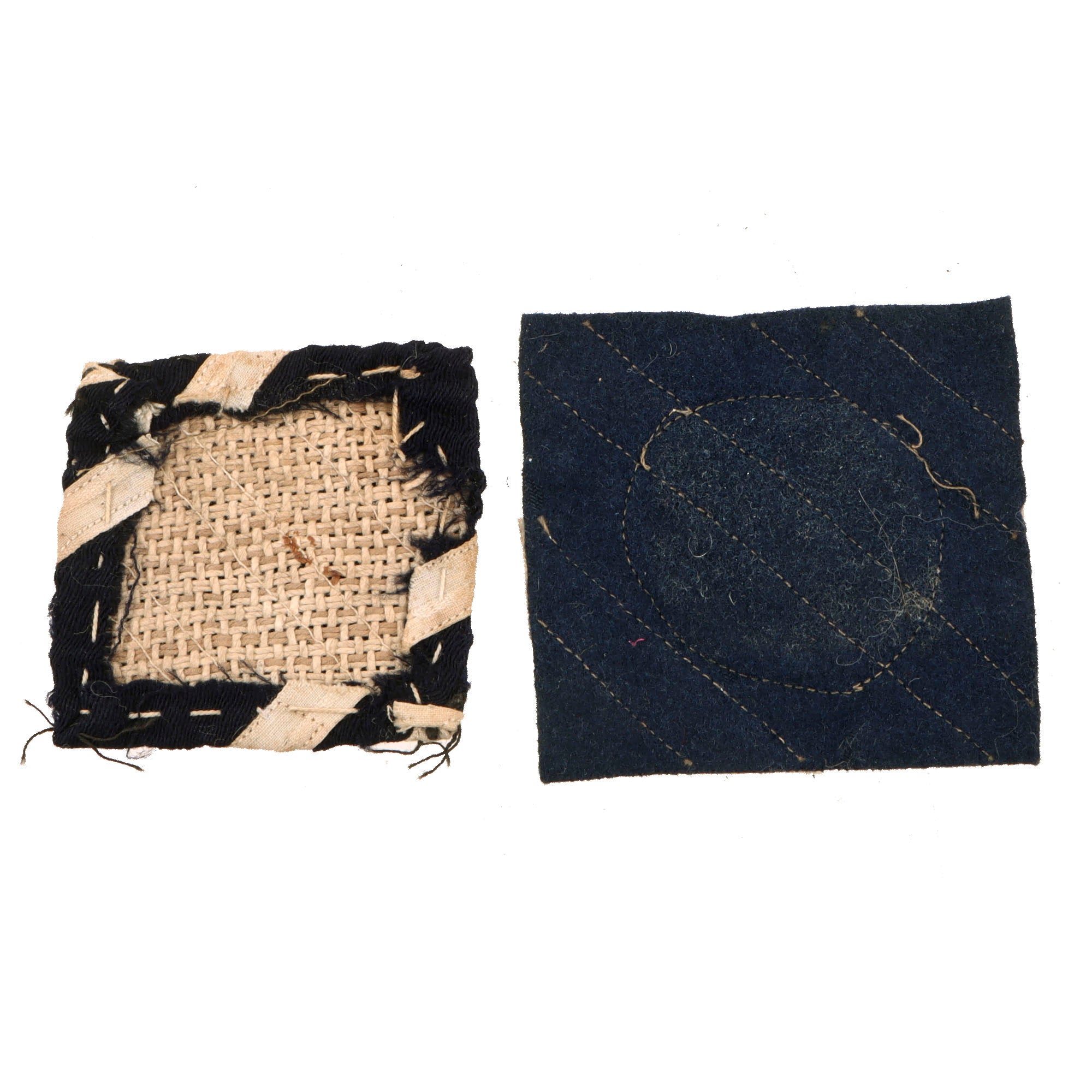 - Blue wool-backed patch with woven white stripes.