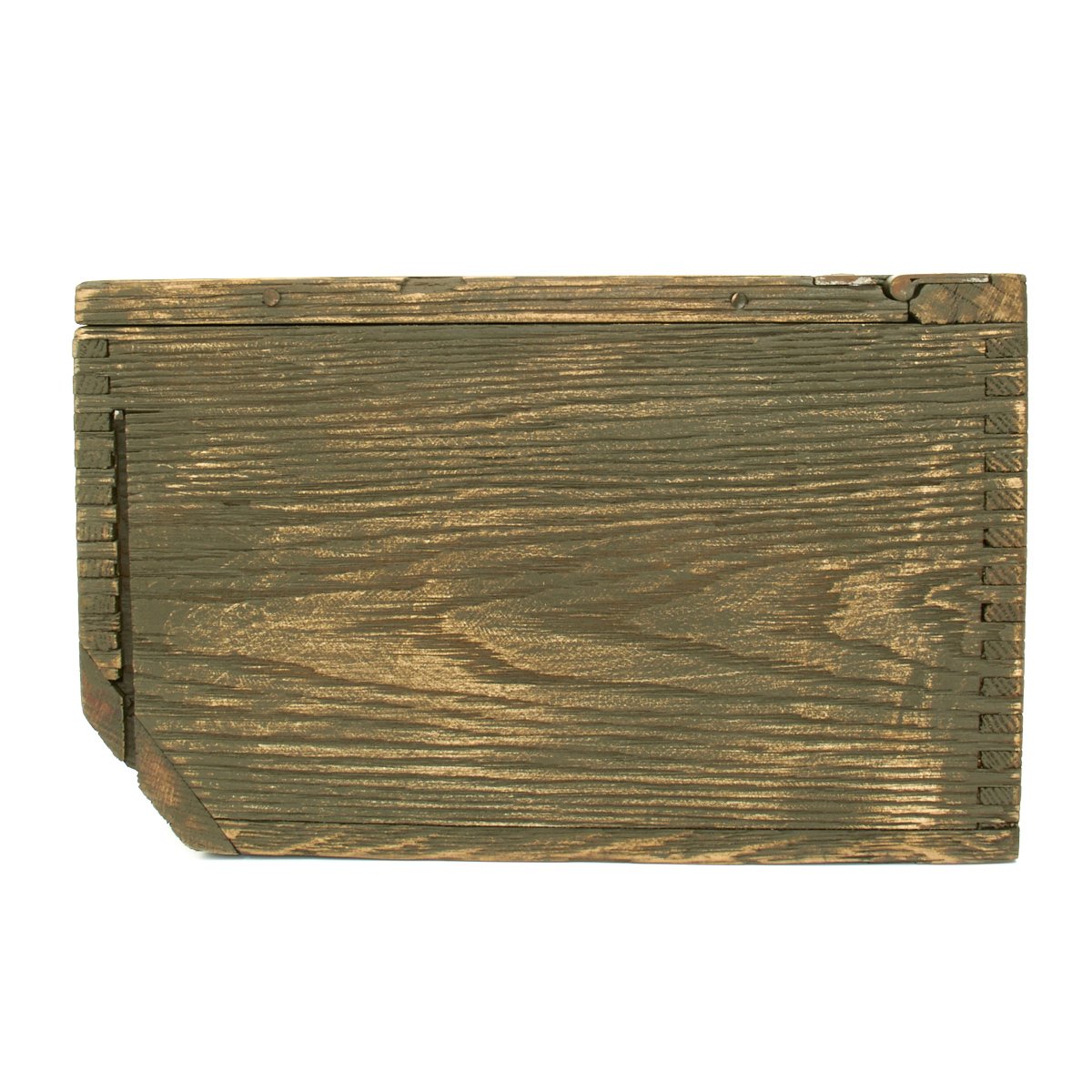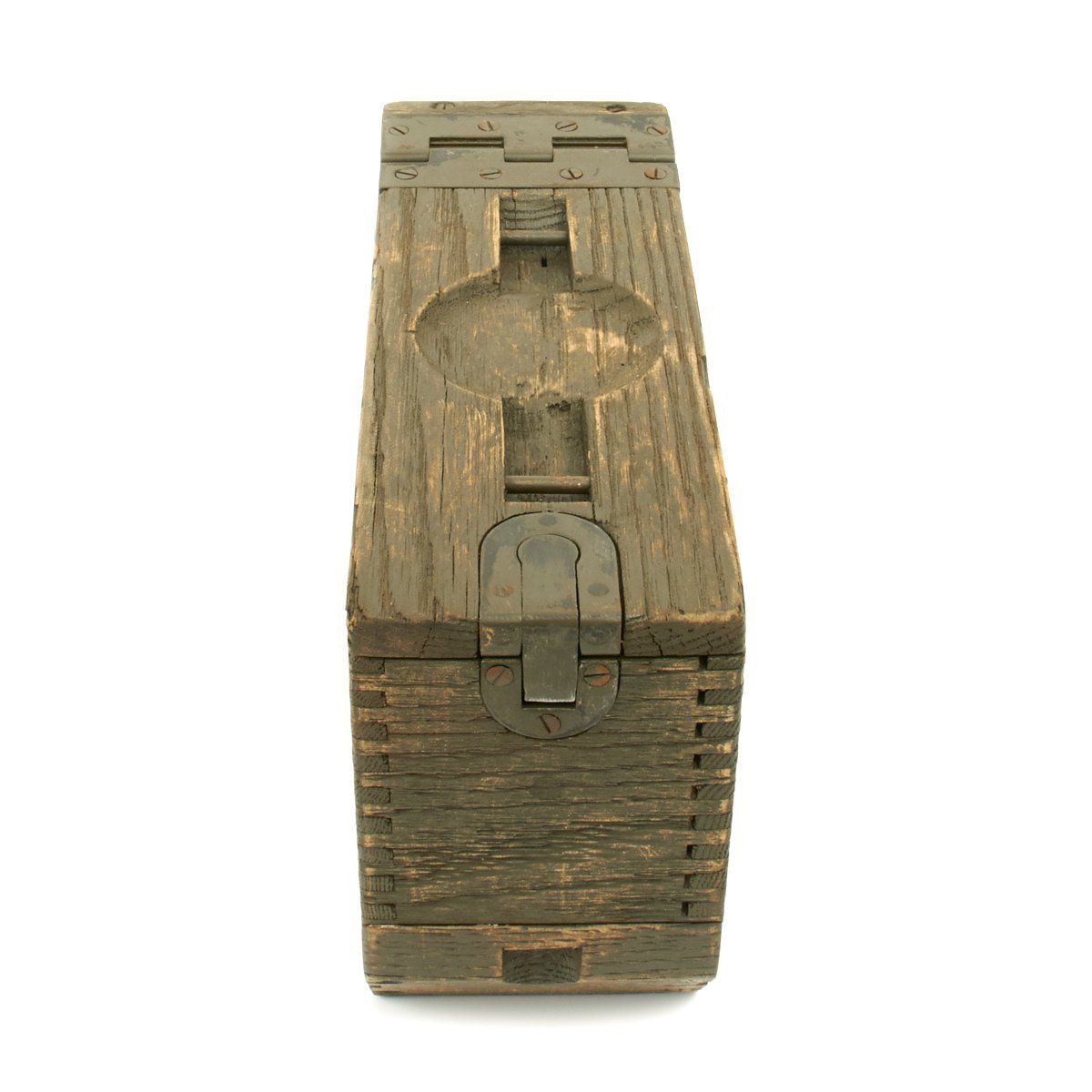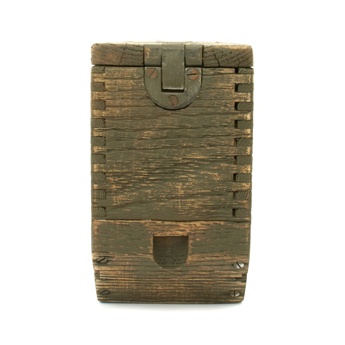 These were originally produced in plain wood finish, however this example was given a light coat of OD green paint sometime during its service life. The box design has two machined slots and slanted front corner for mounting directly to the tripod mount. The inside still retains the three stenciled bullet diagrams on the floor of the box to remind the packer which way the bullet heads must point when inserting a loaded belt, though they are somewhat faded.