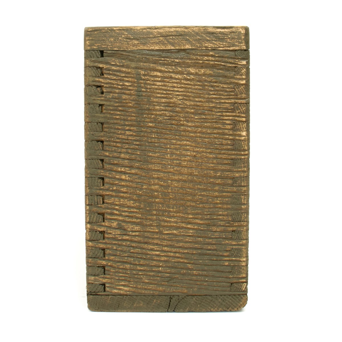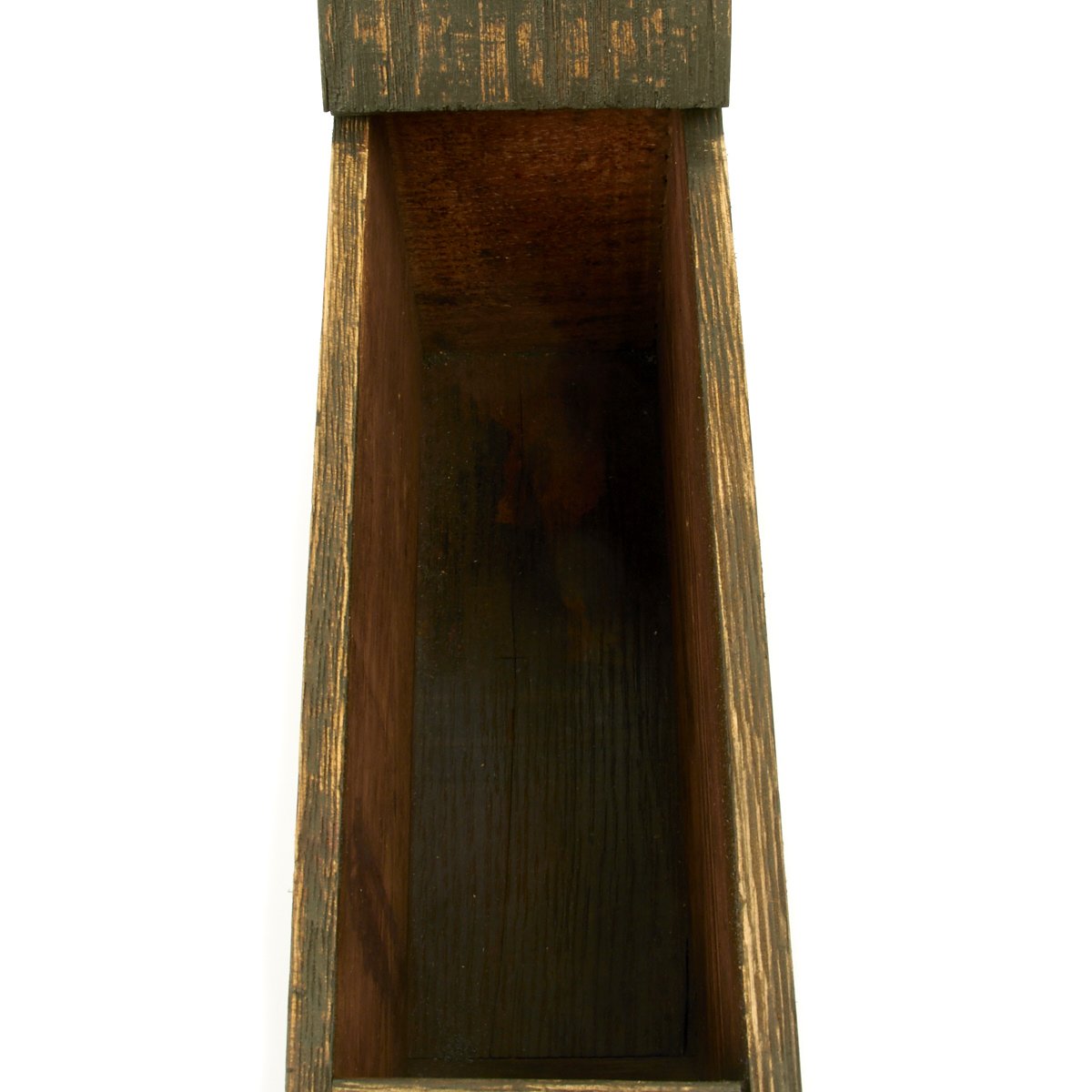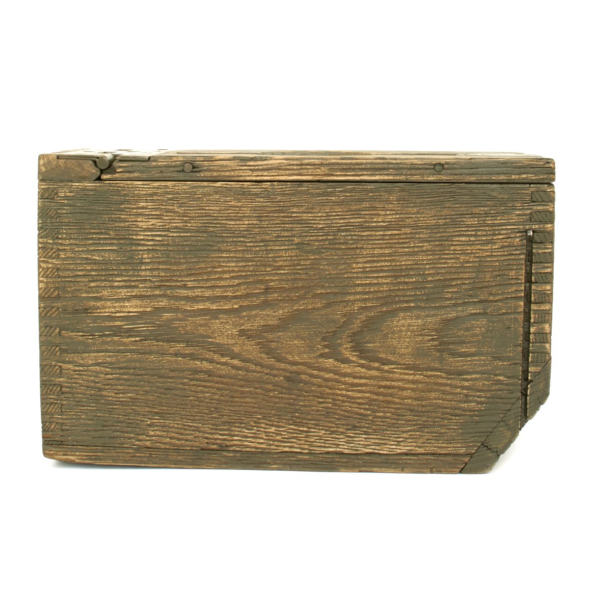 These were originally produced in plain wood finish, however this example was given a light coat of OD green paint sometime during its service life. The box design has two machined slots and slanted front corner for mounting directly to the tripod mount. The inside still retains the three stenciled bullet diagrams on the floor of the box to remind the packer which way the bullet heads must point when inserting a loaded belt, though they are somewhat faded.