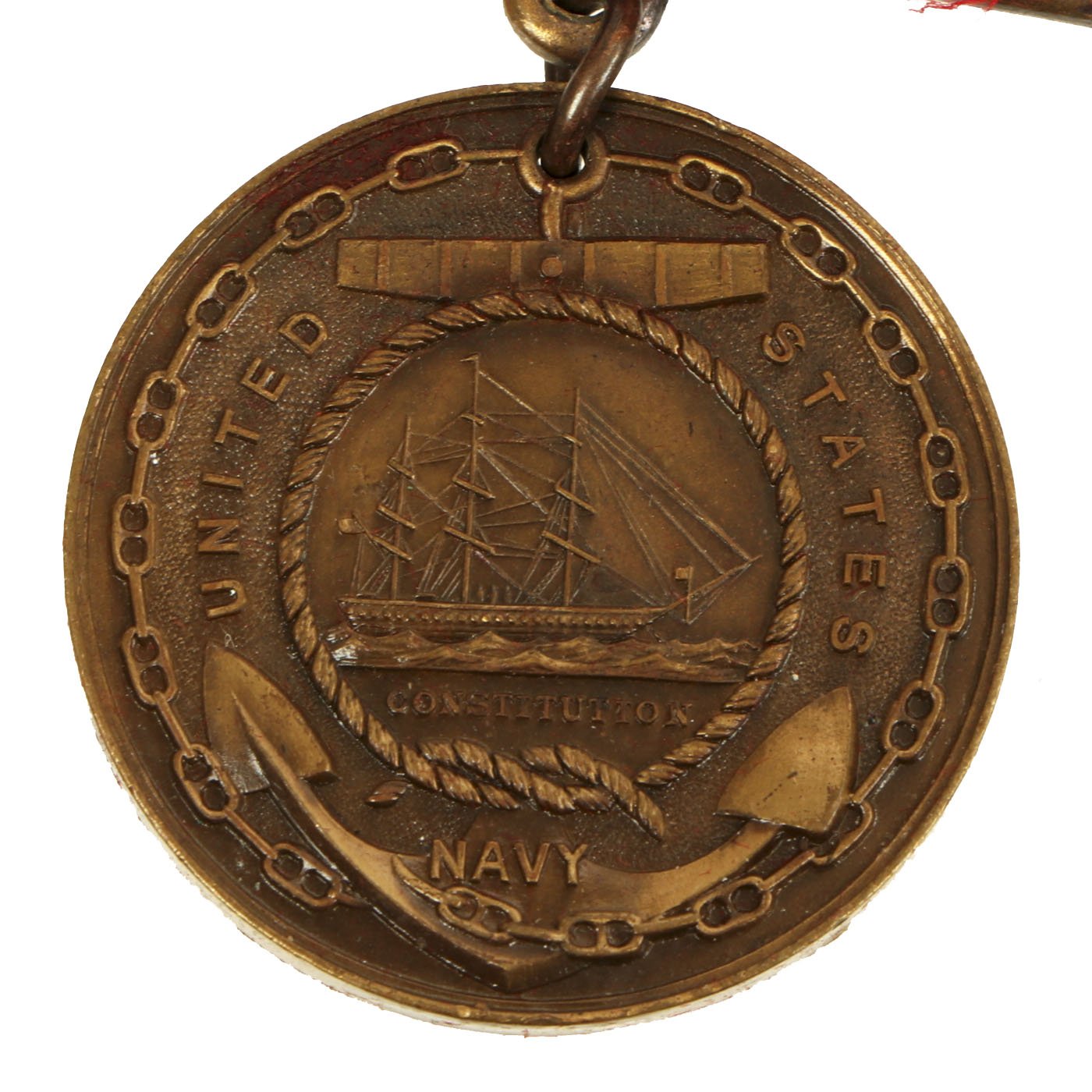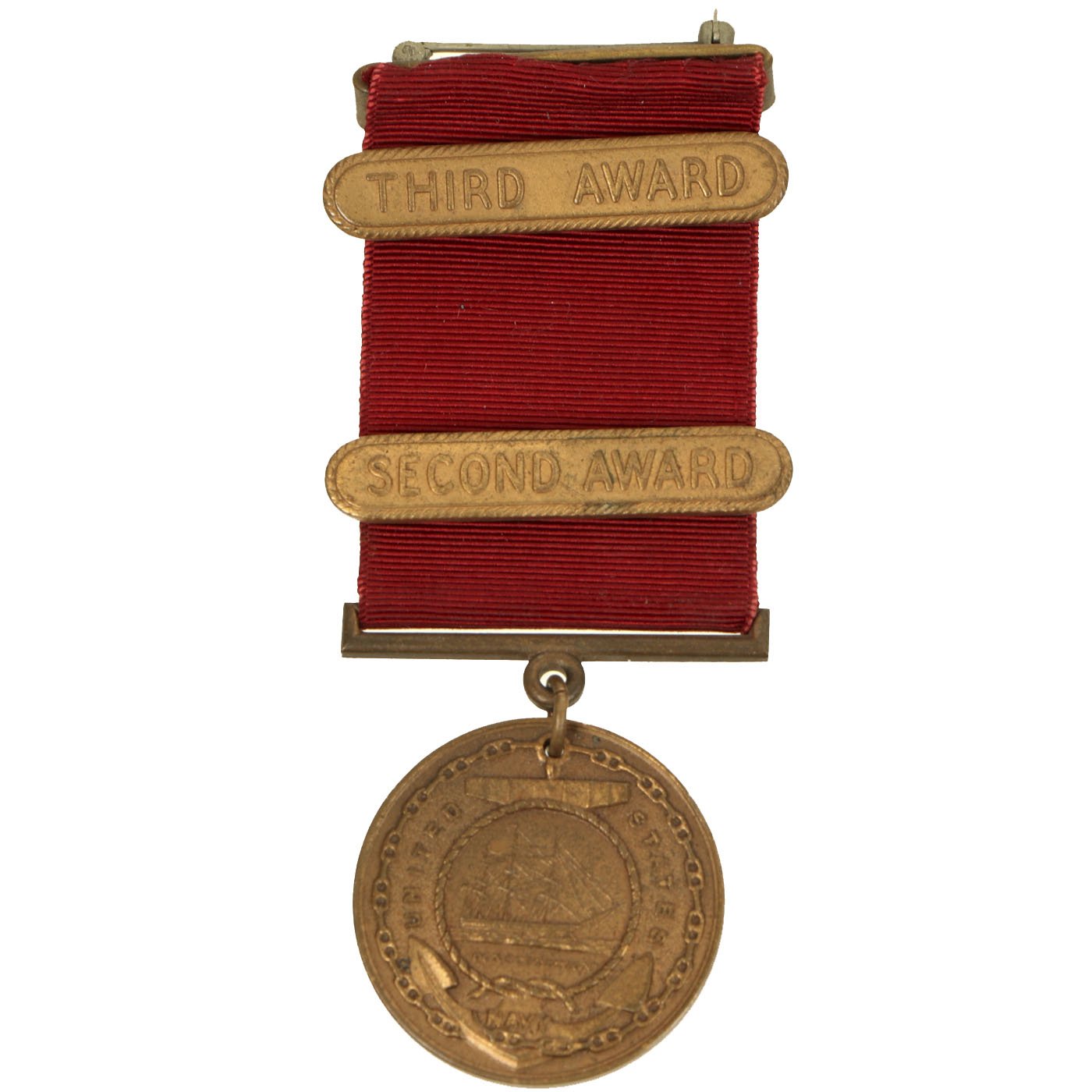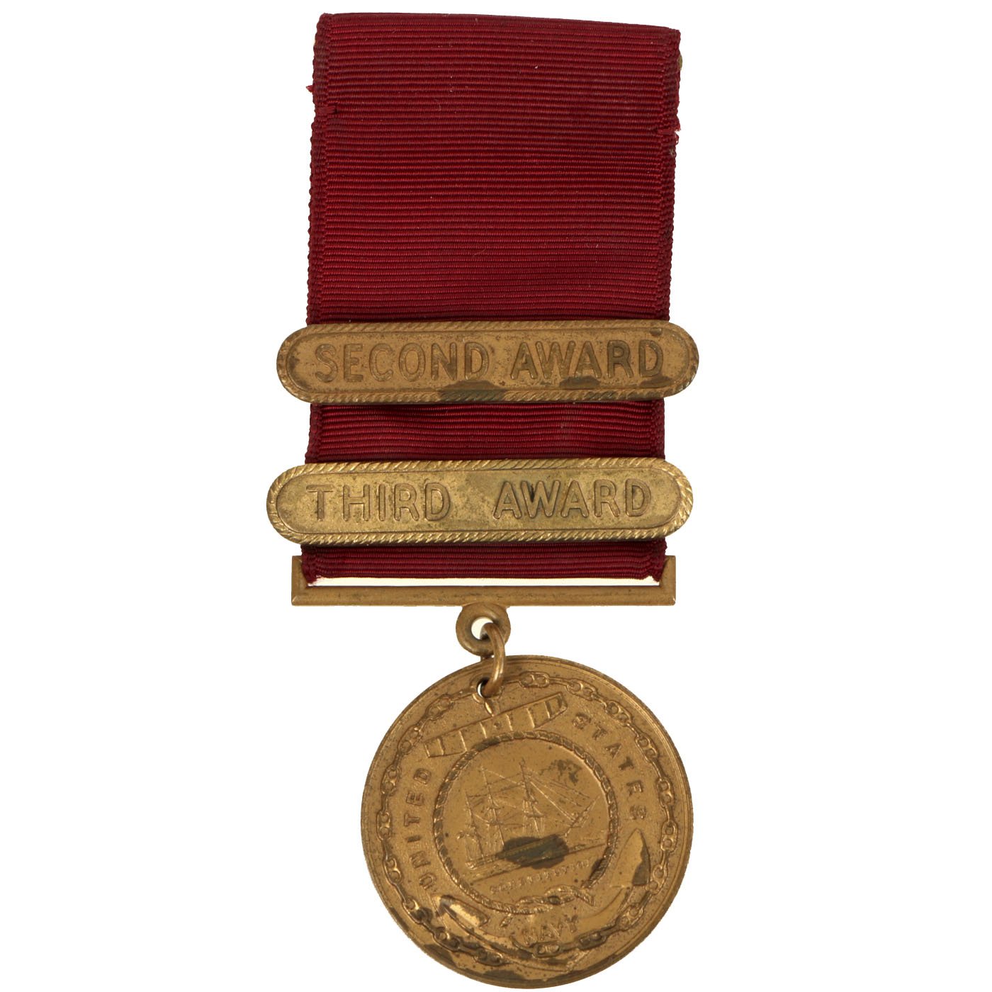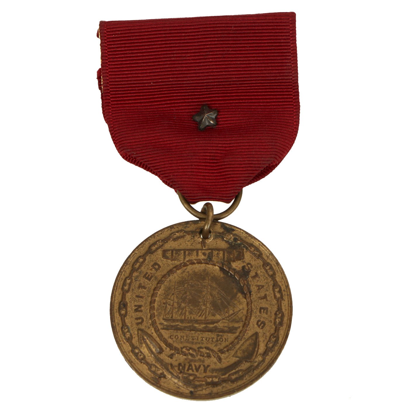 The second version of the Navy Good Conduct Medal was issued between 1880 and 1884. The medal was considered a "transitional decoration" and was the first of the Good Conduct Medals to be worn on a uniform. The medal was phased out by 1885 and a new medal issued between 1885 and 1961. The new medal was a Good Conduct medallion suspended from an all red ribbon. Enlistment bars, denoting each honorable enlistment completed, were pinned on the ribbon as attachments.