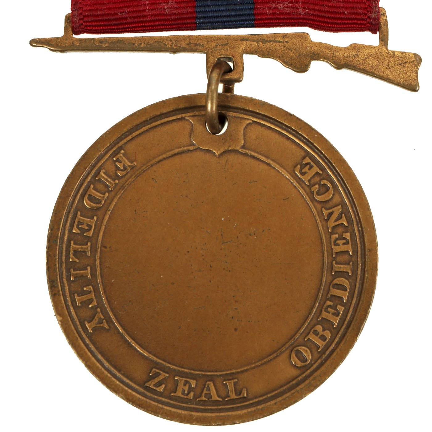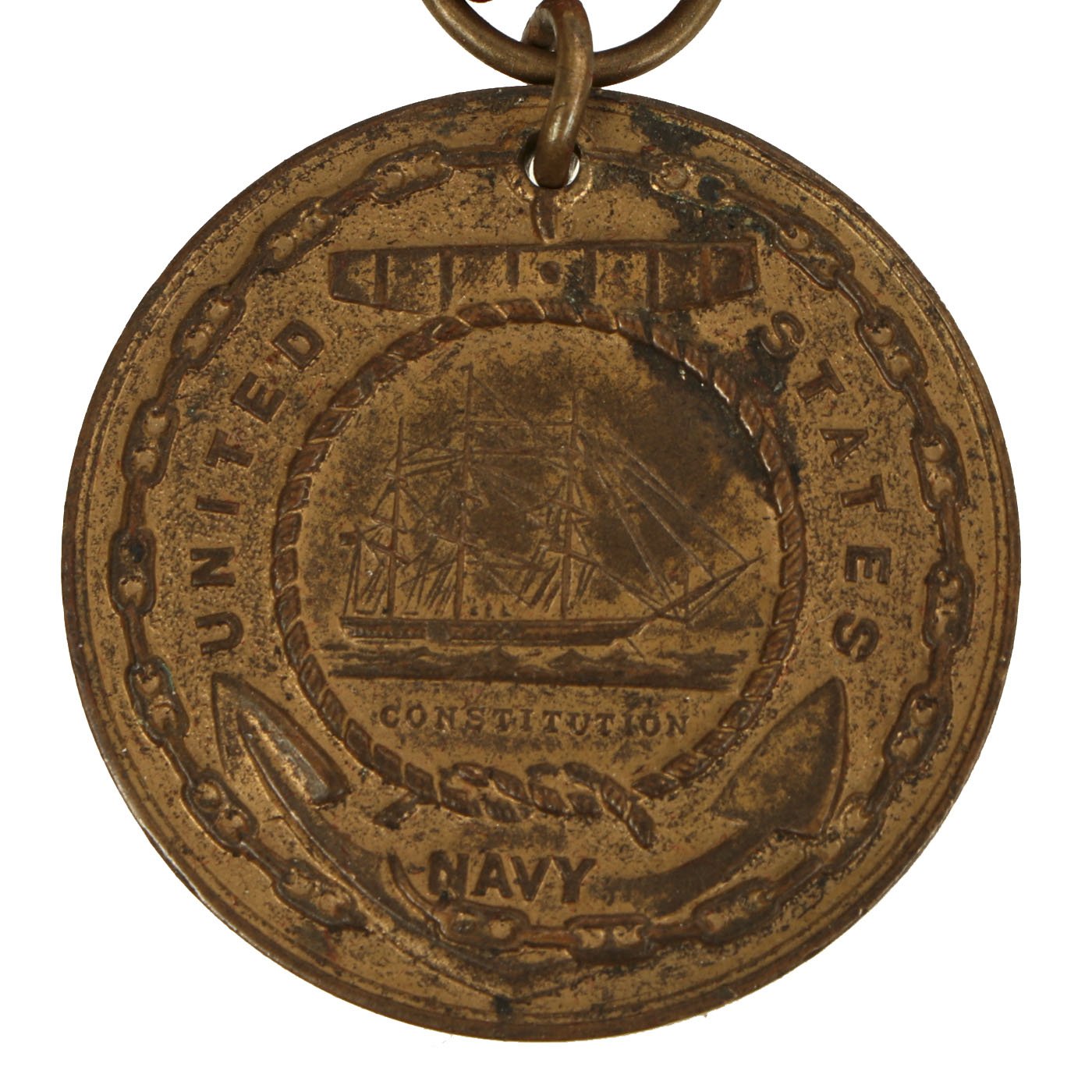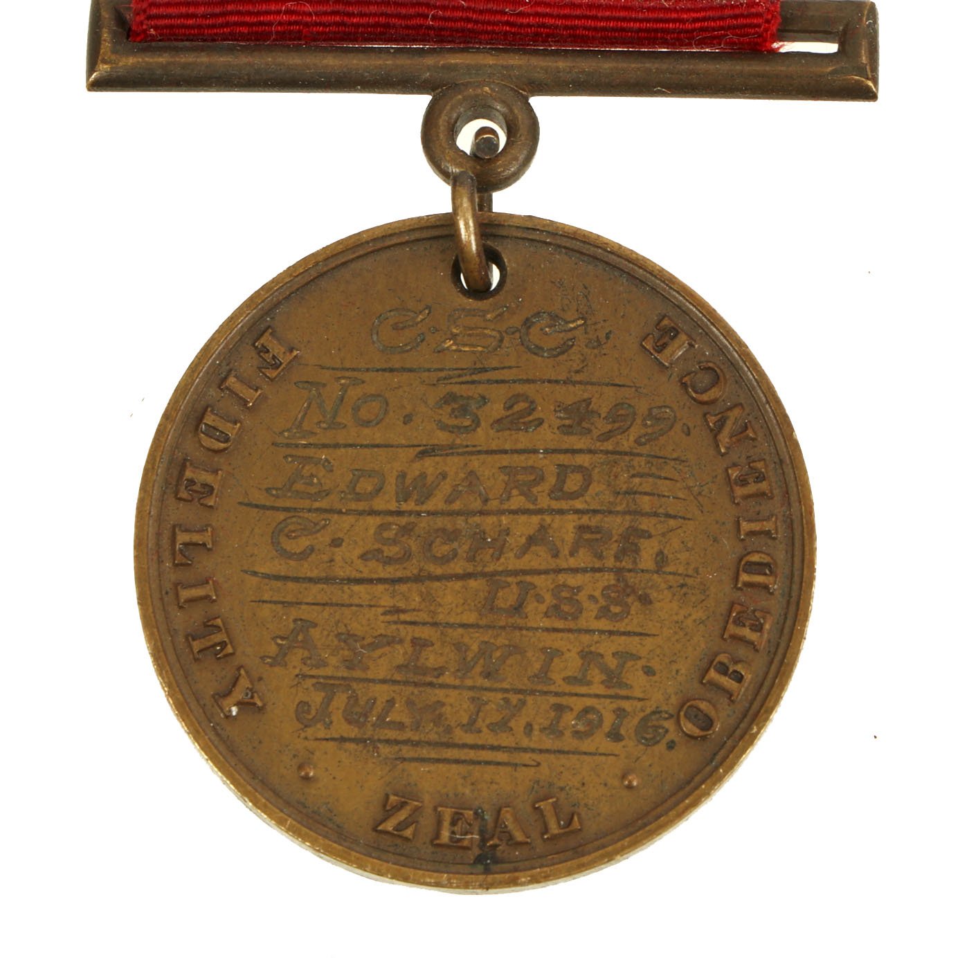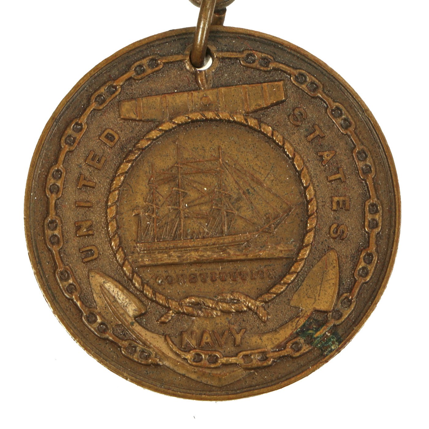 The second version of the Navy Good Conduct Medal was issued between 1880 and 1884. The medal was considered a "transitional decoration" and was the first of the Good Conduct Medals to be worn on a uniform. The medal was phased out by 1885 and a new medal issued between 1885 and 1961. The new medal was a Good Conduct medallion suspended from an all red ribbon. Enlistment bars, denoting each honorable enlistment completed, were pinned on the ribbon as attachments.