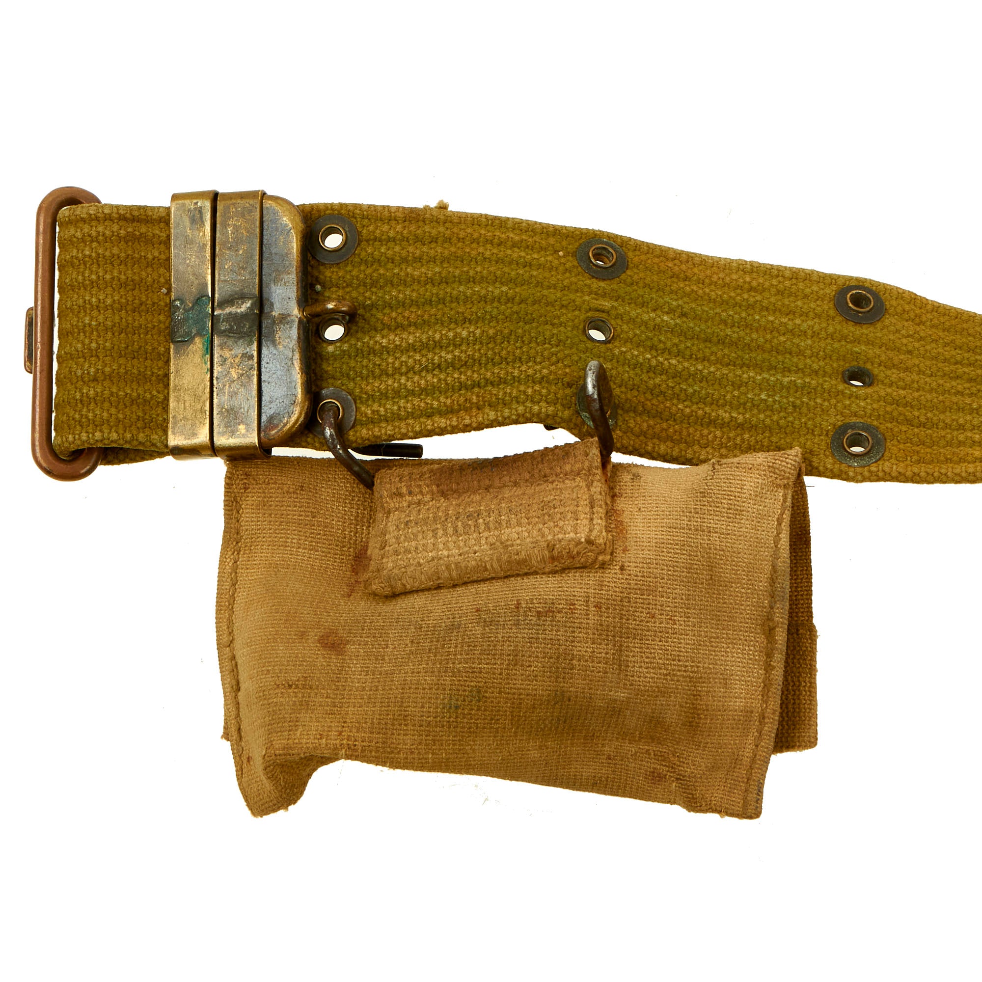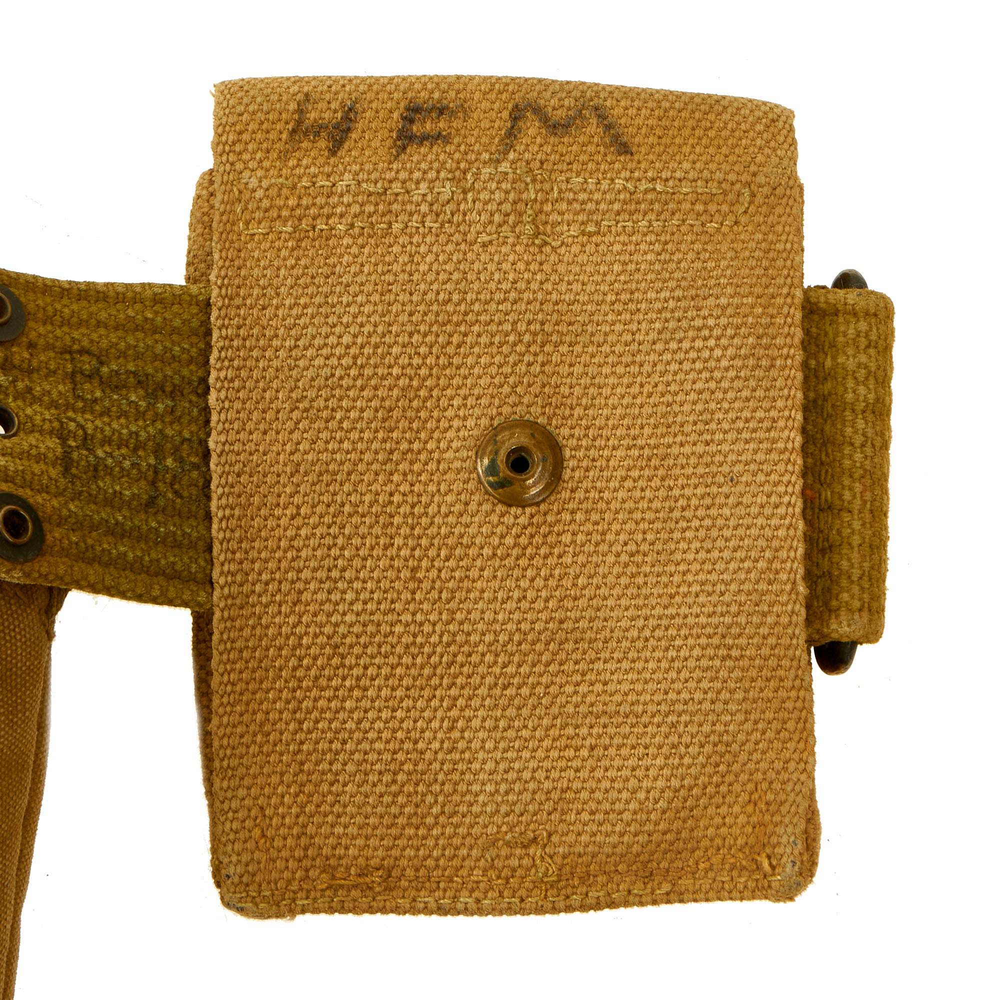 - M1910 Pistol Belt: The belt is stamped but is too faded to read unfortunately. The Belt is in fantastic condition, with the webbing not exhibiting any signs of dry rot, tears, or unsightly damage. The brass hardware still retains some of its original blacking. There is a WWII laundry number and name present.