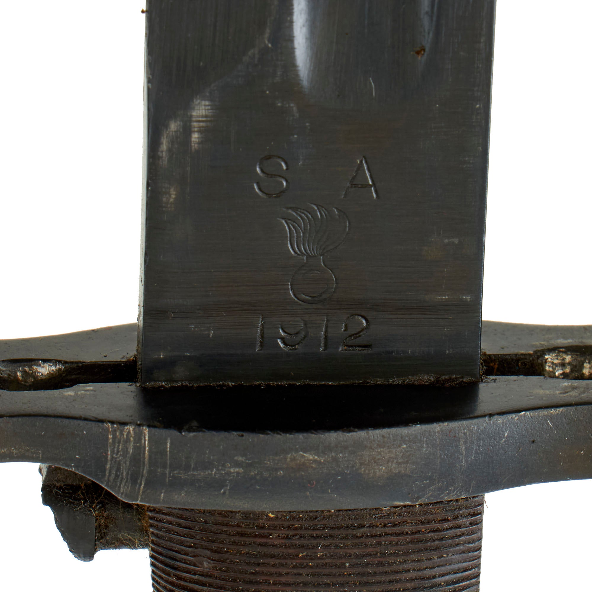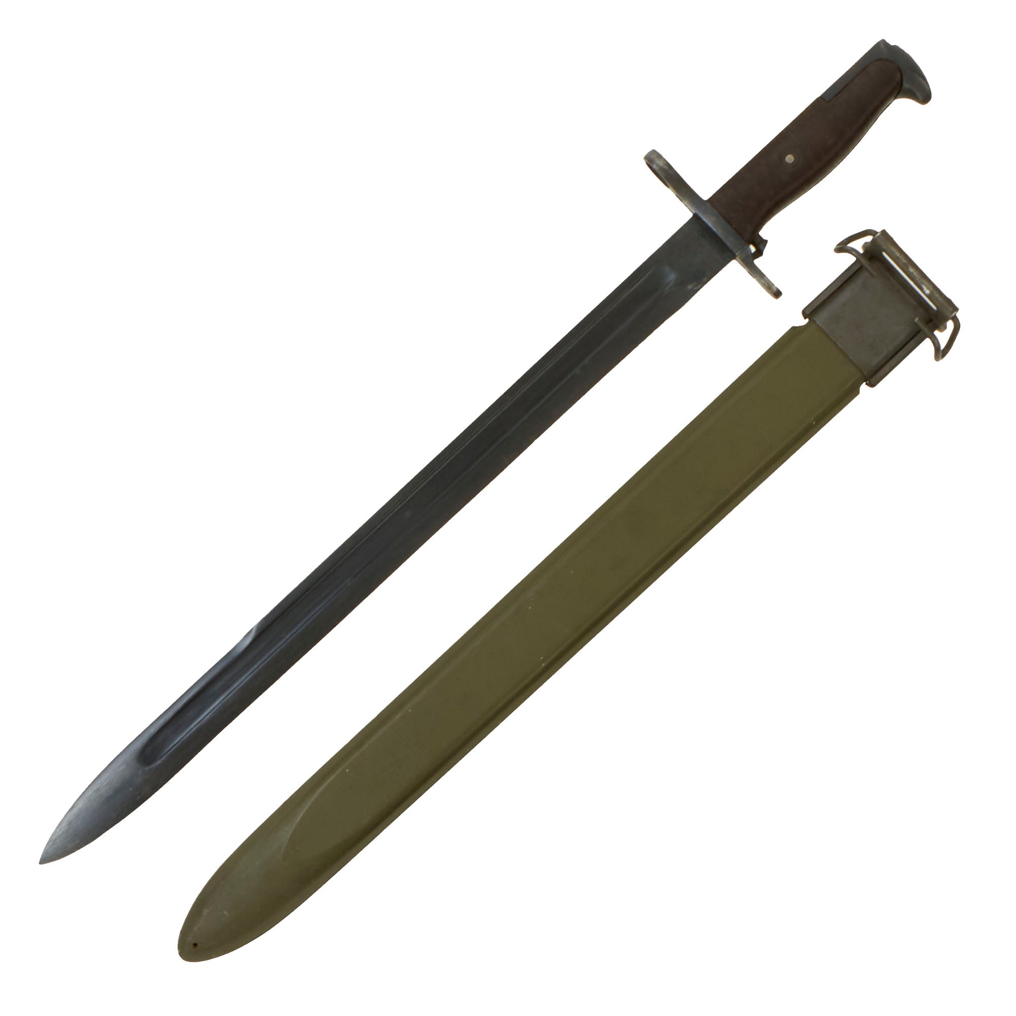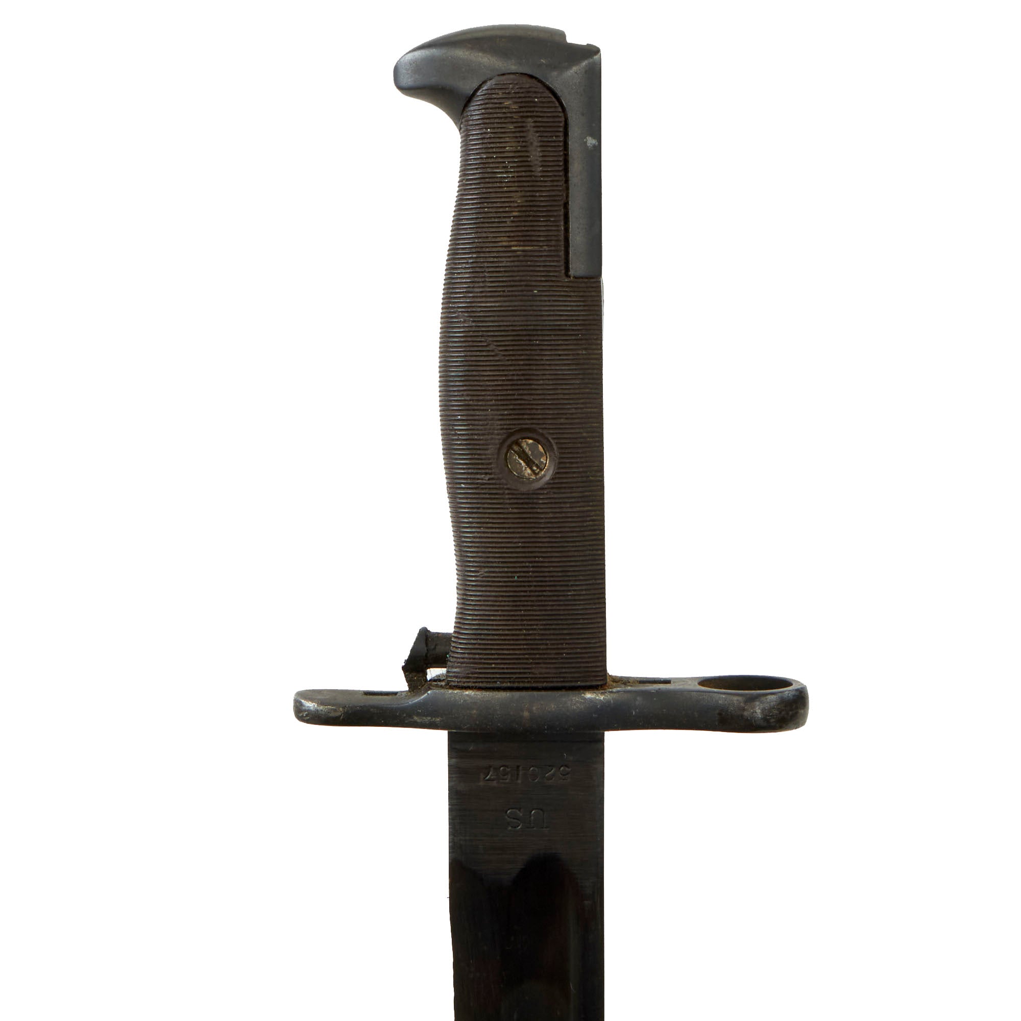 Original Item: Only One Available. This is a nice U.S. M1905 bayonet dated 1912, originally made during the pre WWI period for the M1903 Springfield Rifle, which was then reissued in WWII for the M1 Garand Rifle. It is fitted with a WWII Issue M3 scabbard. The Garand was designed to take the same blade bayonet as the M1903 Springfield rifle, so at the beginning of the war they were issued with bayonets originally made for those rifles. Later in 1942 to keep up with wartime production, new orders for M1905 bayonets with plastic grips were sent out, which had plastic ribbed grips like this one. These were also sometimes fitted to M1905 bayonets made previously that had damage to their wooden grips.