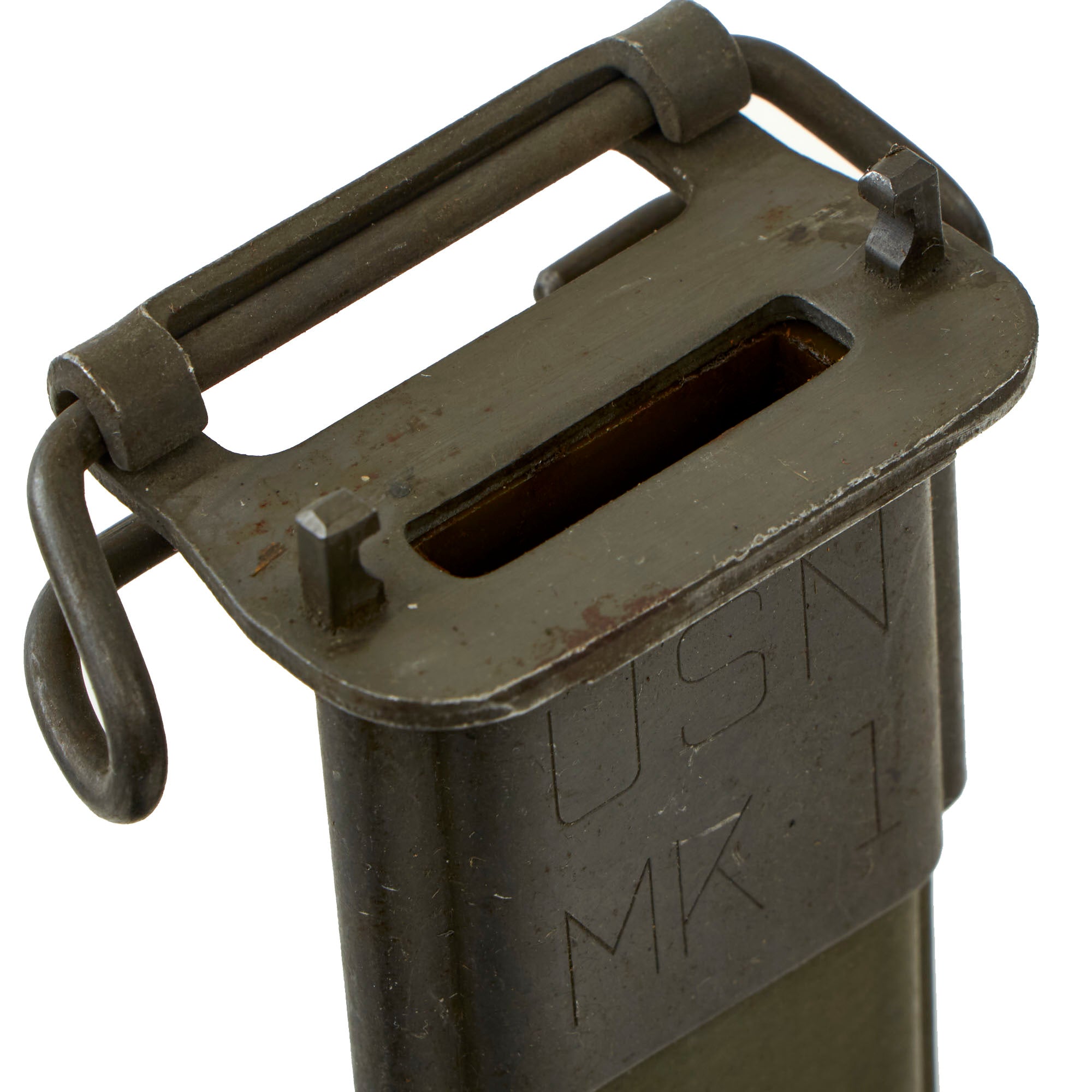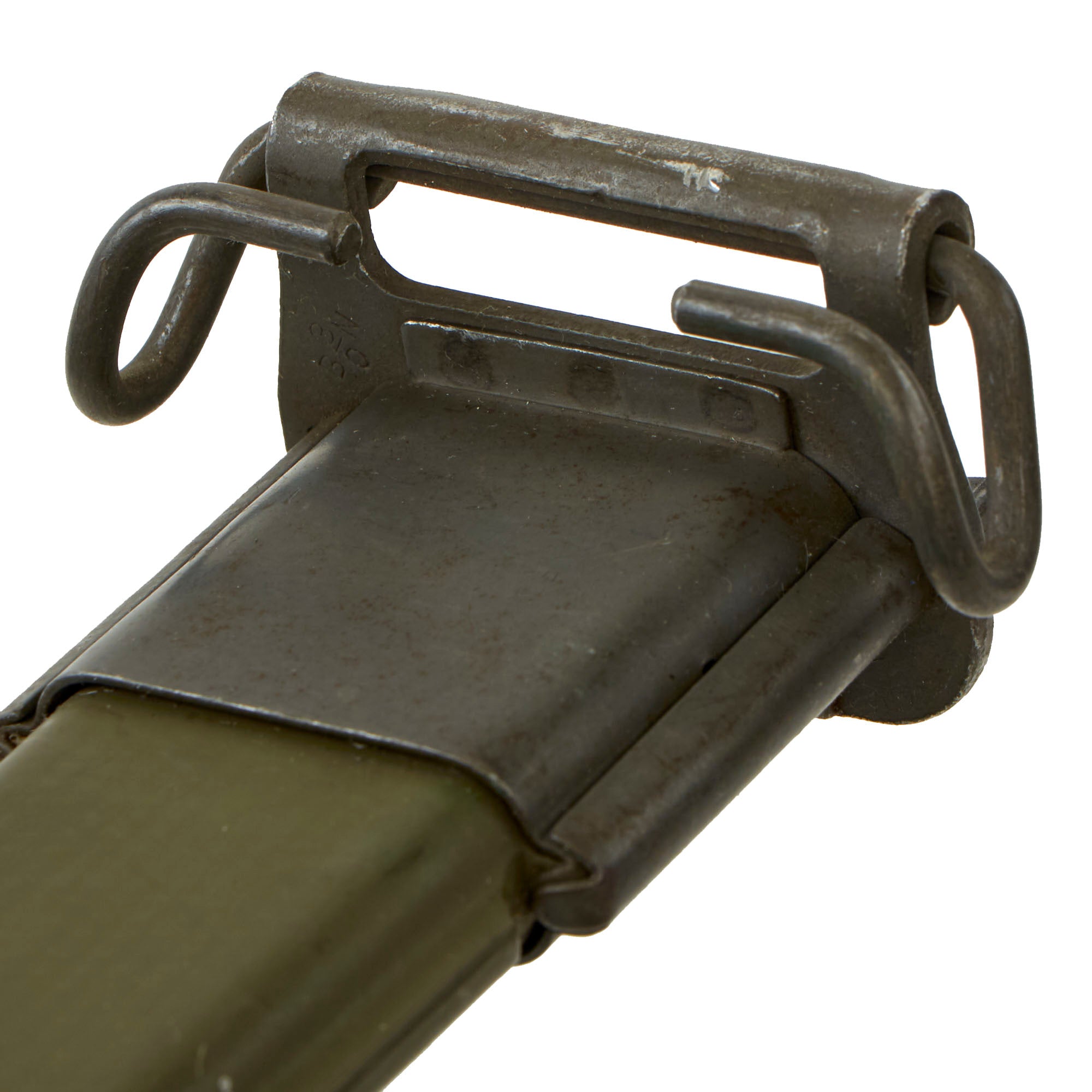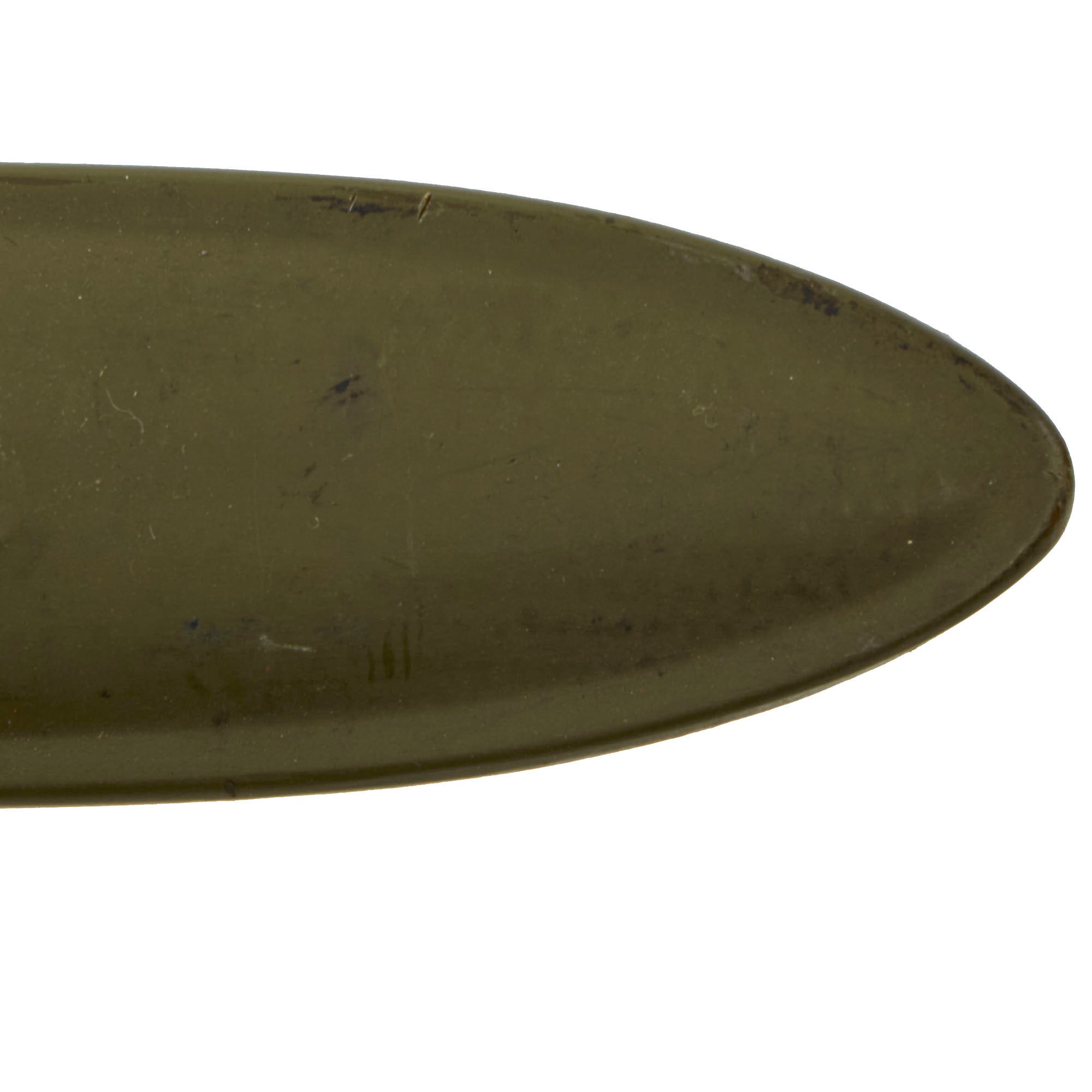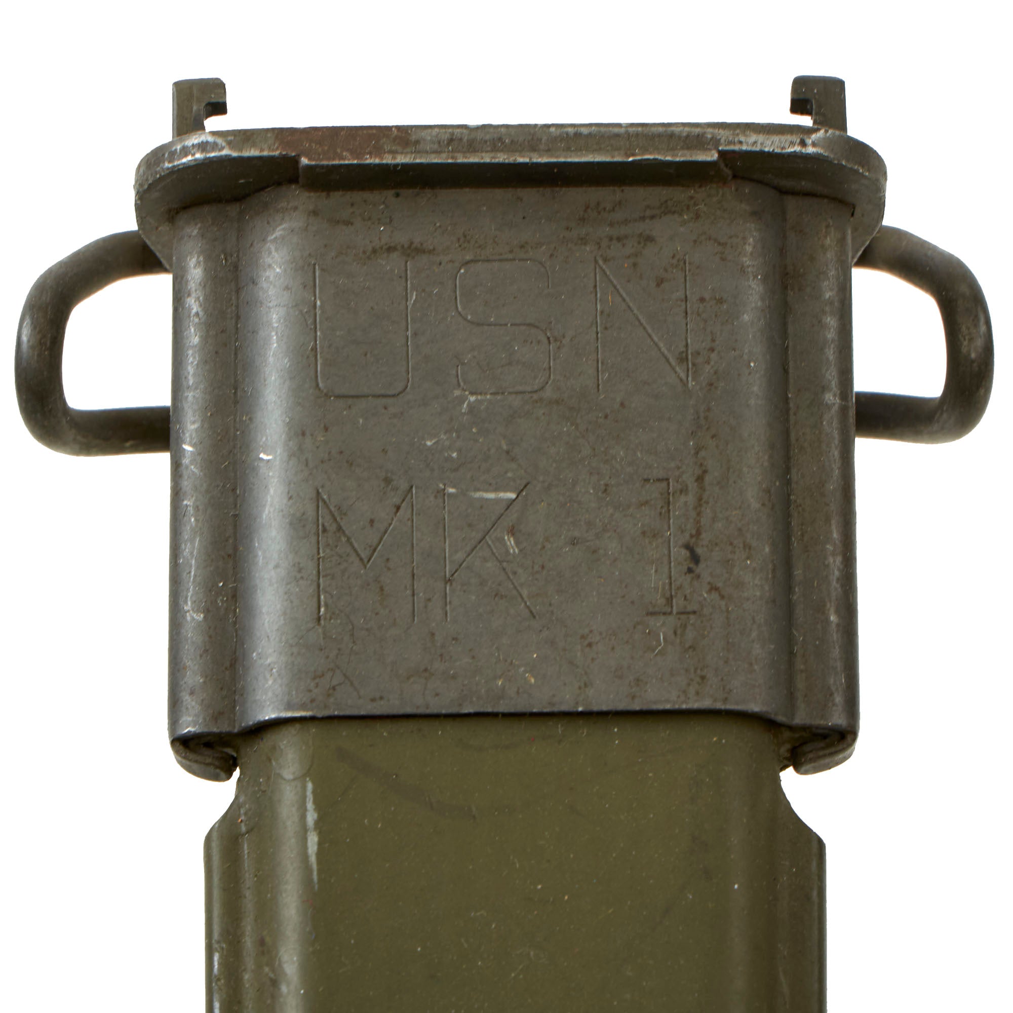 The original M3 scabbard is marked U.S.N. MK I on the steel throat over the "Flaming Bomb", and is in very good condition. The B N marking on the underside of the metal throat lip indicates manufacture by Beckwith Manufacturing, who produced a variety of thermoplastic impregnated cotton fabric scabbards during the war. The N is for New England Pressed Steel, who made the steel throats under contract with Beckwith. The throat of the scabbard is missing most of the original finish, with a bit of past oxidation showing. The scabbard body has no cracks or major chips, and the paint does show heavy wear.