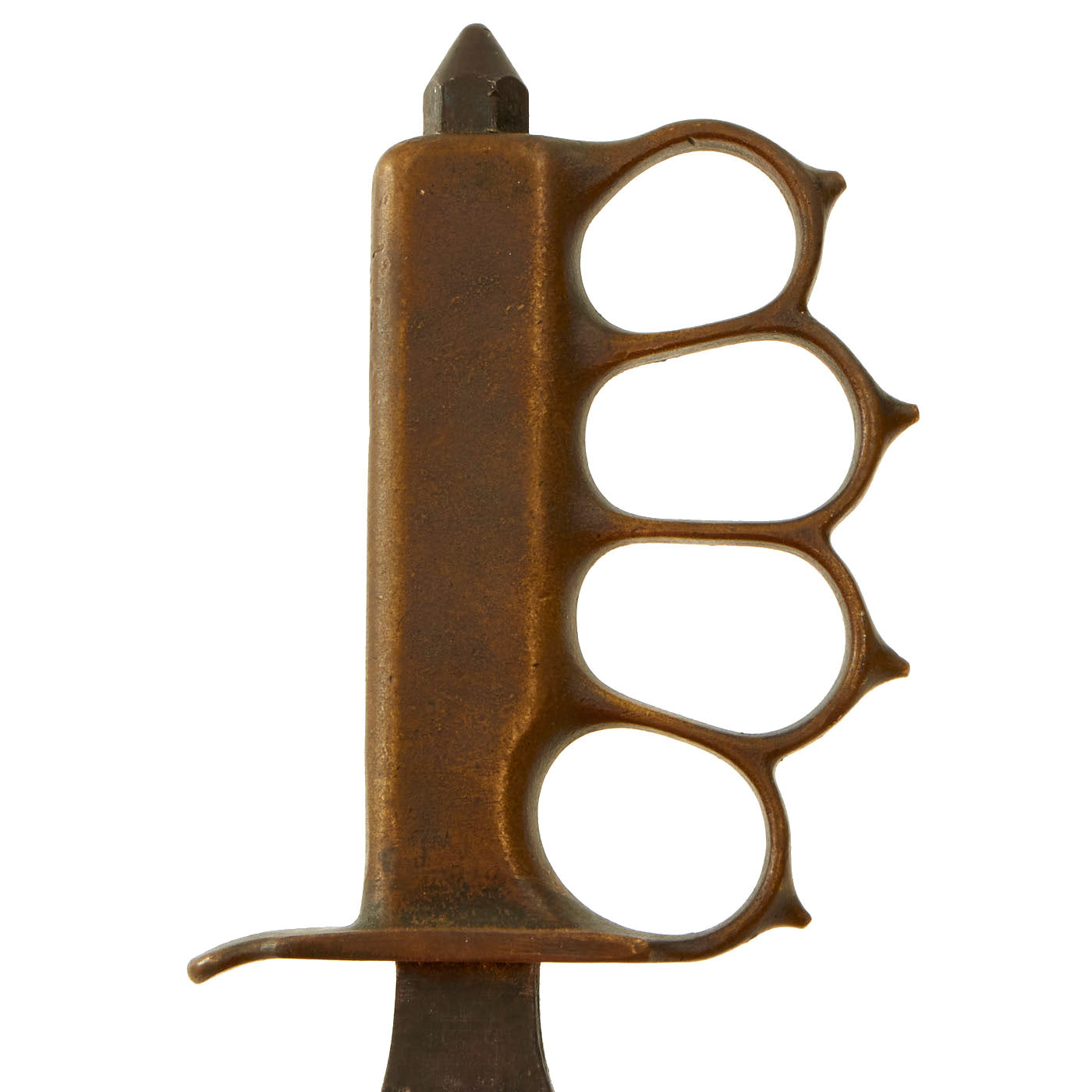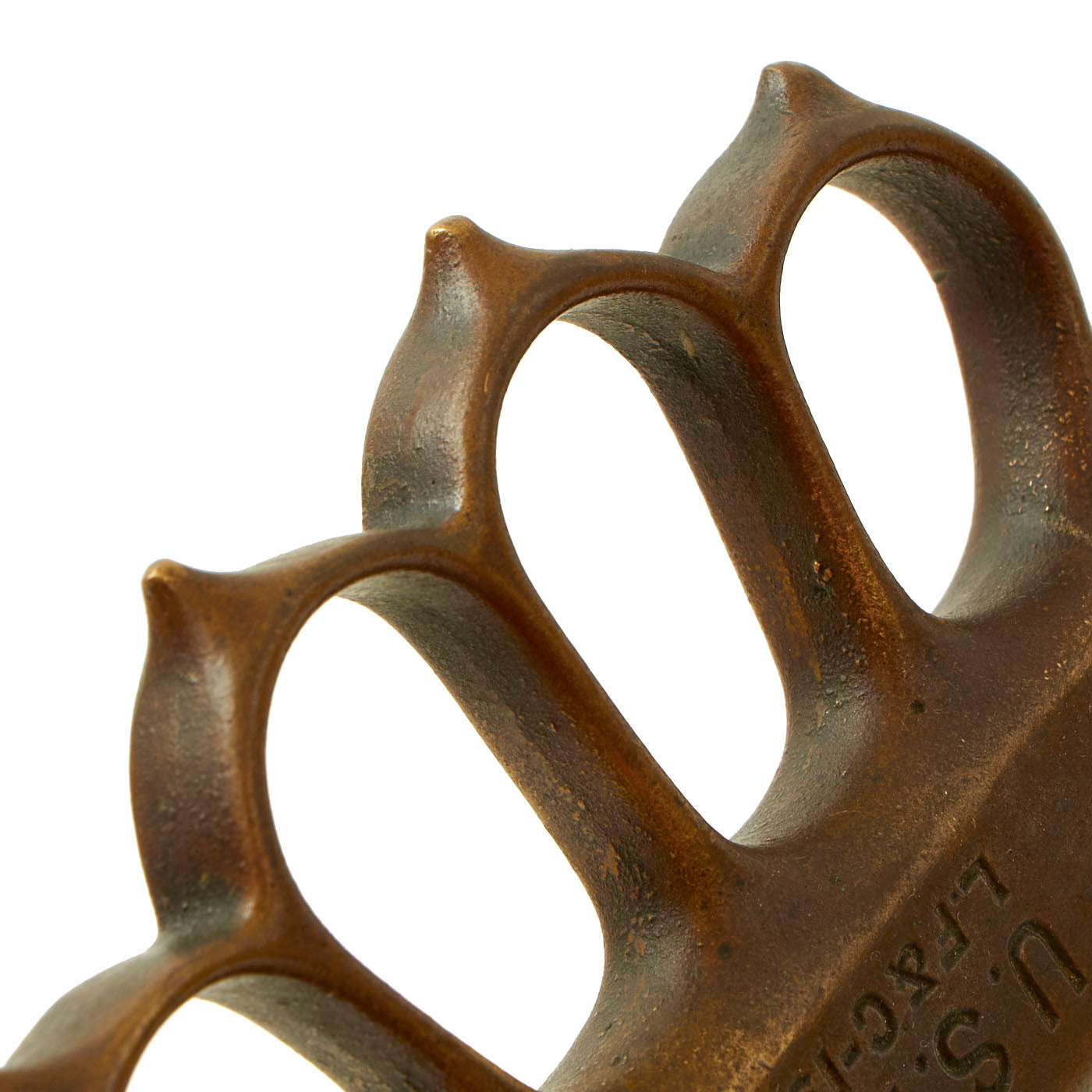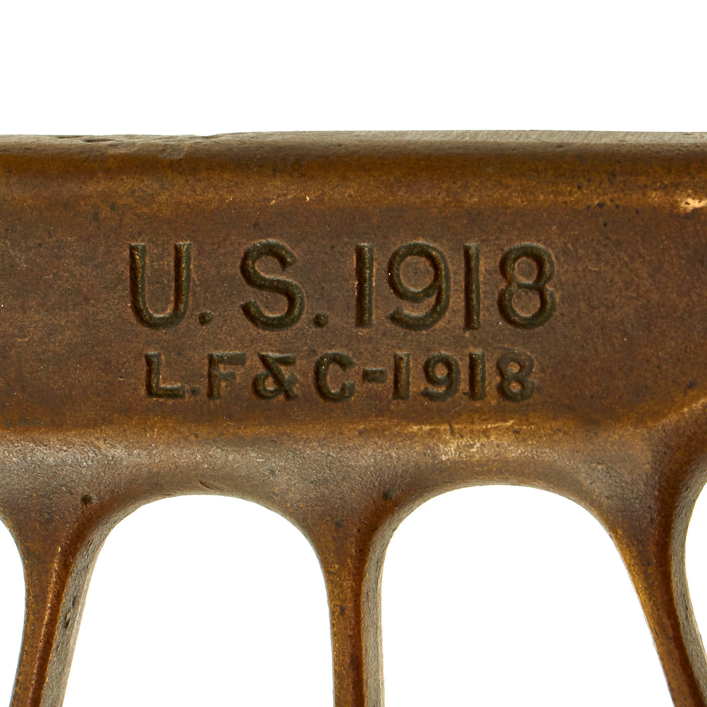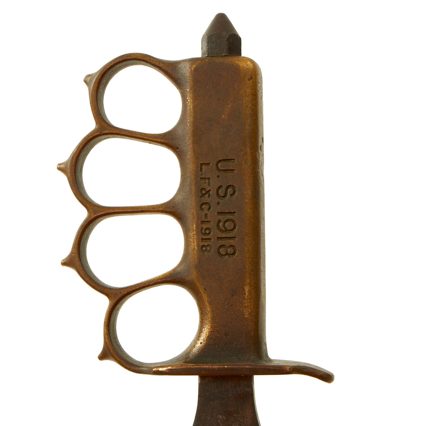 Original Item: Only One Available. The U.S. Model 1918 Mark I Trench Knife was the second major "Knuckle Knife" to be officially adopted and issued to the US military. It was developed for use in the horrific trench warfare that typified the stalemate on the Western Front during the latter part of World War One and saw use not only there, but during World War Two as well. The knife was manufactured in the United States by Henry Disston & Sons (H.D. & S.) as well as Landers, Frary & Clark (L.F. & C.) and Oneida Community Ltd (O.C.L.). The U.S. M-1918 Mark I Trench Knife is easily identifiable due to its large "brass knuckle" style guard and grip. The knives were 11 ¾" in overall length, with a 6 ¾" dagger style blade. The brass grips were marked U.S. 1918 and with the makers name or initials.