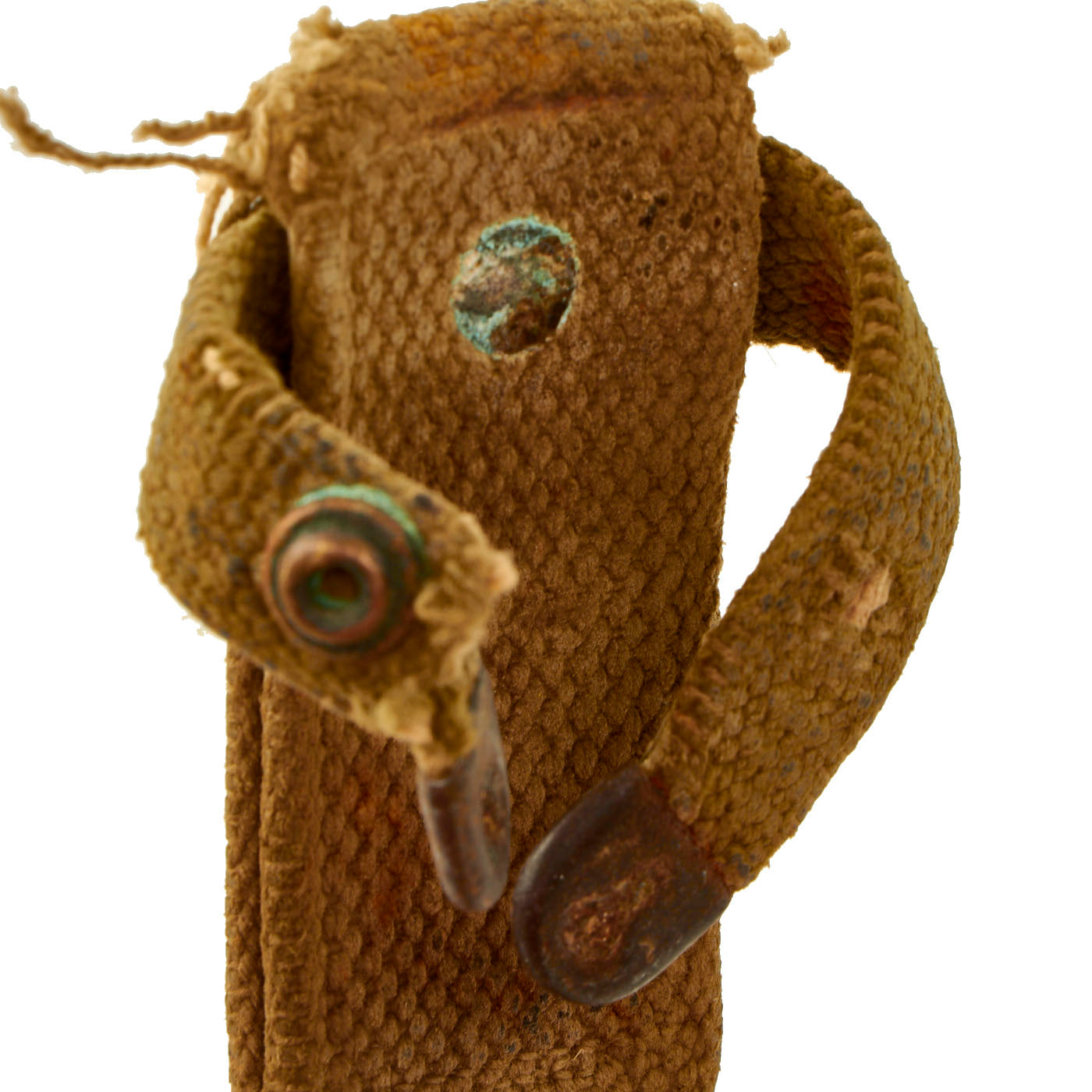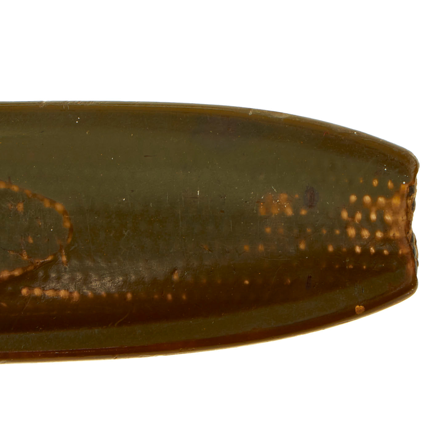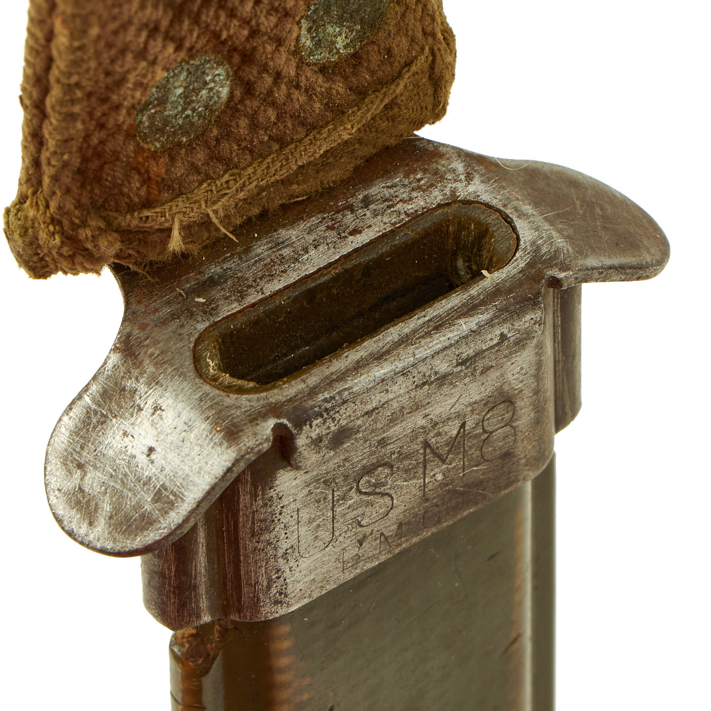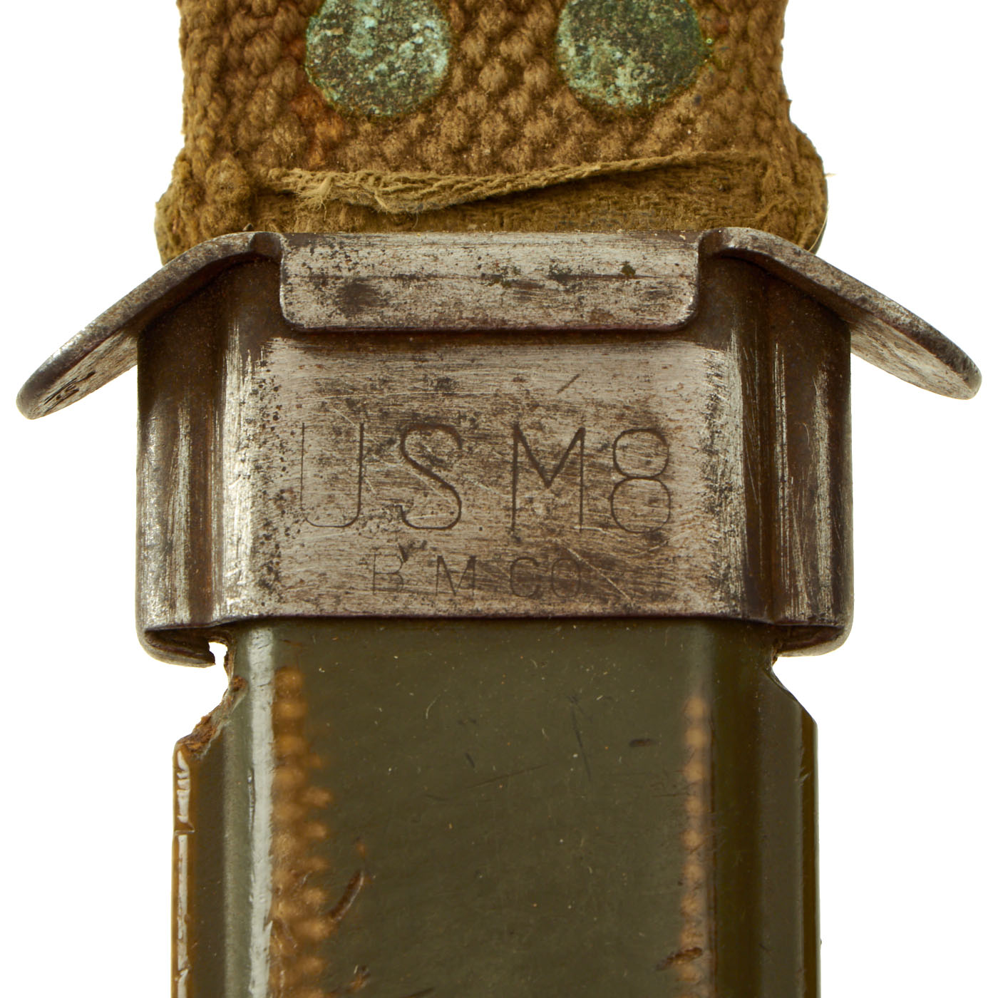 Comes with an OD green thermoplastic impregnated cotton fabric body scabbard marked U.S. M8 / B.M. CO, also in offered in good condition. This design features a fiberglass body, metal throat, and canvas frog and securing strap with a steel pistol belt hook. The plastic inside the throat has been cut out on the sides to accommodate the slightly wider blade of the Trench Knife. Unfortunately the bottom tip of the scabbard is broken off. This break appears to have been done long ago and may have been done intentionally to find a way to have a drain hole in the scabbard.