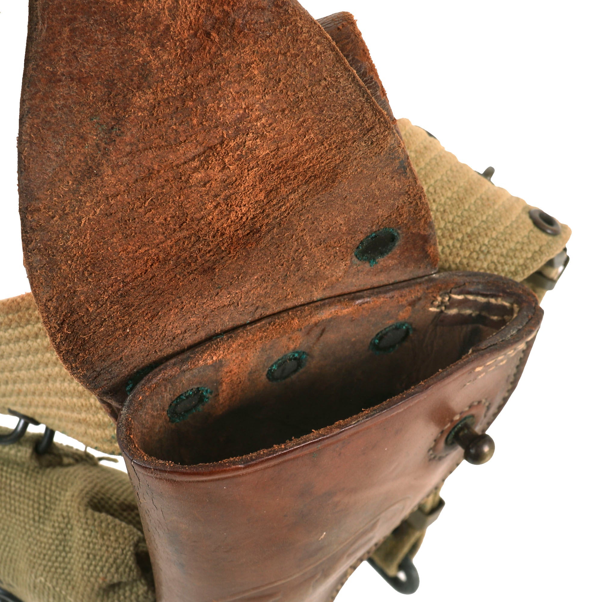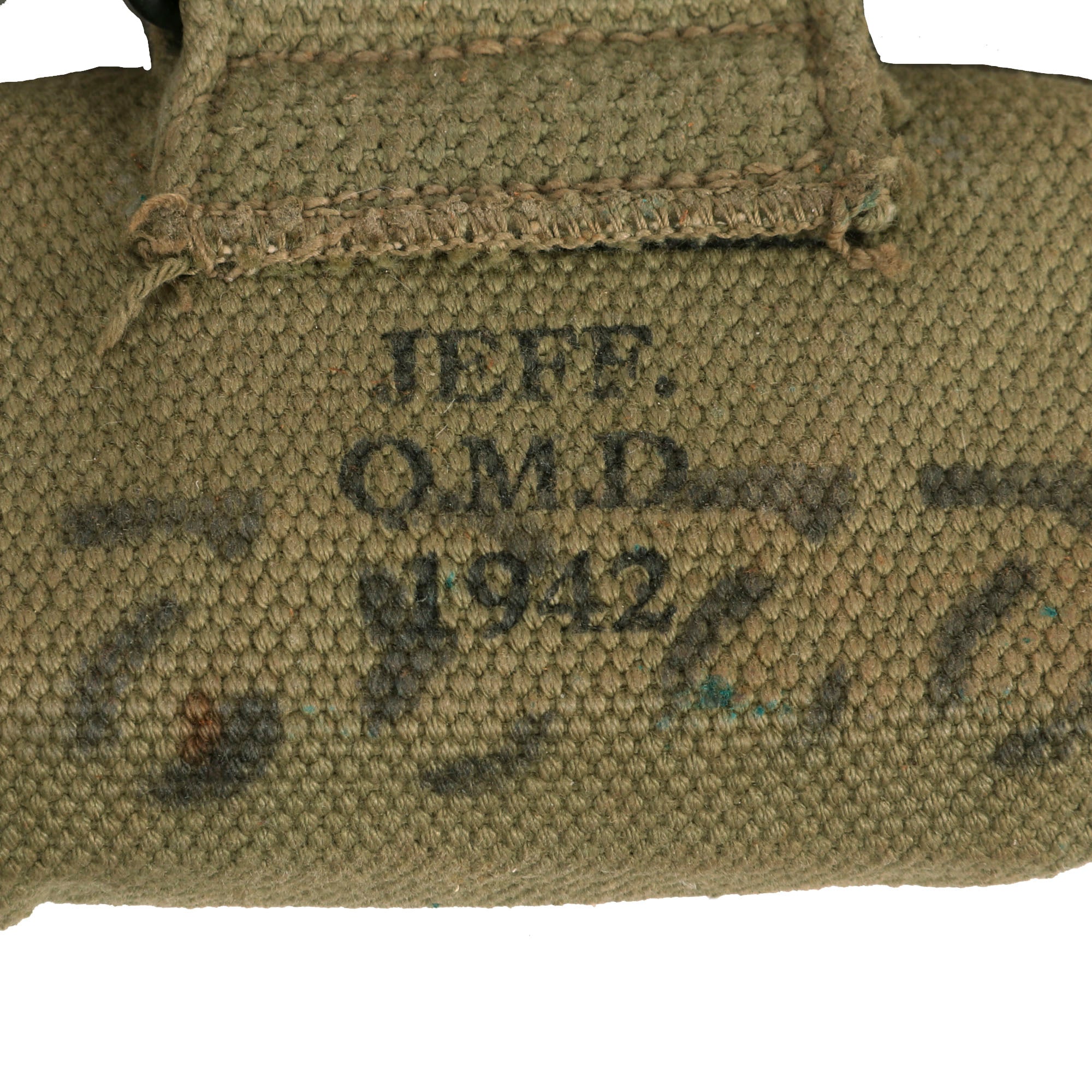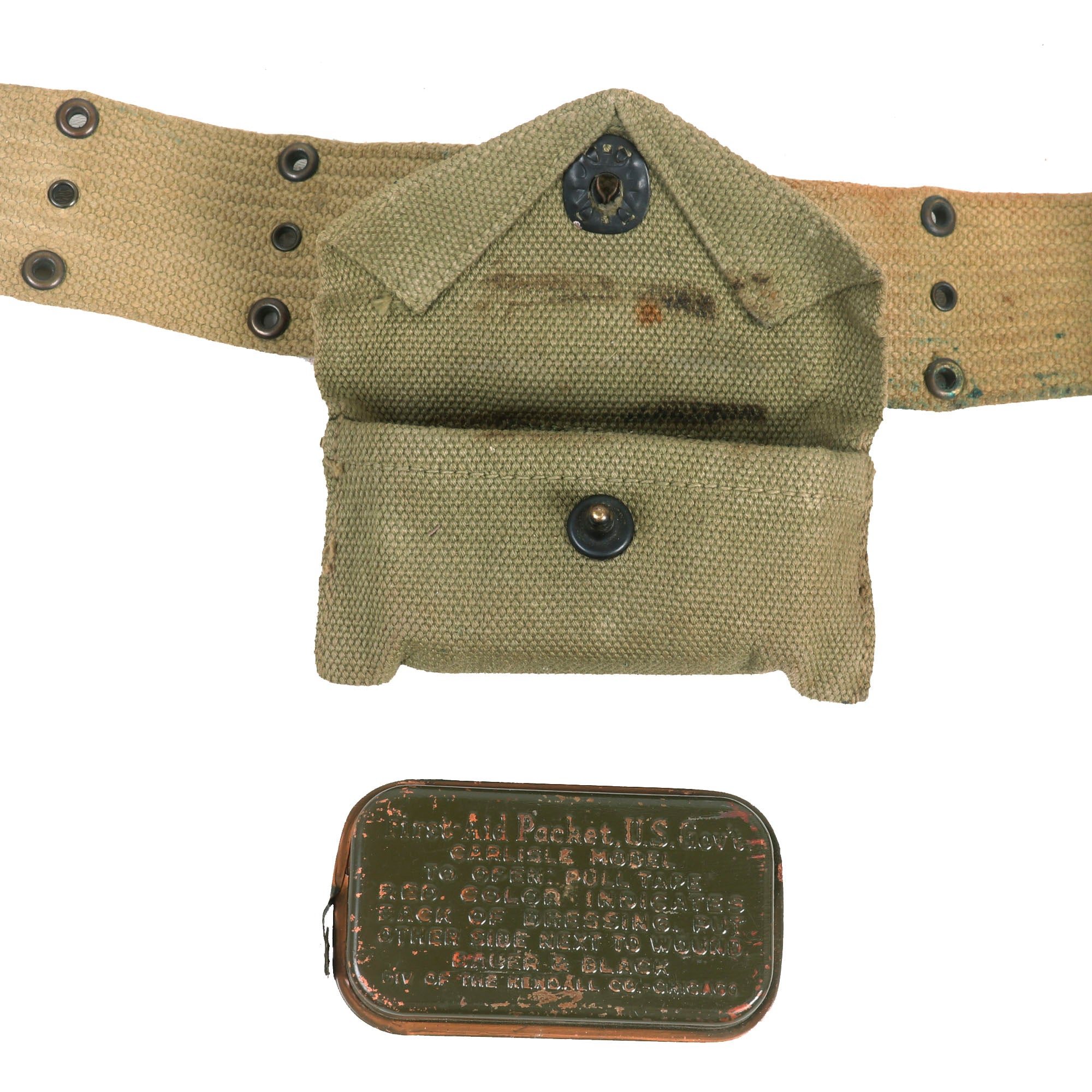 The bandage pouch on this belt is marked JEFF O.M.D. 1942 with 2222 stamped over it. The bandage inside is a WWII Carlisle Model First Aid Packet produced by Bauer & Black in Chicago, Illinois. On the back of the bandage, it reads With Crystalline Sulfanilamide. The bandage is in fantastic condition with most of the paint remaining and very few nicks or dings. The revolver holster shows average service use, certainly seeing use during both World Wars. The belt is undated.