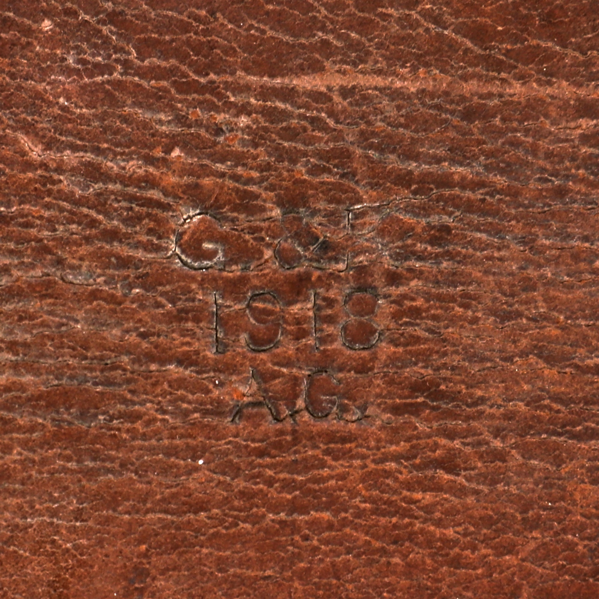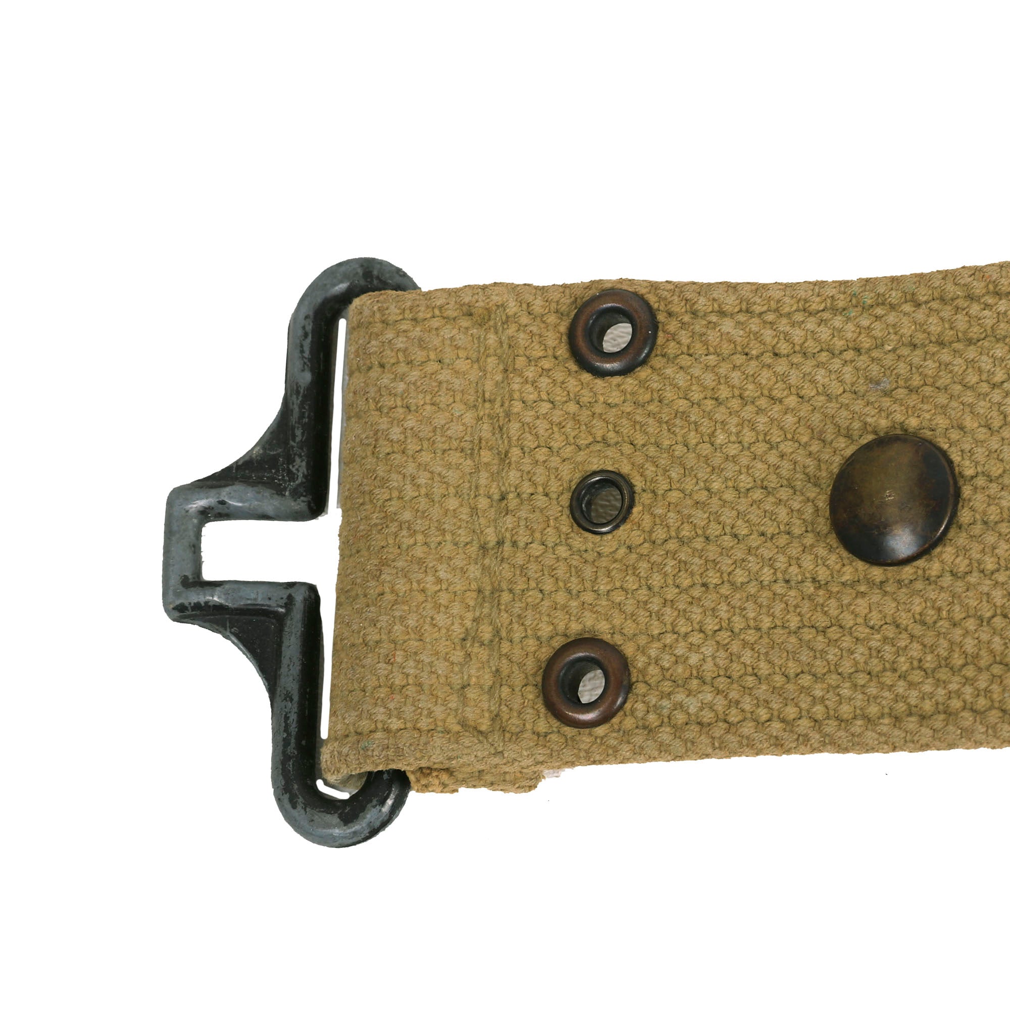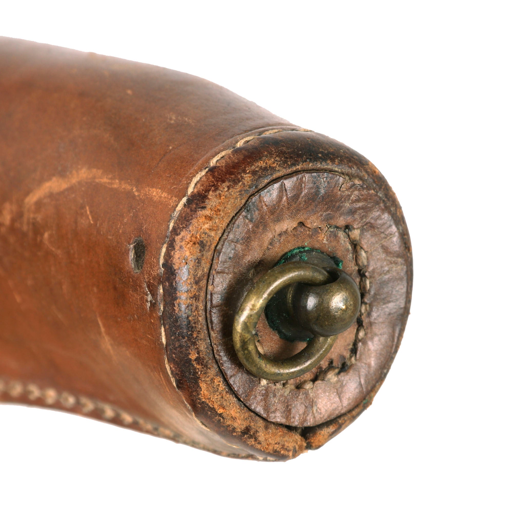 The bandage pouch on this belt is marked JEFF O.M.D. 1942 with 2222 stamped over it. The bandage inside is a WWII Carlisle Model First Aid Packet produced by Bauer & Black in Chicago, Illinois. On the back of the bandage, it reads With Crystalline Sulfanilamide. The bandage is in fantastic condition with most of the paint remaining and very few nicks or dings. The revolver holster shows average service use, certainly seeing use during both World Wars. The belt is undated.