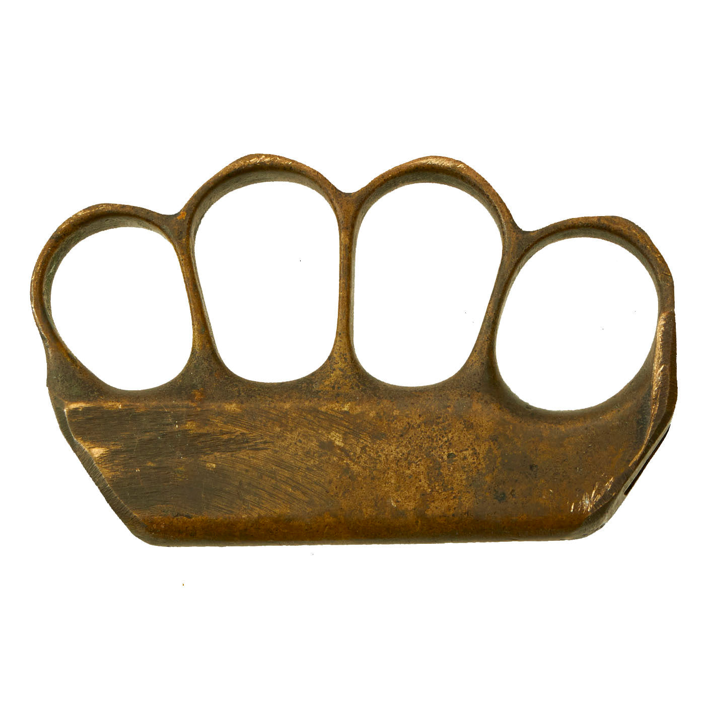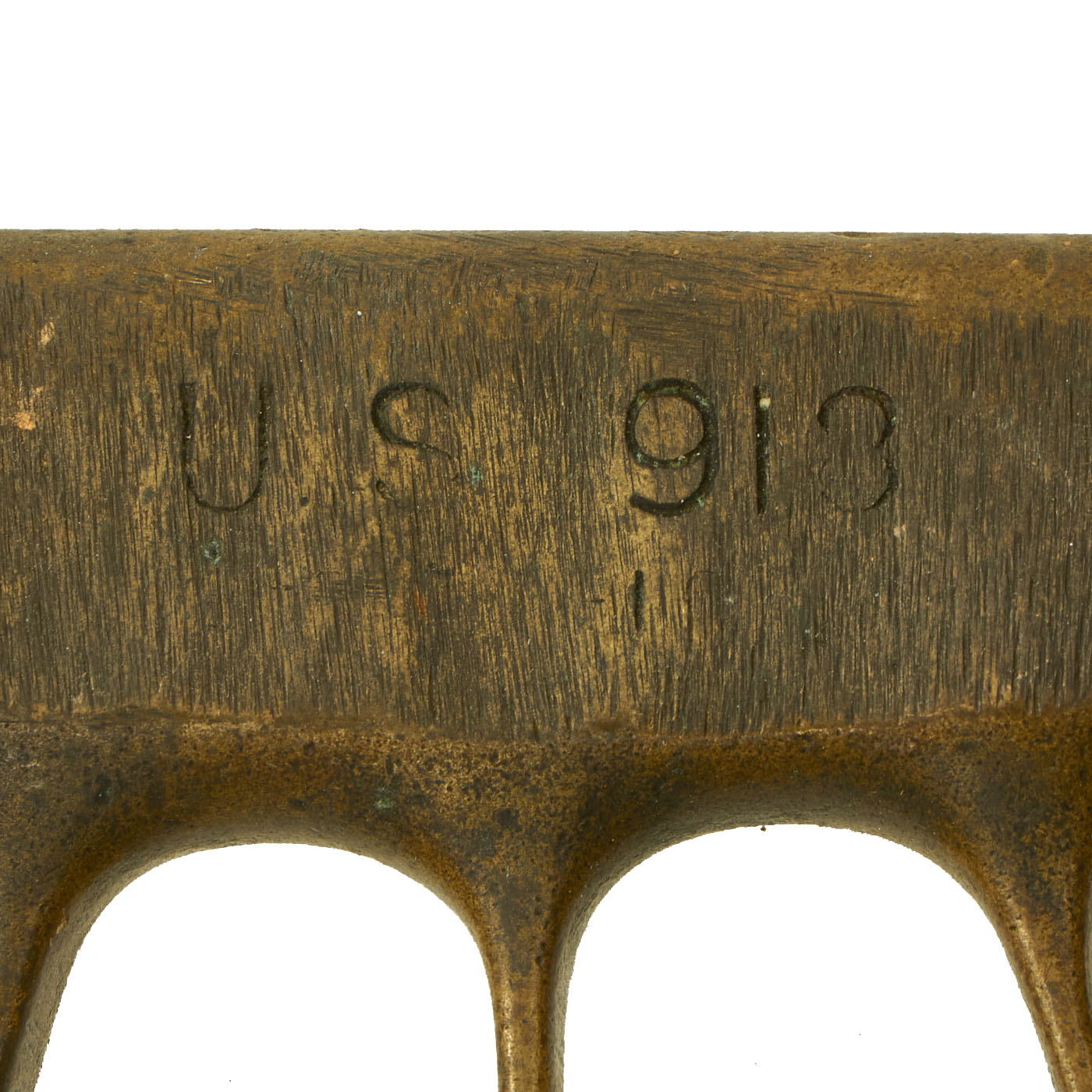 This example of the U.S. Model 1918 MkI trench knife is a modified version and was more than likely carried during WWII, as these so often were. This is just the knuckle duster portion of the combat knife with both end ground down to give it a slimmer appearance. The brass is tarnished and has a lot of grinding marks present from when the ends were cut off. We believe this to have been taken from an L.F. & C example due to the construction of it.