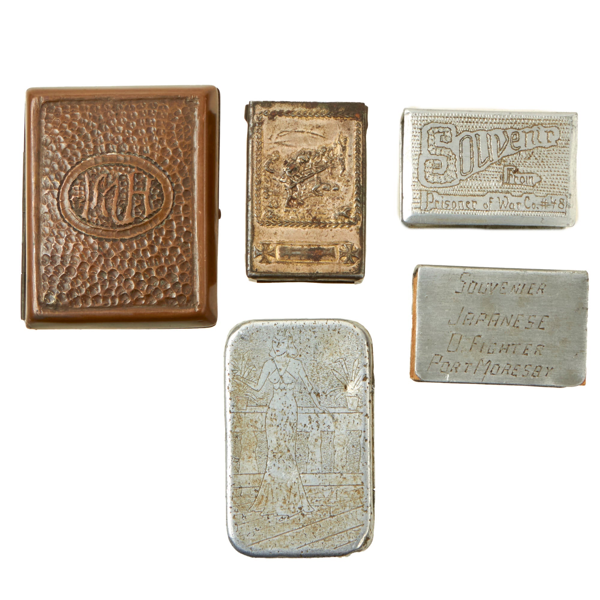 Original Items. Only One Lot Available. This is a fantastic set of five Souvenir Trench Art Matchbox Holders, all being personalized and some being named! They range from World War I into World War II.