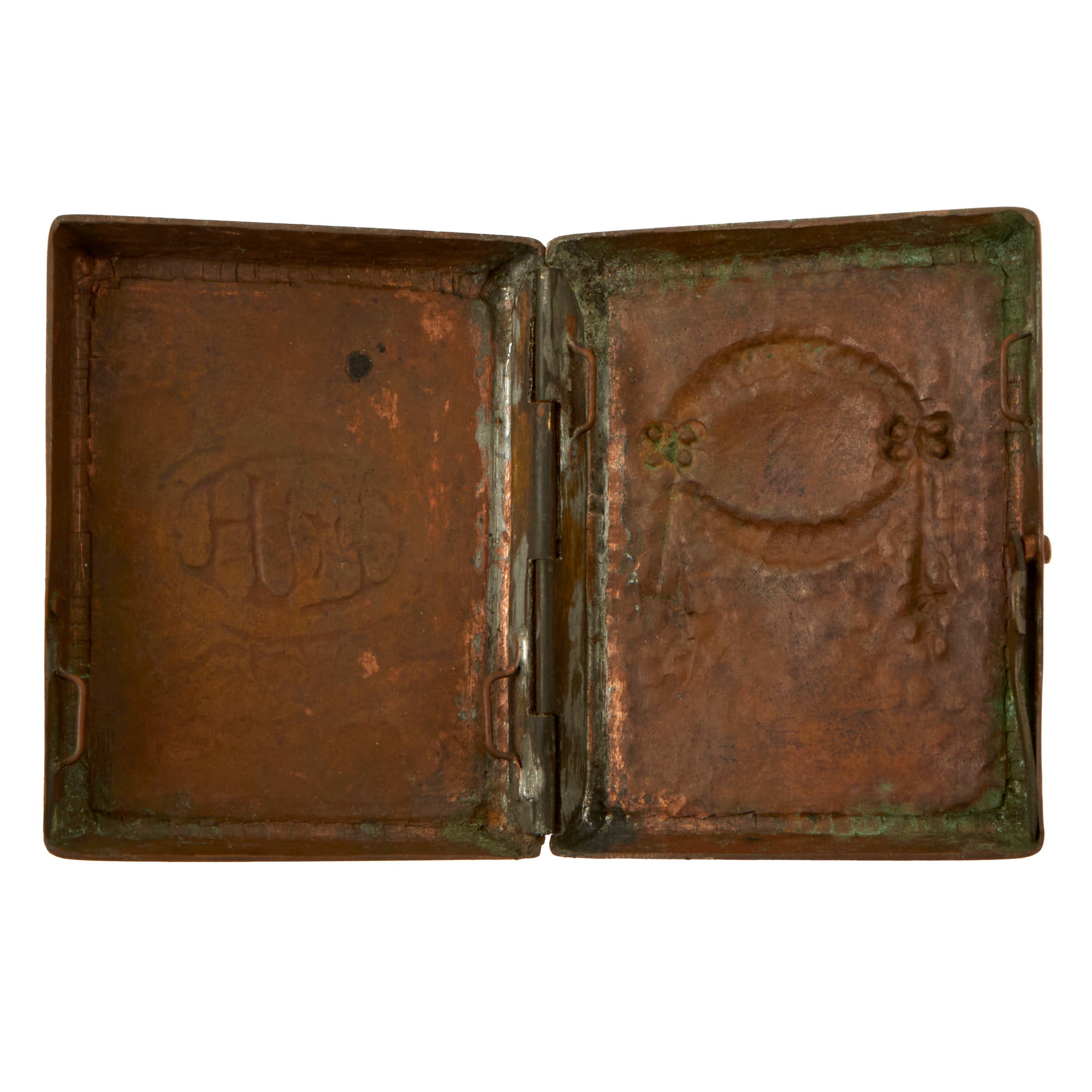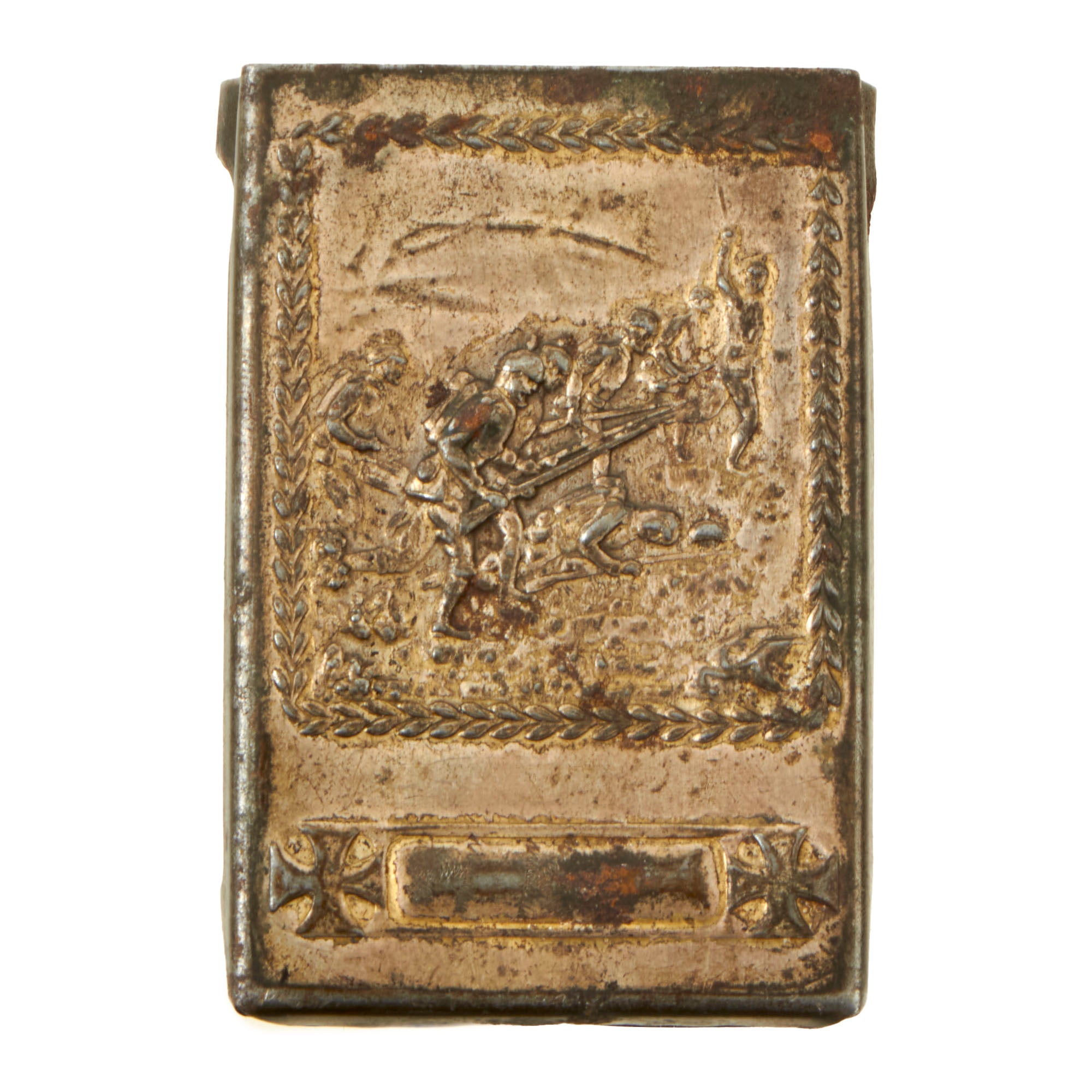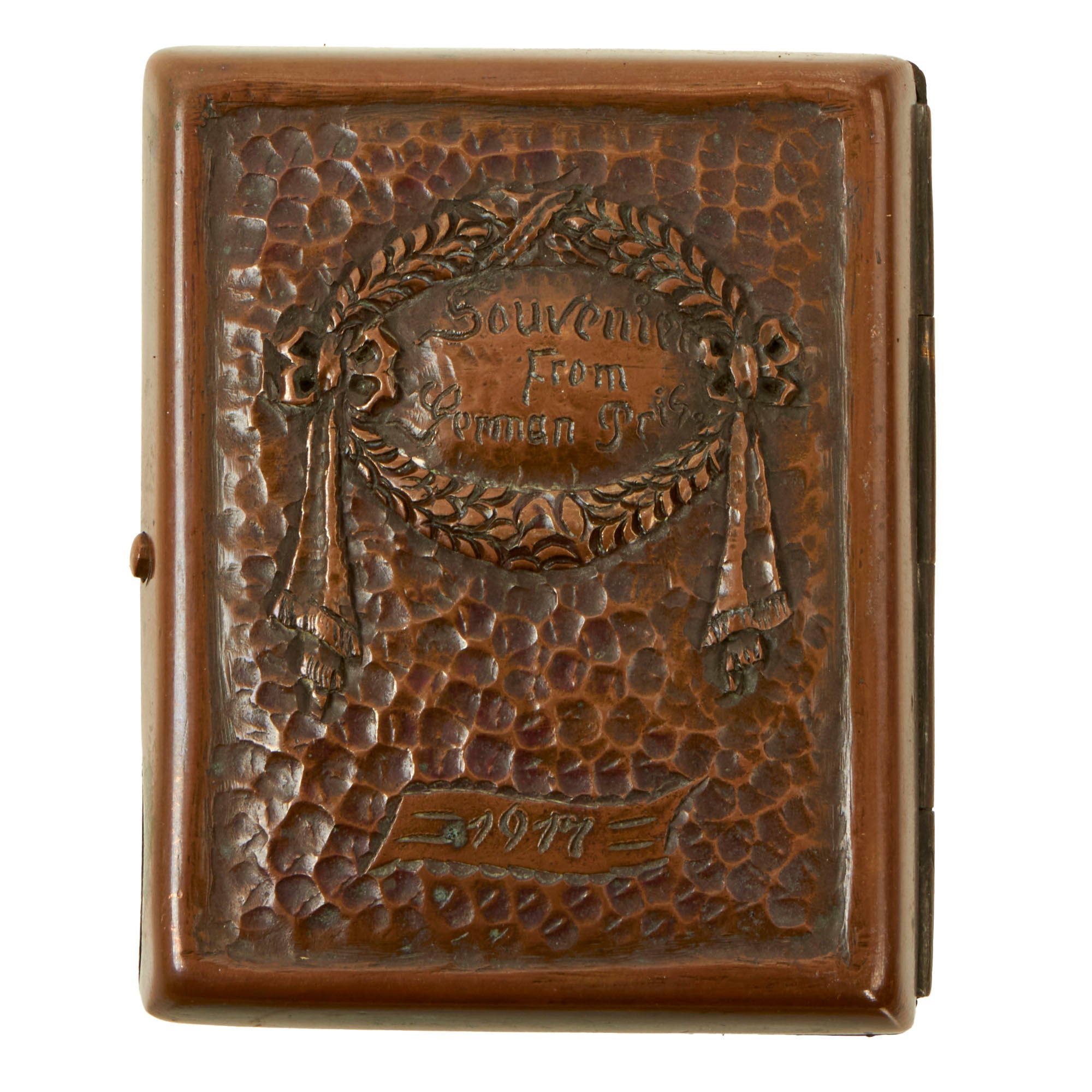 • One large WWI brass cigarette case with a wreath on the front reading SOUVENIR FROM GERMAN PRIS. (PRISONER) 1917 with the initial M.A.H. on the back. Measures 3¼ x 2¾ x ¾”.