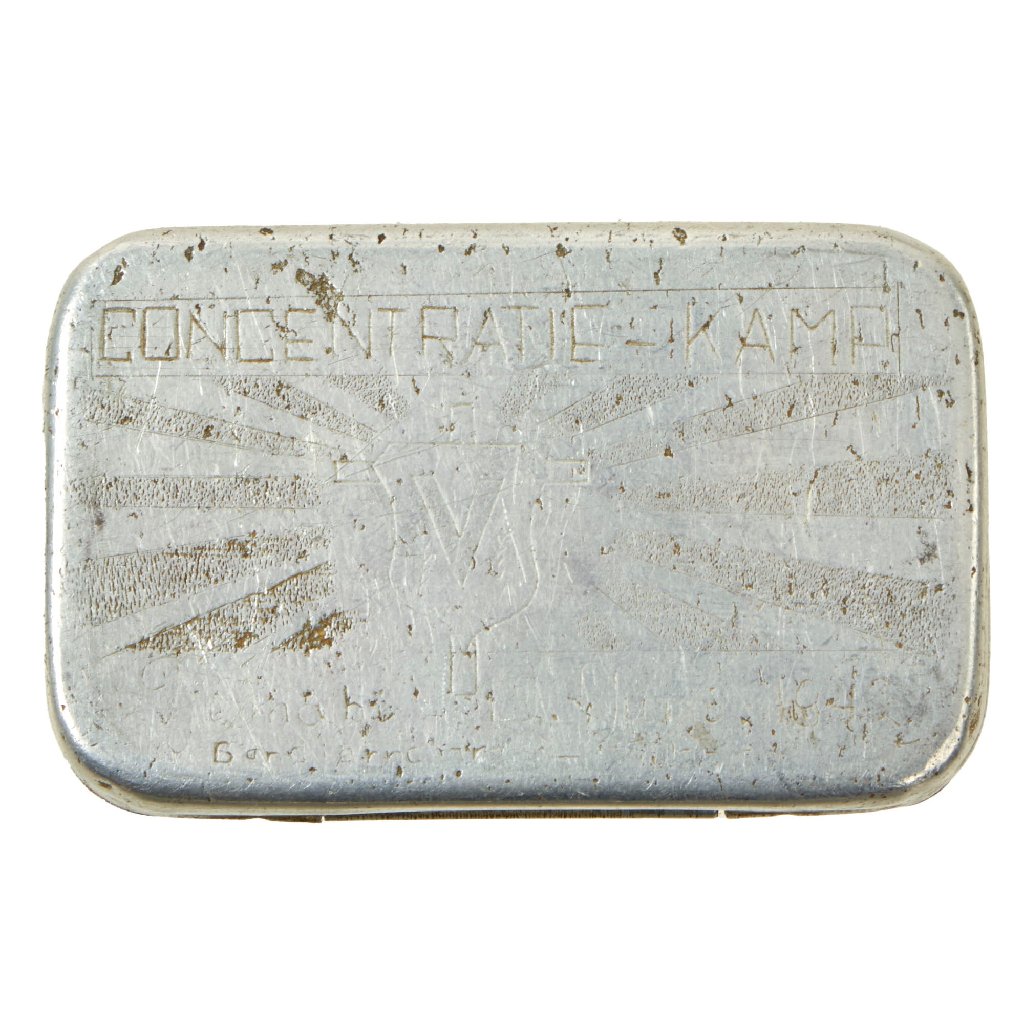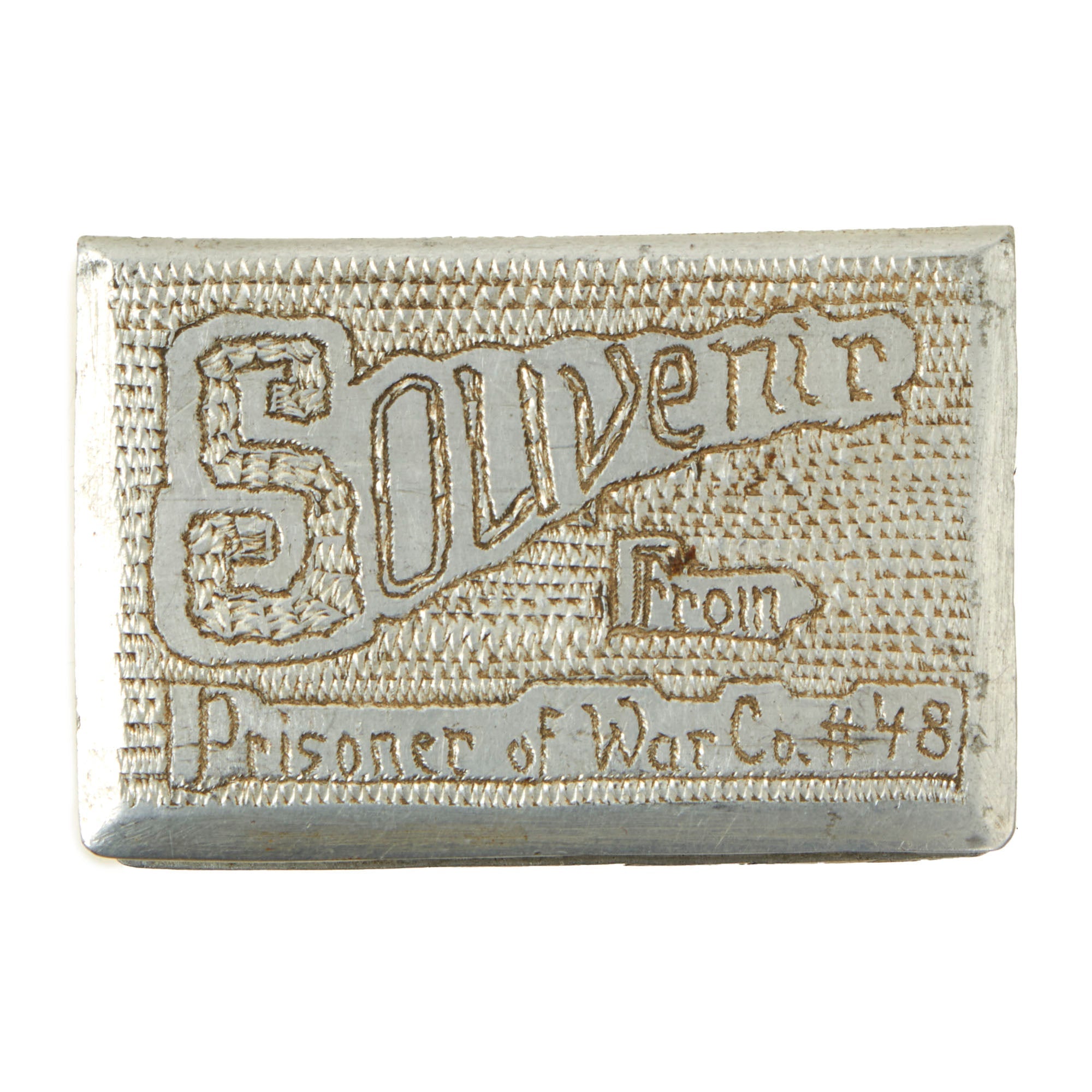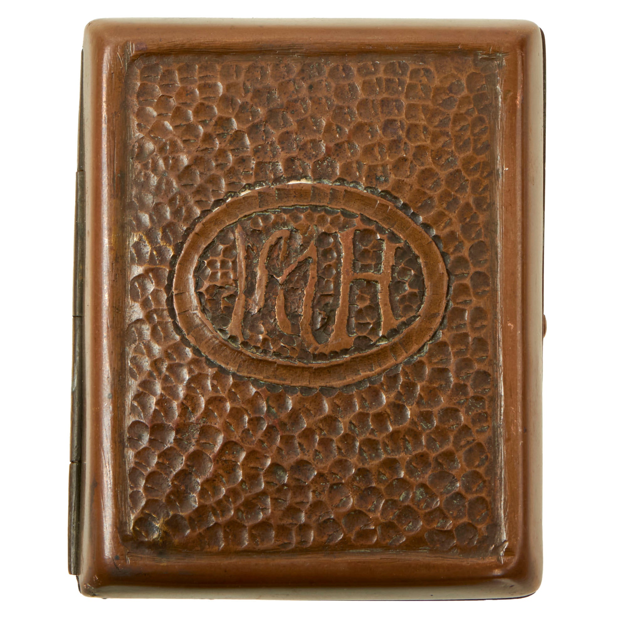 • One large WWI brass cigarette case with a wreath on the front reading SOUVENIR FROM GERMAN PRIS. (PRISONER) 1917 with the initial M.A.H. on the back. Measures 3¼ x 2¾ x ¾”.