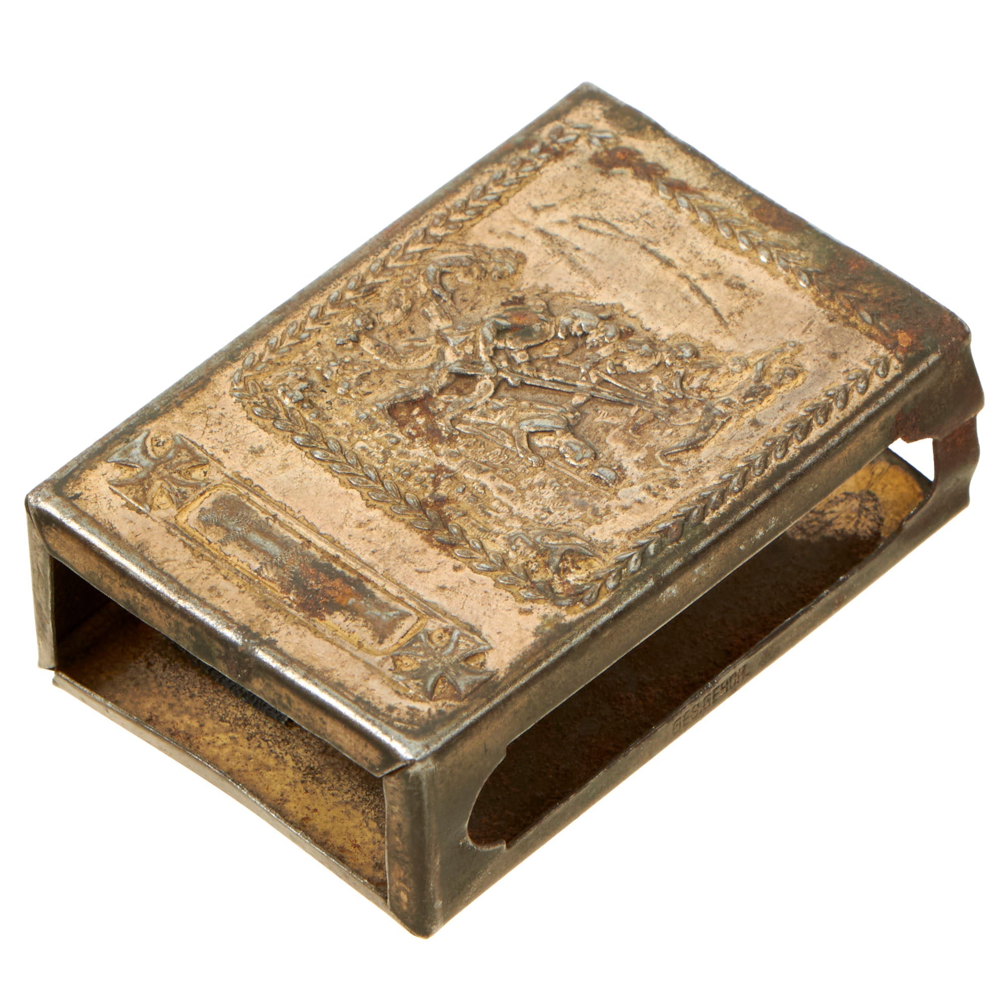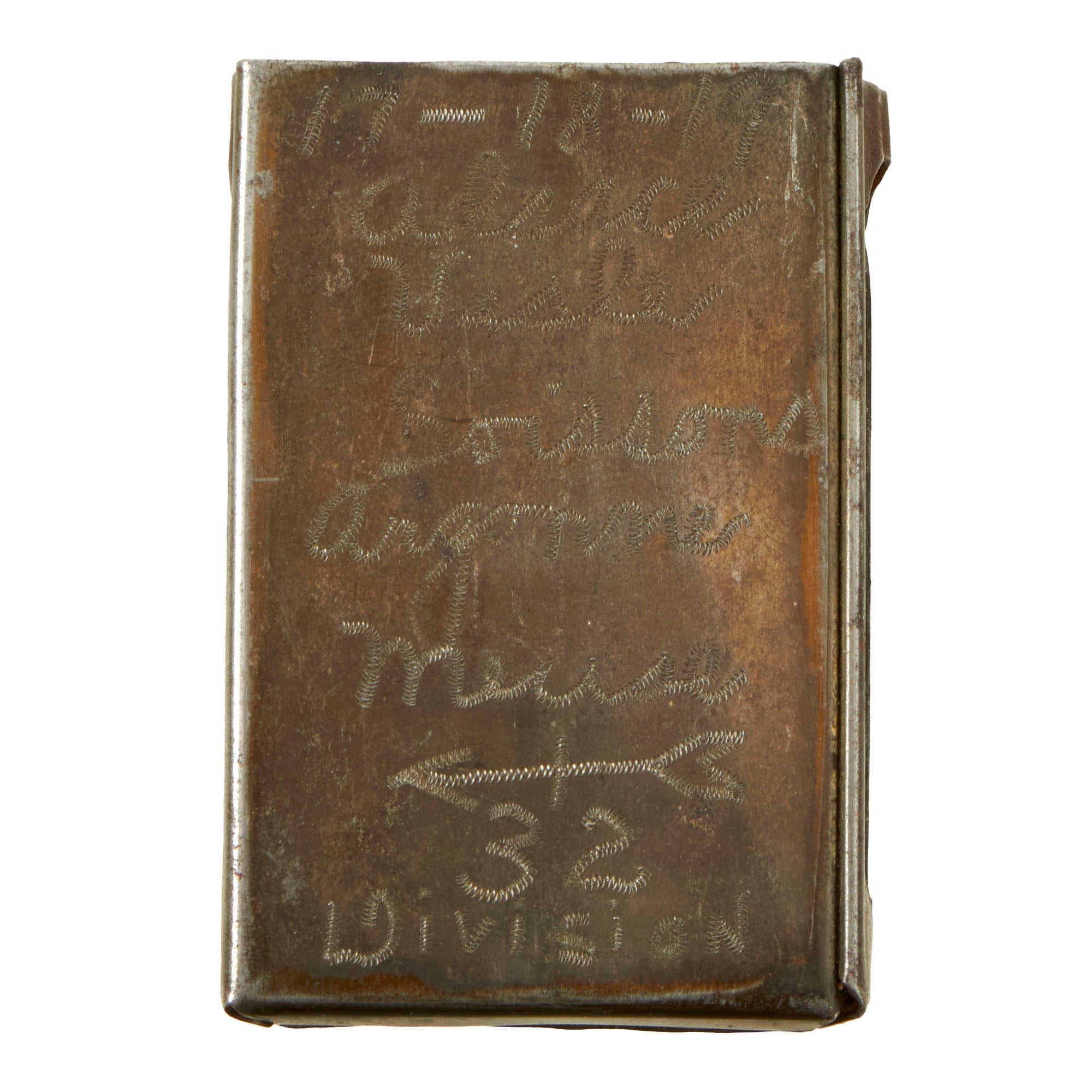• 32nd Division WWI matchbook holder with scene depicting Germans with Iron Crosses. Back is engraved 17-18-19 ALSACE VESLE SOISSONS ARGONNE MEUSE (RED ARROW INSIGNIA) 32 DIVISION. Very scarce division that saw a ton of combat. 2½ x 1½ x ¾”.