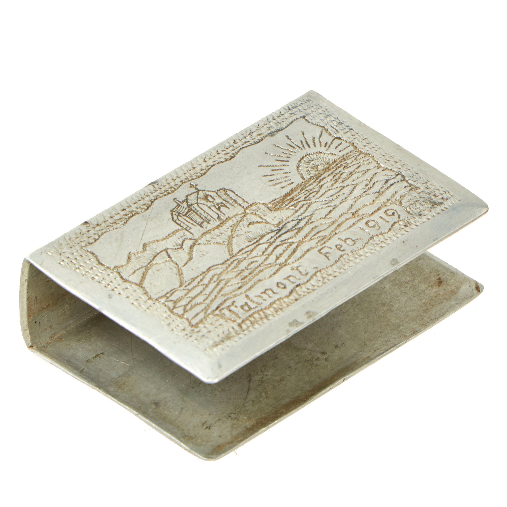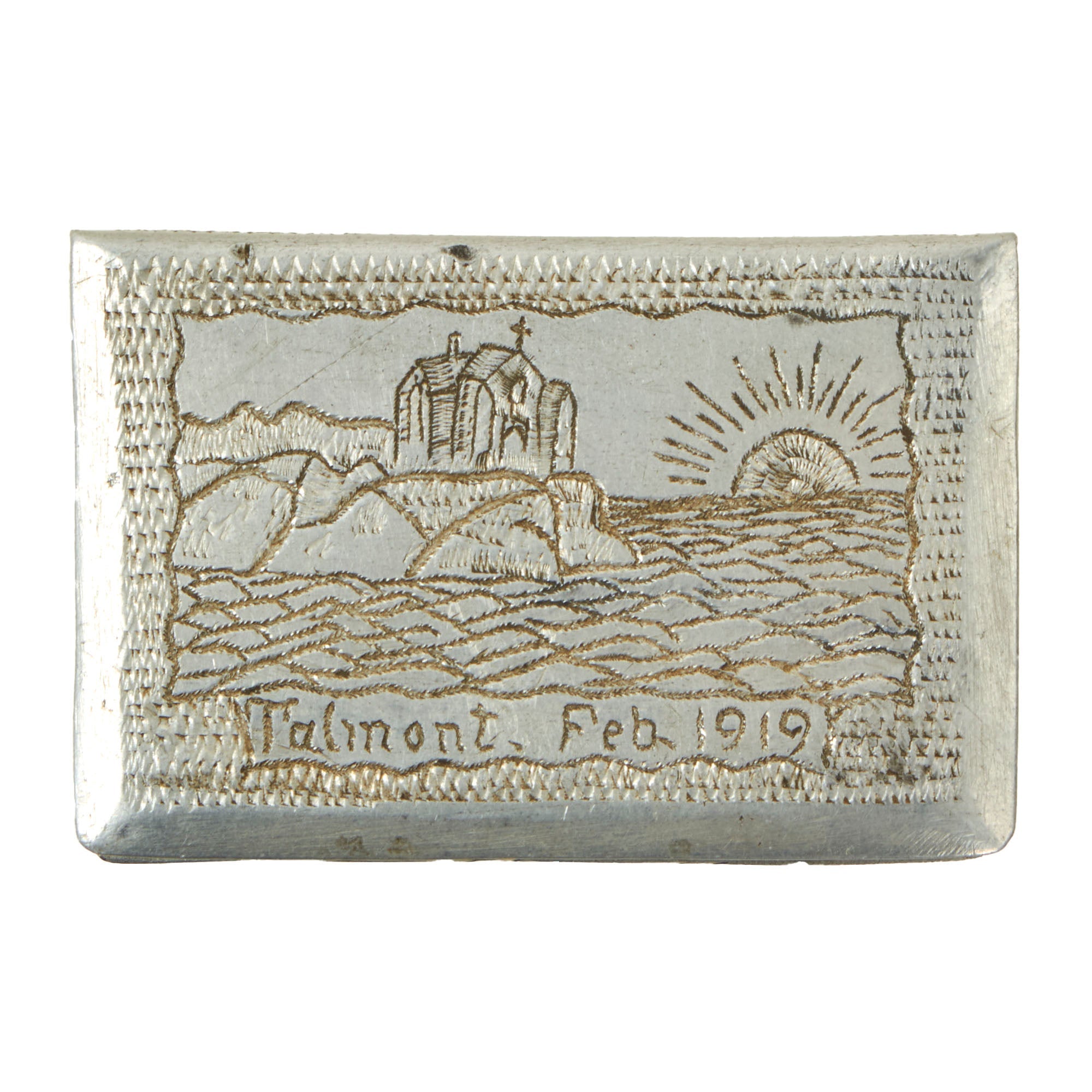 • WWI Prisoner of War Company #48 Souvenir matchbox holder depicting Church on coast of Talmont, February 1919. Named to Thomas J. Lee, requires more research! 2¼ x 1½ x ¾”.