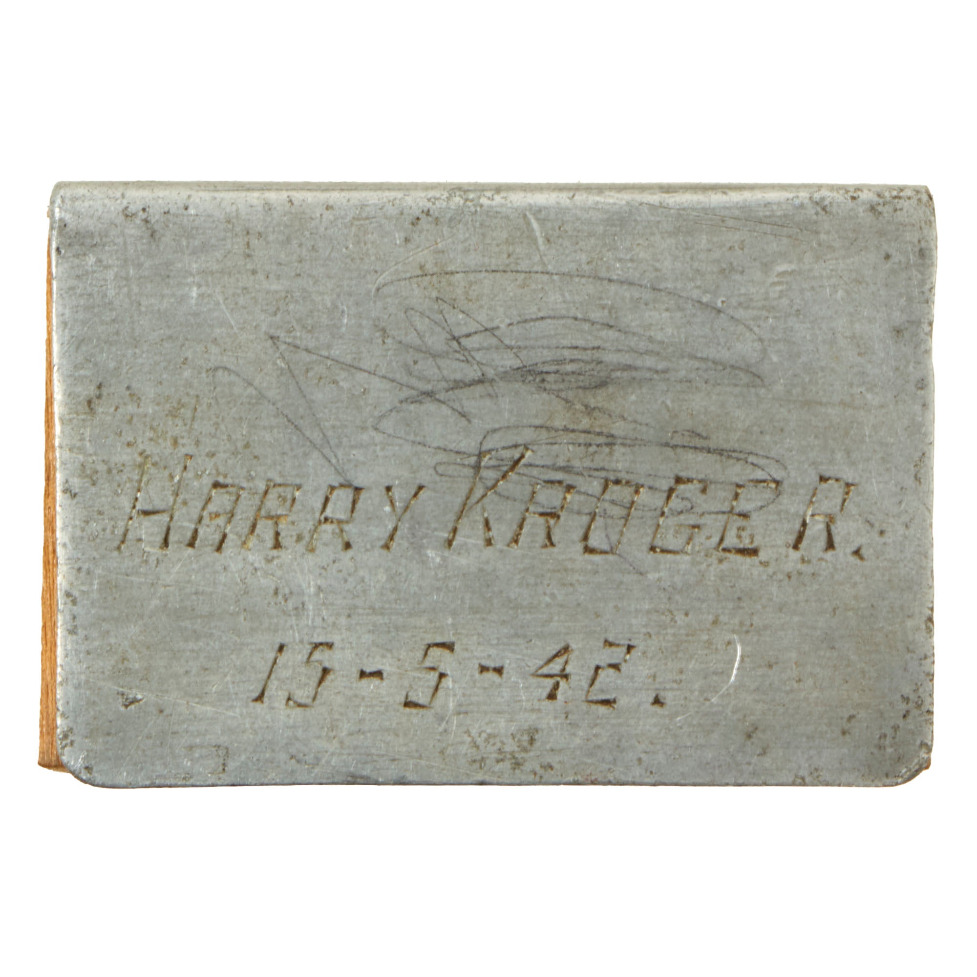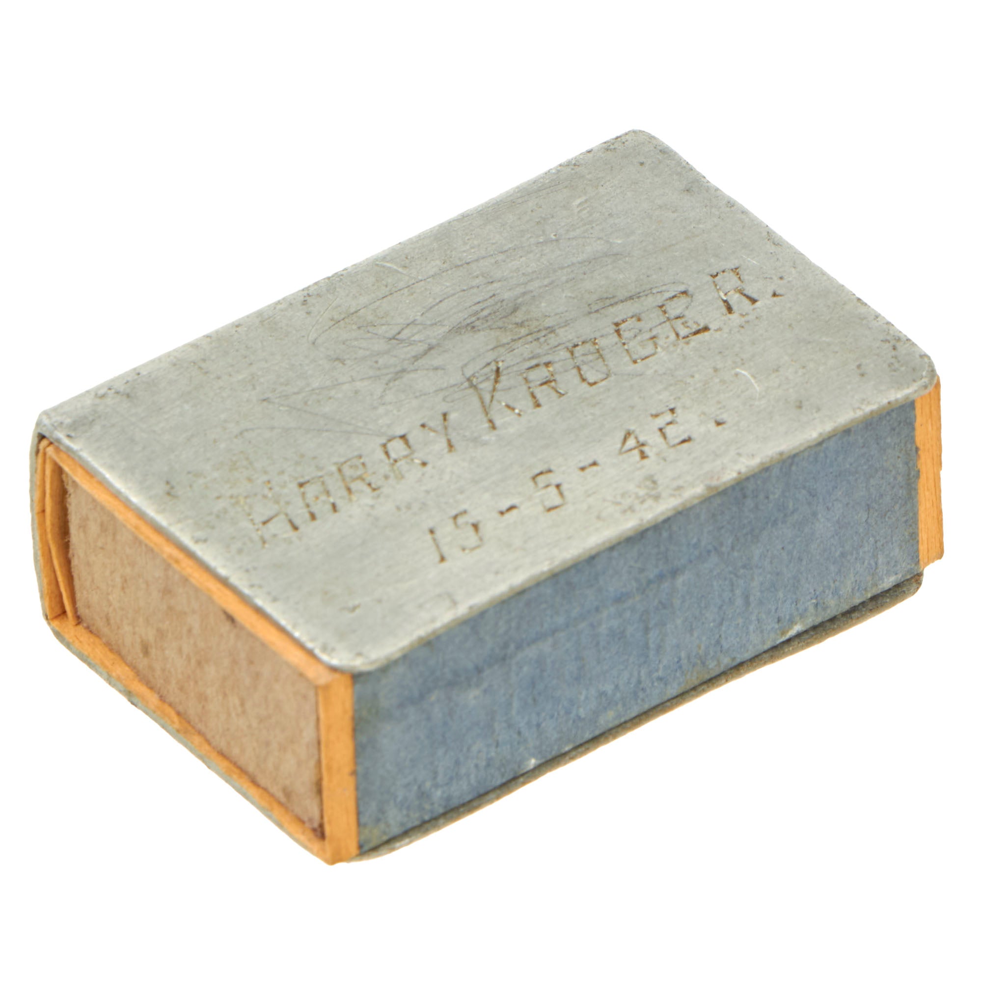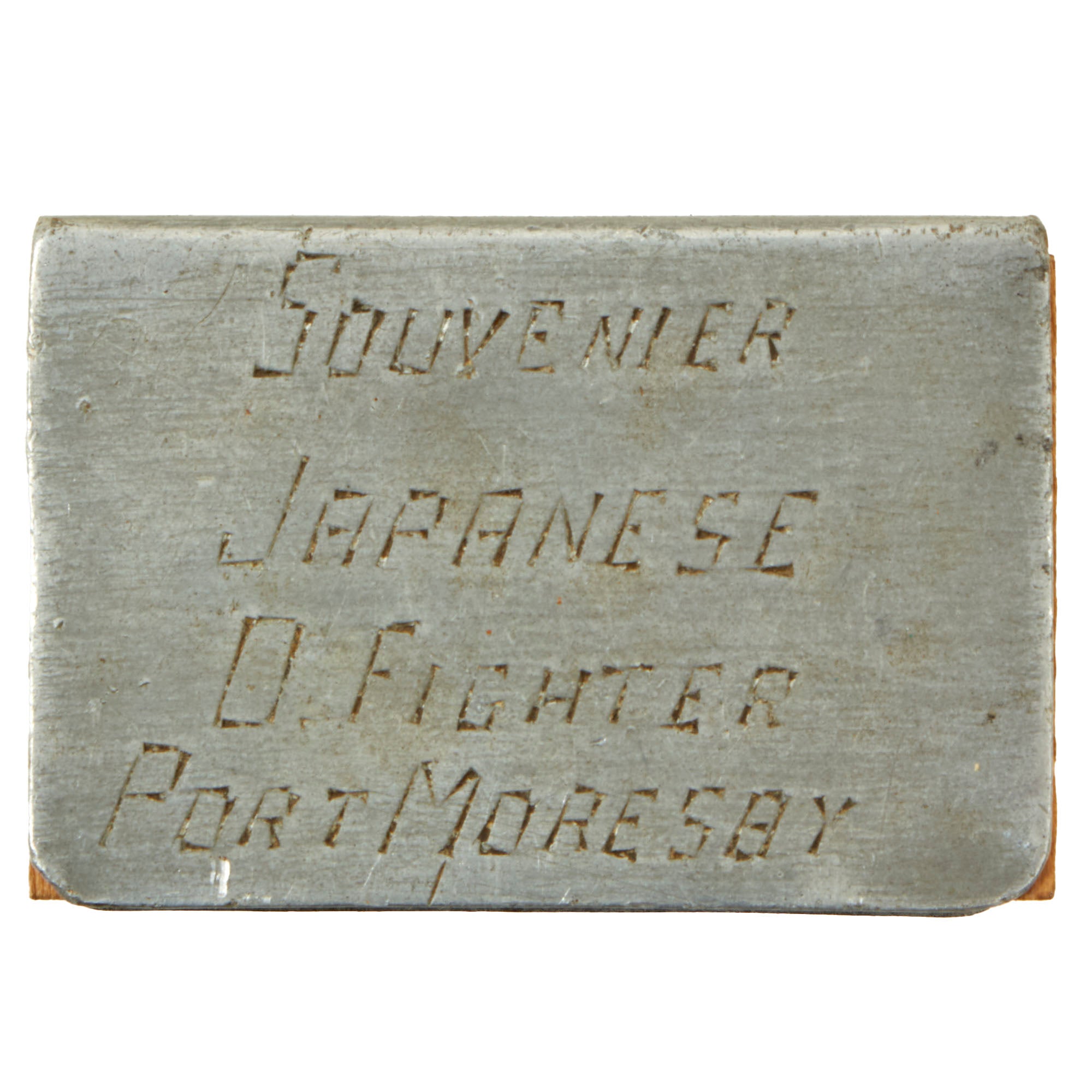 • WWII Souvenir Matchbox holder made from Japanese Zero Fighter Aluminum, Port Moresby (New Guinea). Named to Harry Kroger 15-5-42 (May 15th, 1942). This example has its original matchbox, Independence Safety Matches. Some matches are still inside! A great piece. 2¼ x 1½ x ¾”.