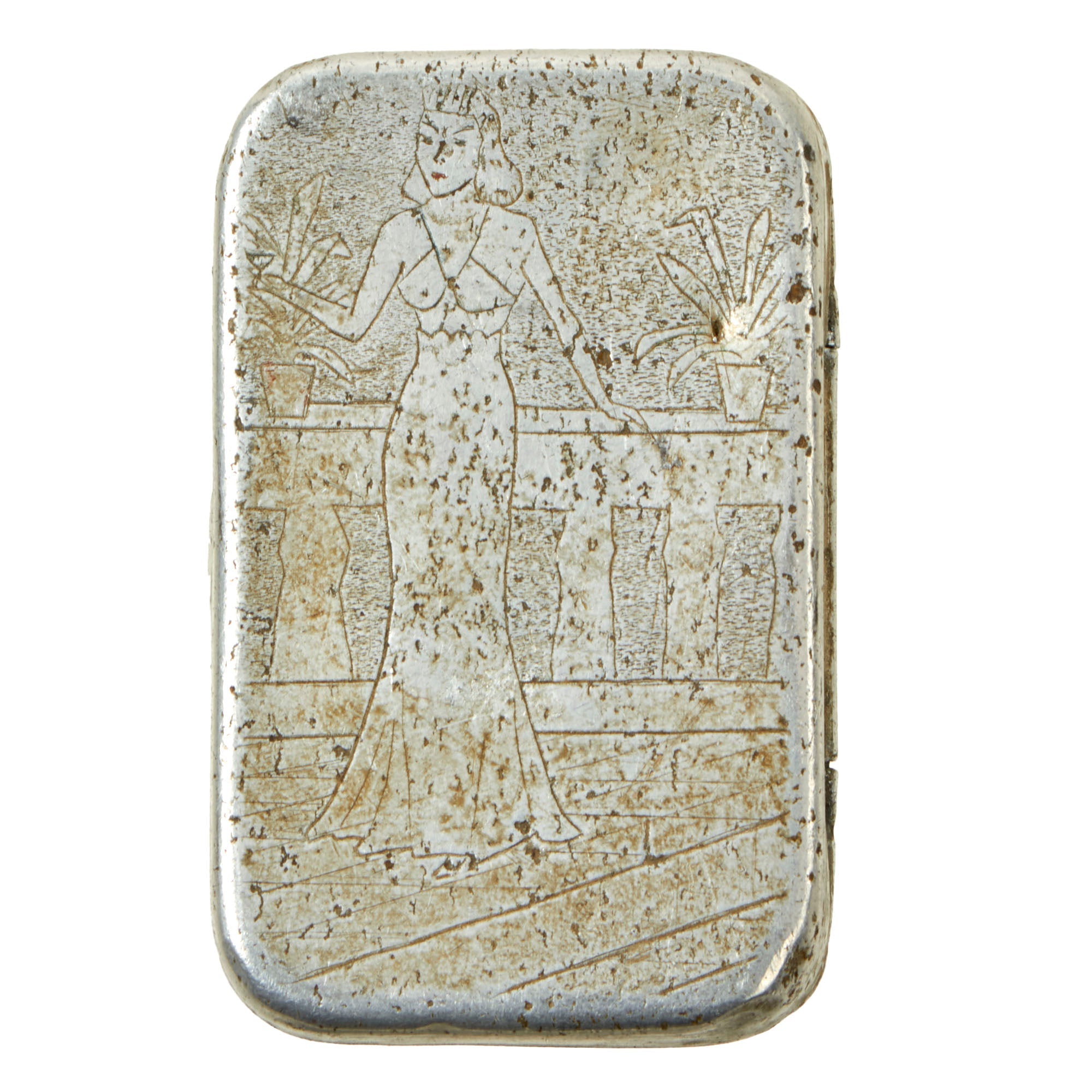 • WWII German Souvenir matchbox holder depicting a beautiful woman in a dress on a balcony. Dated June 12th, 1942. Requires research. 3¼ x 2 x ¾”.
