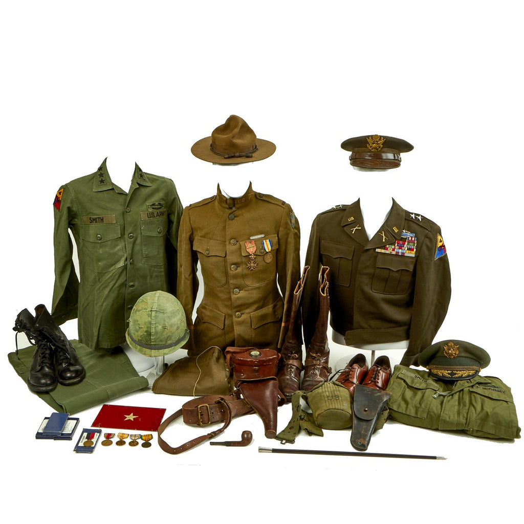 This collection of uniforms belonged to the Smith family. The WWI uniform belonged to General Smith's father, while General Smith he served in WWII and during the Vietnam War. Everything in the photos is included with this collection.