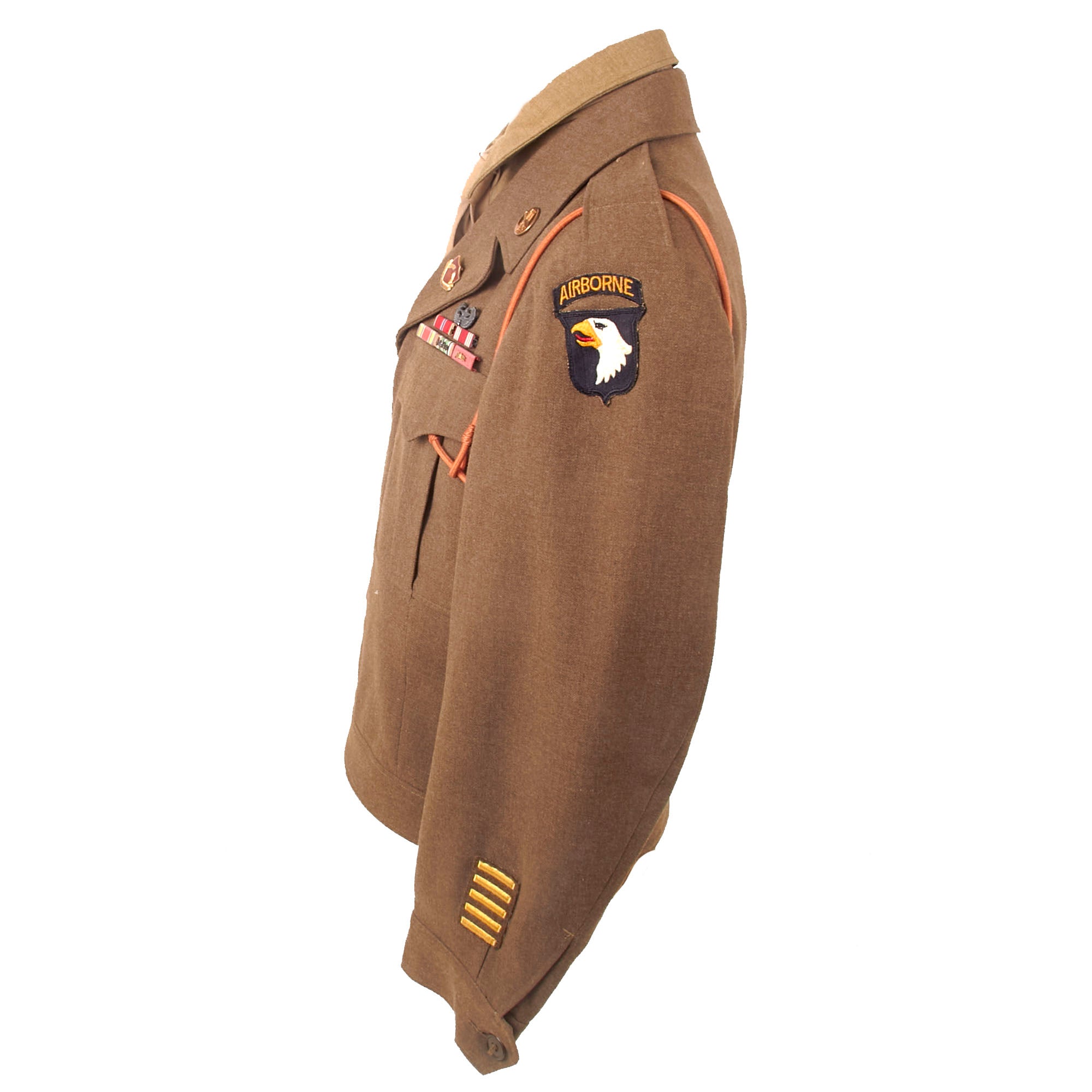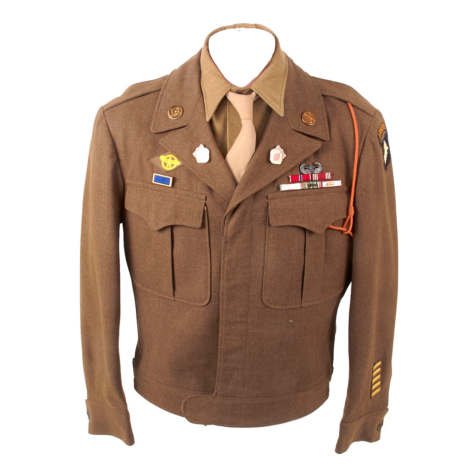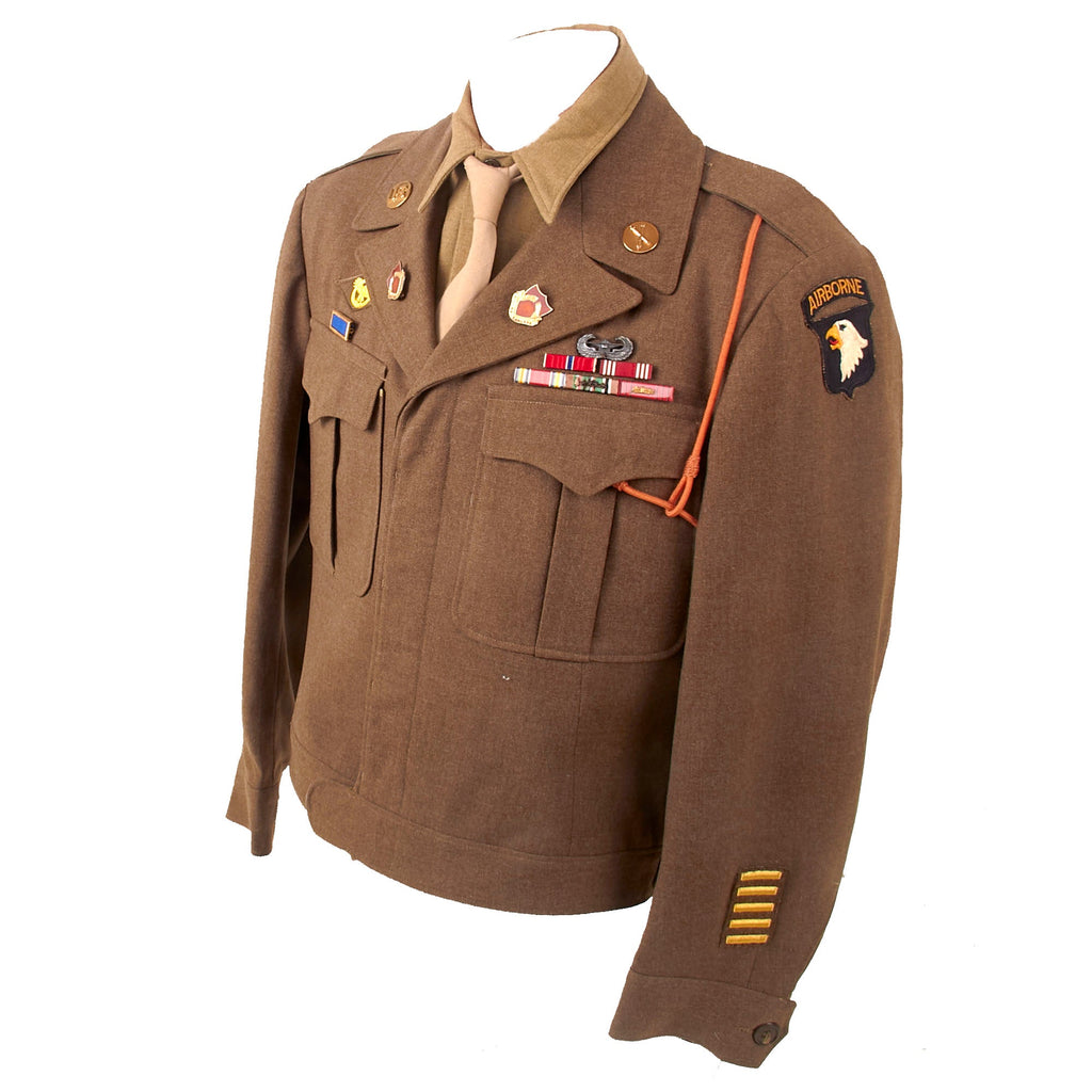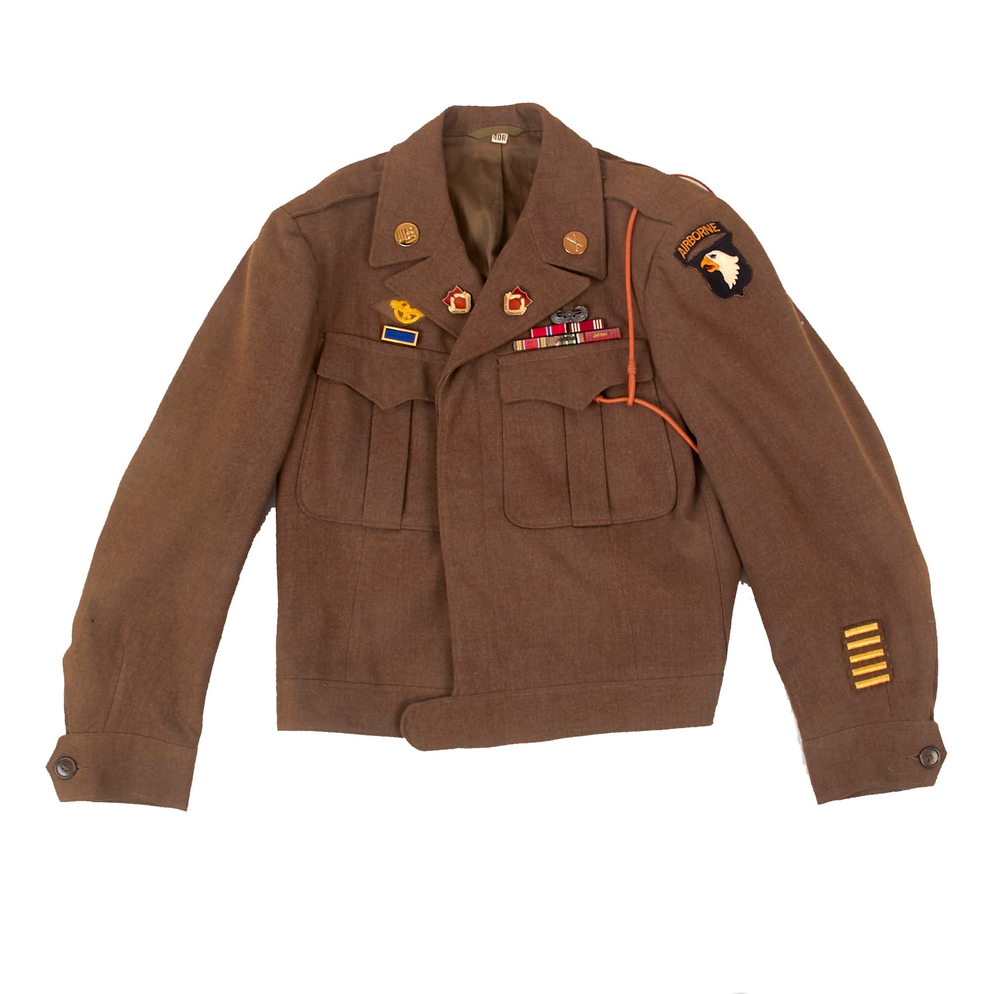 - Freddo’s Ike uniform jacket with with a 101st Airborne patch and rocker on the left shoulder, five overseas stripes on the left cuff, US & Field Artillery collar discs with 321st Glider Field Artillery Battalion Distinctive Insignia below them, and a Dutch Order of the Orange Lanyard as Awarded to U.S. Paratroopers for Operation Market Garden on the left shoulder. Above the right breast pocket is a Presidential Unit Citation with a frame and above that is a Ruptured Duck honorable discharge patch. Above the left breast pocket is a great set of Sterling marked Glider wings, with a campaign star attached to the front, often done by Paratroopers, and below that is a 5-place ribbon bar with the Bronze Star Medal, the Good Conduct Medal, the WWII Victory Medal, the European-African-Middle Eastern Campaign medal with four campaign stars and an invasion arrowhead, and the Belgian Croix de Guerre with an oak leaf device. On the interior, the name FREDDO is written under the collar, and there is a size tag, 40R.