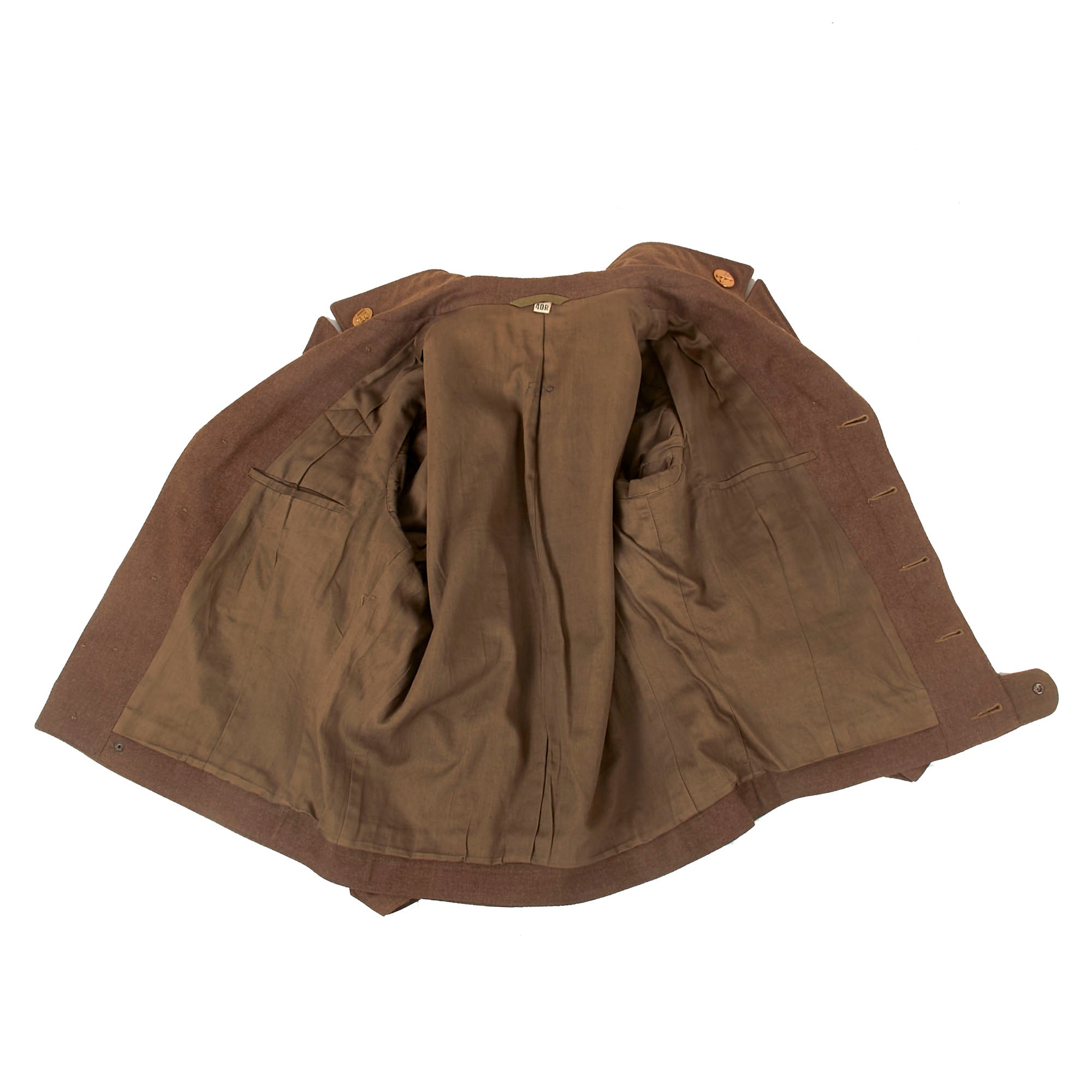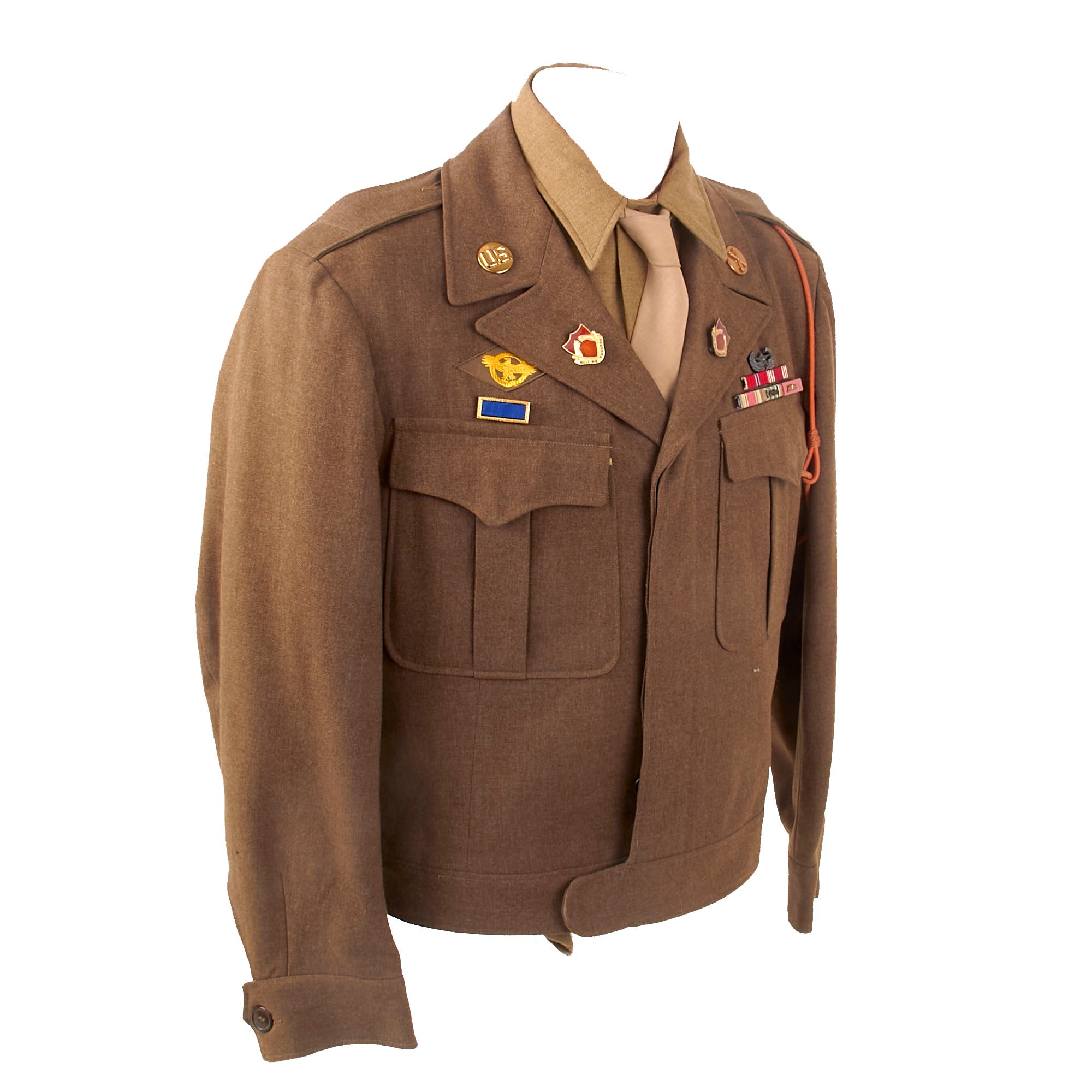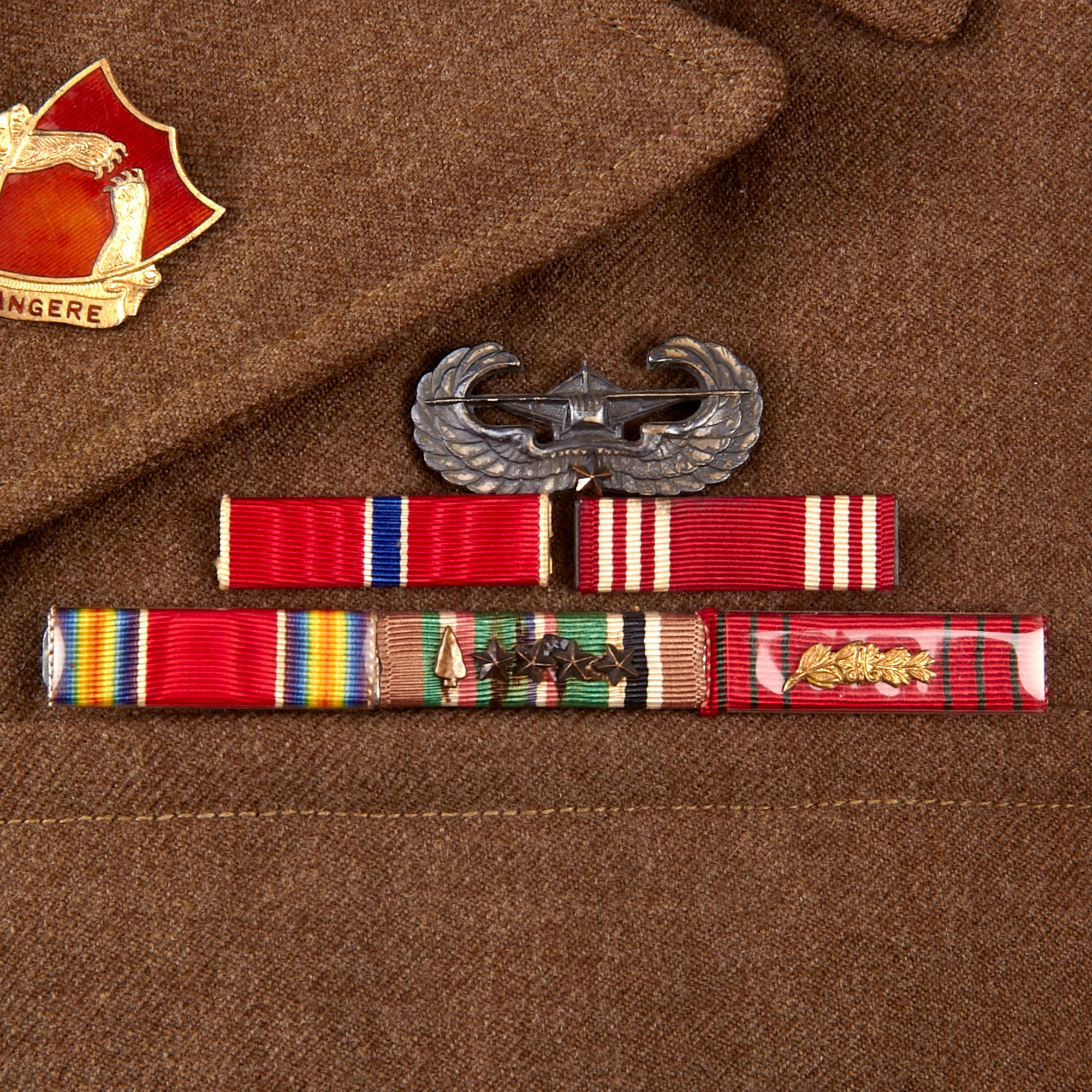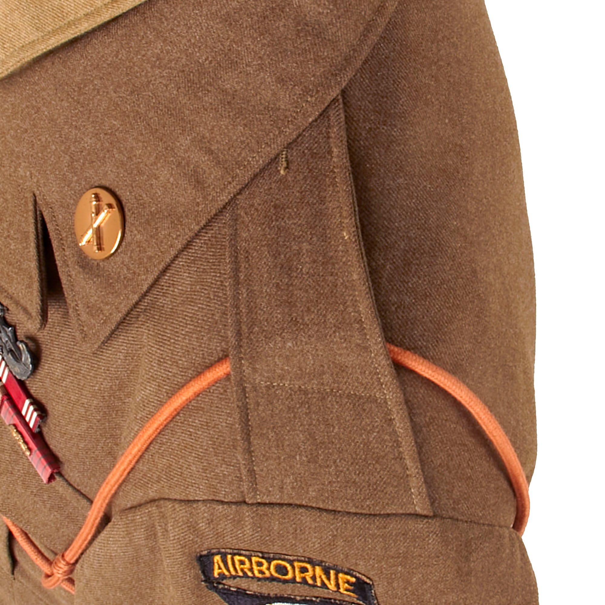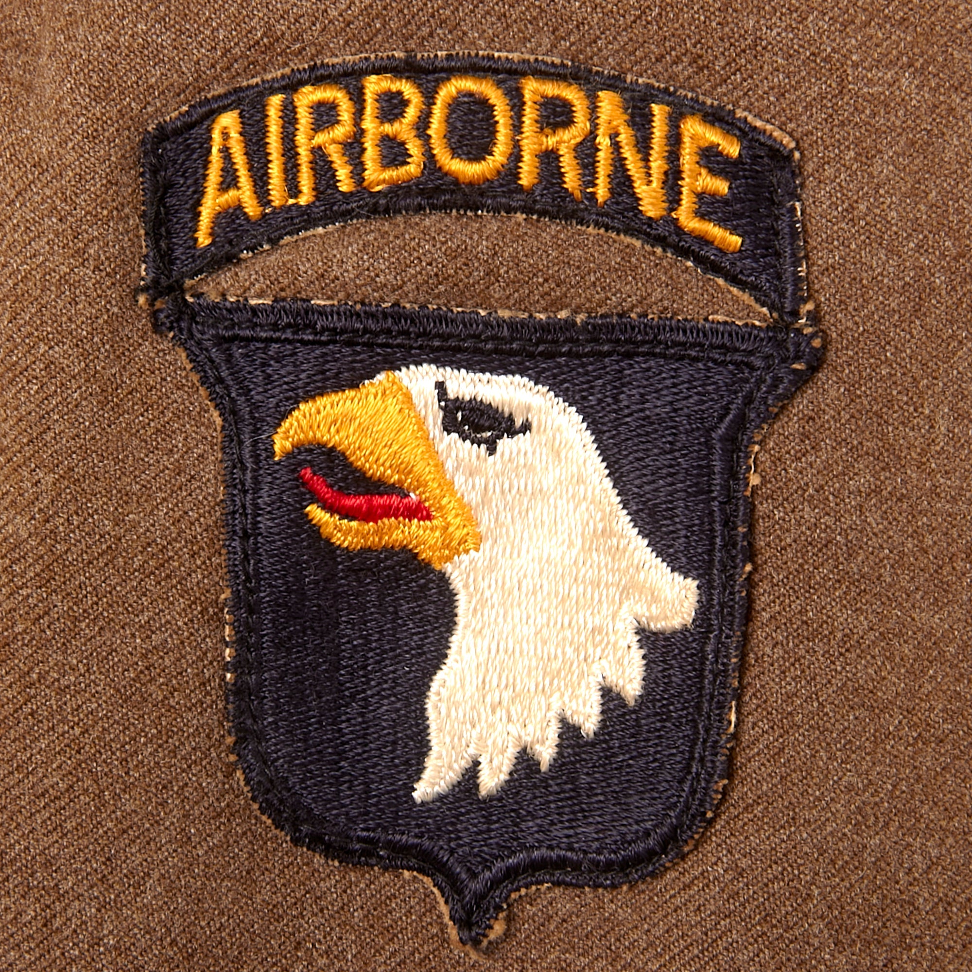 - Freddo’s Ike uniform jacket with with a 101st Airborne patch and rocker on the left shoulder, five overseas stripes on the left cuff, US & Field Artillery collar discs with 321st Glider Field Artillery Battalion Distinctive Insignia below them, and a Dutch Order of the Orange Lanyard as Awarded to U.S. Paratroopers for Operation Market Garden on the left shoulder. Above the right breast pocket is a Presidential Unit Citation with a frame and above that is a Ruptured Duck honorable discharge patch. Above the left breast pocket is a great set of Sterling marked Glider wings, with a campaign star attached to the front, often done by Paratroopers, and below that is a 5-place ribbon bar with the Bronze Star Medal, the Good Conduct Medal, the WWII Victory Medal, the European-African-Middle Eastern Campaign medal with four campaign stars and an invasion arrowhead, and the Belgian Croix de Guerre with an oak leaf device. On the interior, the name FREDDO is written under the collar, and there is a size tag, 40R.