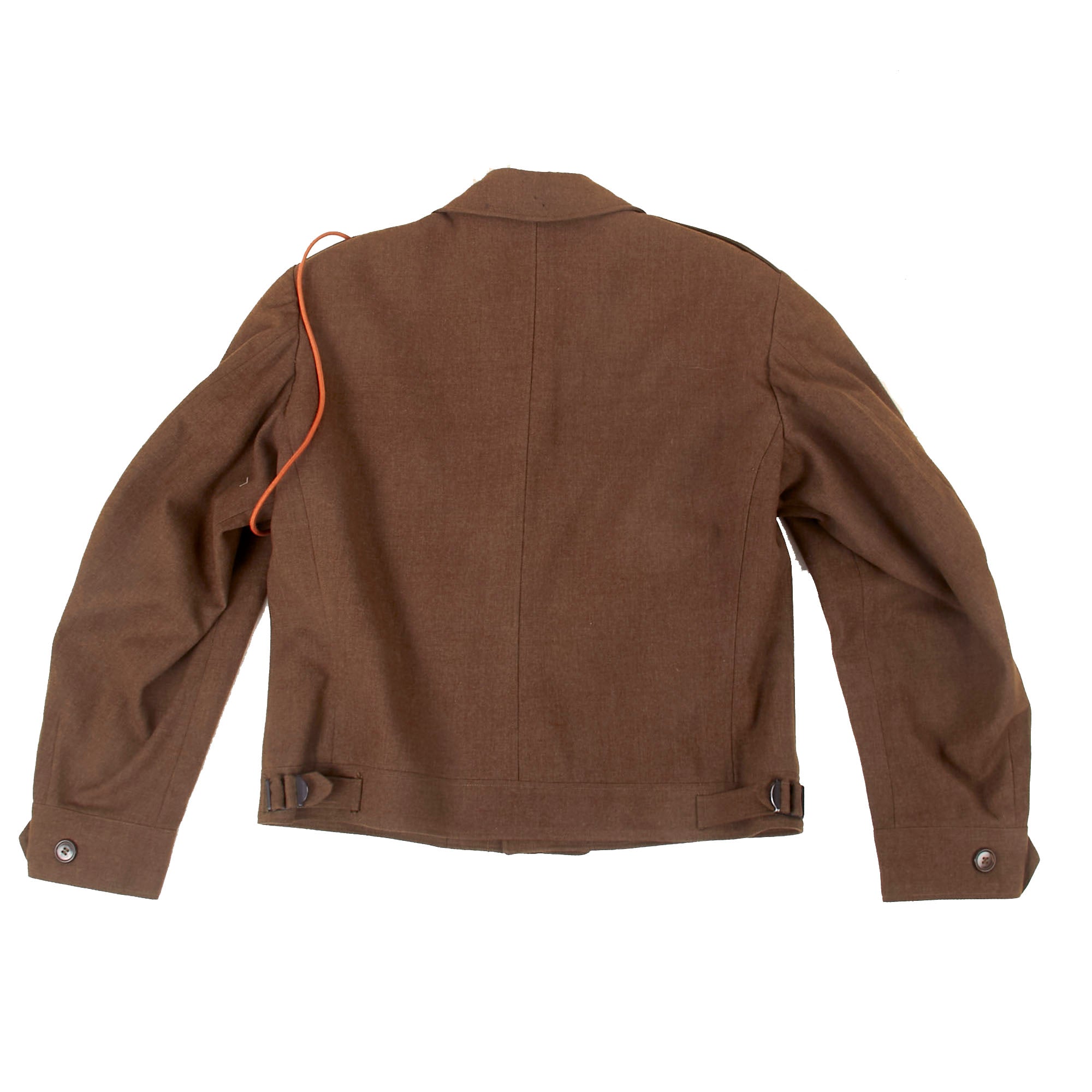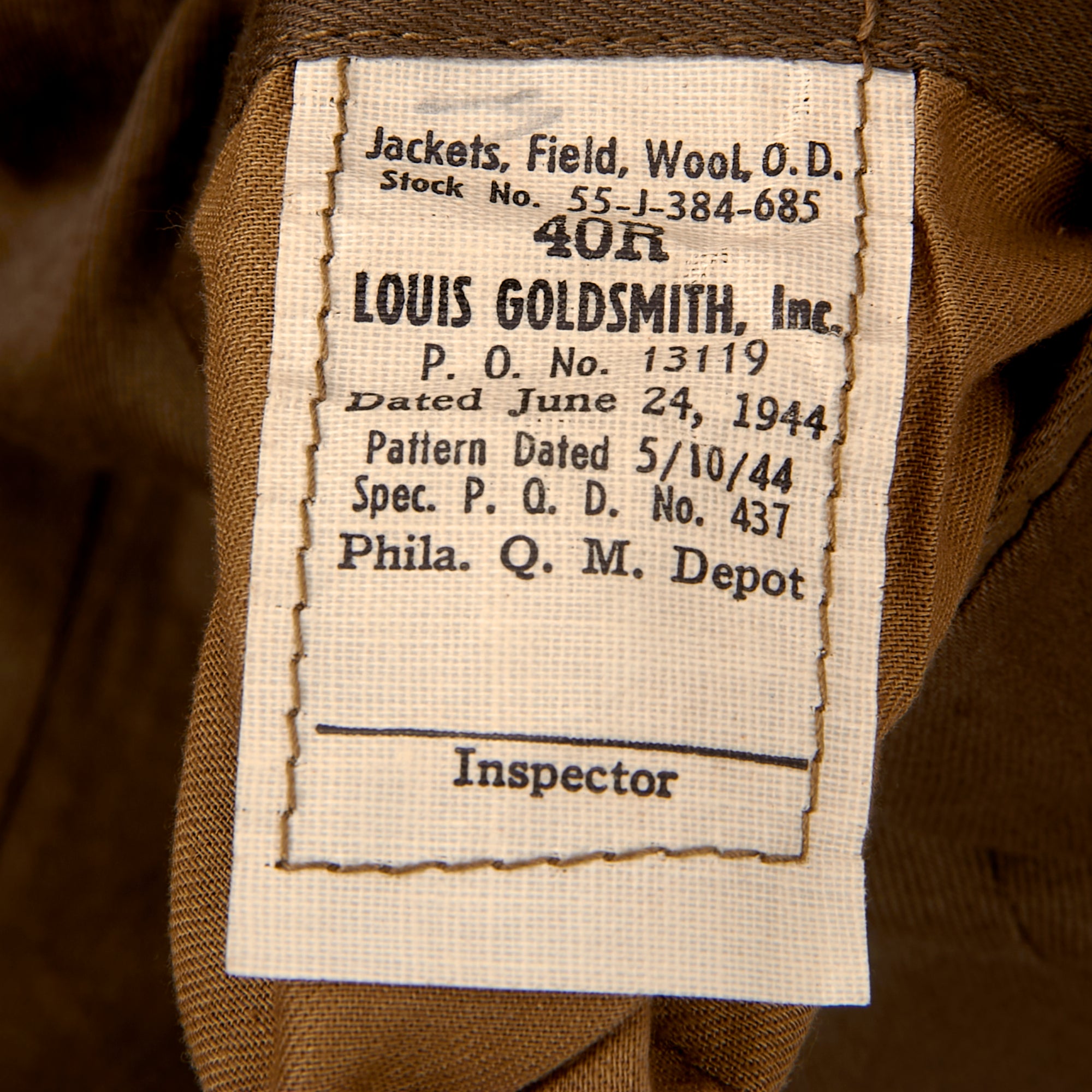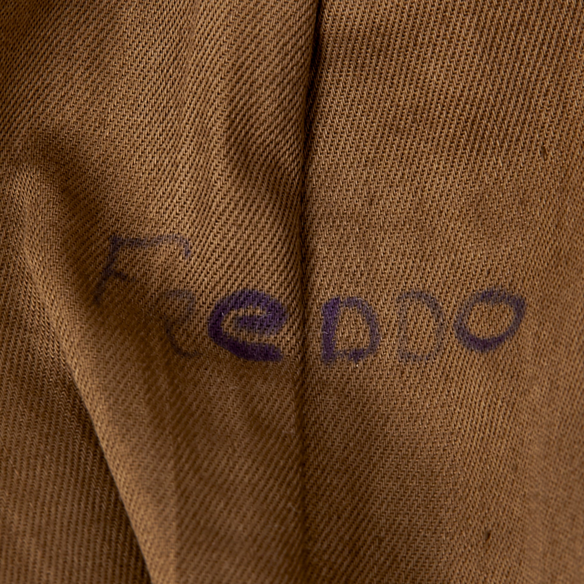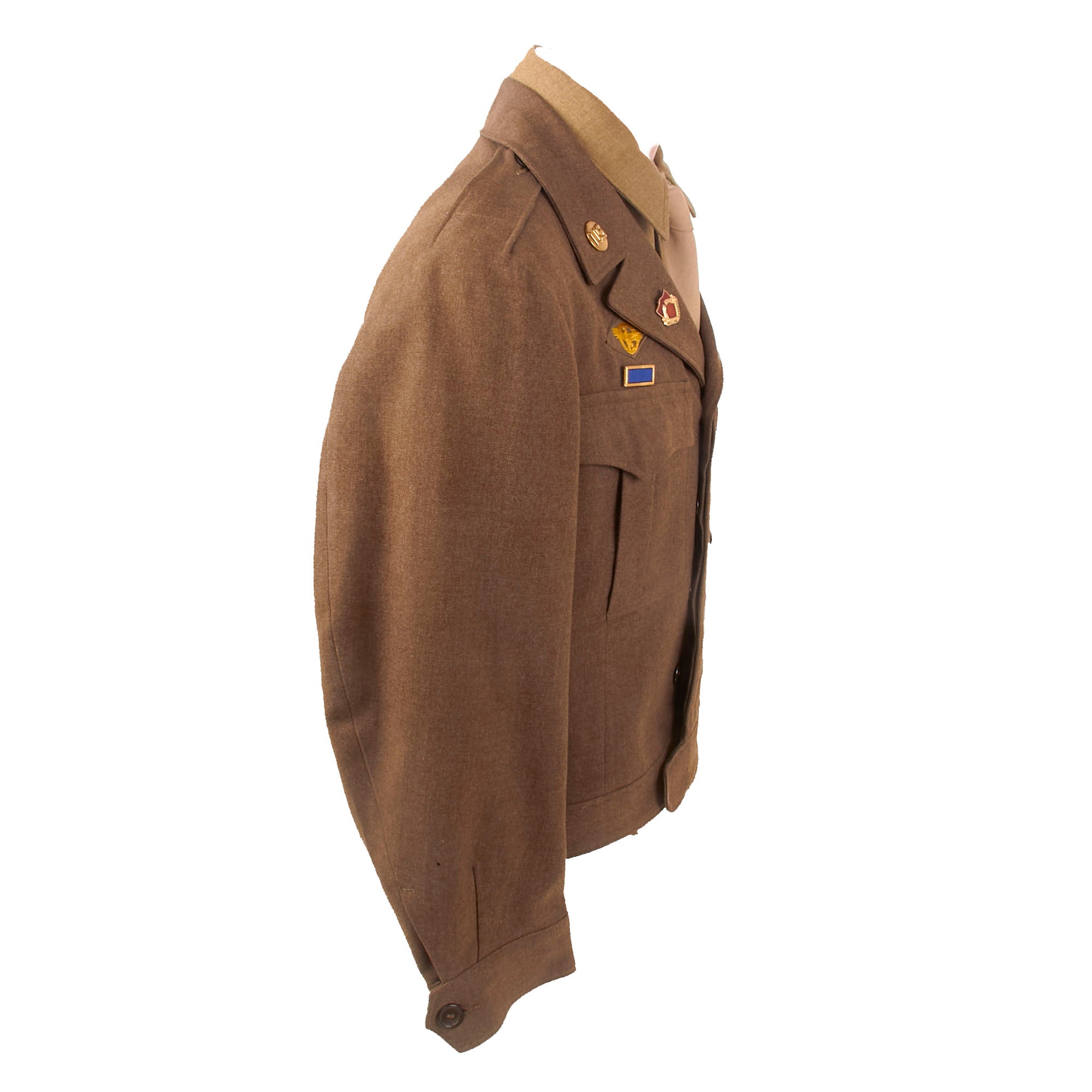 - Freddo’s Ike uniform jacket with with a 101st Airborne patch and rocker on the left shoulder, five overseas stripes on the left cuff, US & Field Artillery collar discs with 321st Glider Field Artillery Battalion Distinctive Insignia below them, and a Dutch Order of the Orange Lanyard as Awarded to U.S. Paratroopers for Operation Market Garden on the left shoulder. Above the right breast pocket is a Presidential Unit Citation with a frame and above that is a Ruptured Duck honorable discharge patch. Above the left breast pocket is a great set of Sterling marked Glider wings, with a campaign star attached to the front, often done by Paratroopers, and below that is a 5-place ribbon bar with the Bronze Star Medal, the Good Conduct Medal, the WWII Victory Medal, the European-African-Middle Eastern Campaign medal with four campaign stars and an invasion arrowhead, and the Belgian Croix de Guerre with an oak leaf device. On the interior, the name FREDDO is written under the collar, and there is a size tag, 40R.