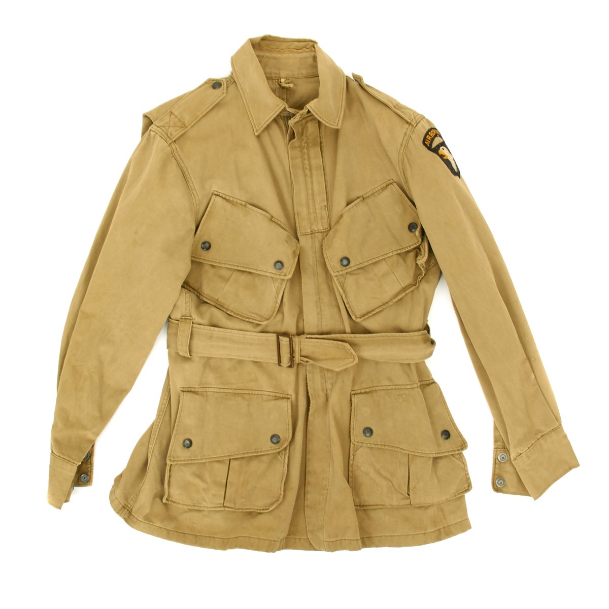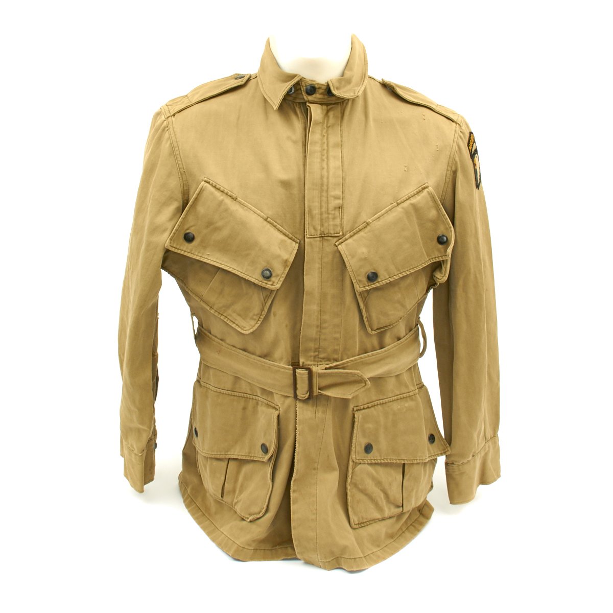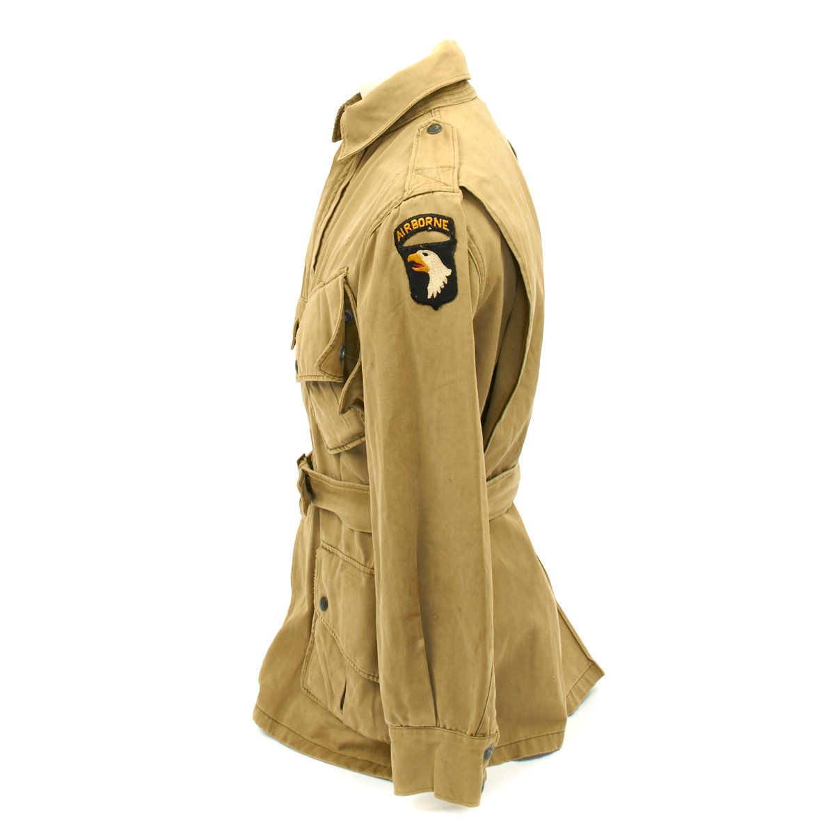 Skinner's jacket in Olive Drab #3 offered is in very good condition. The coat consists of four front patch pockets with two button snaps on each, along with a unique dual-zippered knife pocket located on the upper lapel which was designed to contain a switchblade pocketknife, used to cut the parachute rigging if entangled. The left shoulder bears an original 101st Airborne patch. The inside armpit is named SKINNER in ink (quite faded but legible).