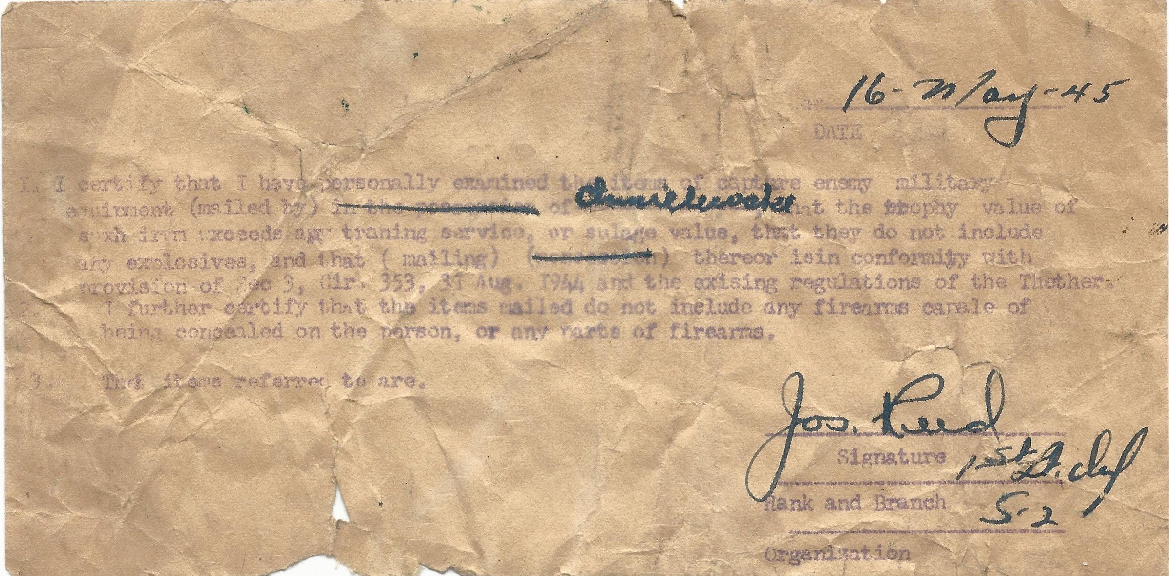 - Bring Back Certificate dated 16th May 1945 which names Chmielewski and lists multiple items such as a German Schmeiser Rifle, Arm Bands, and a Circular Swas (included in this set!).