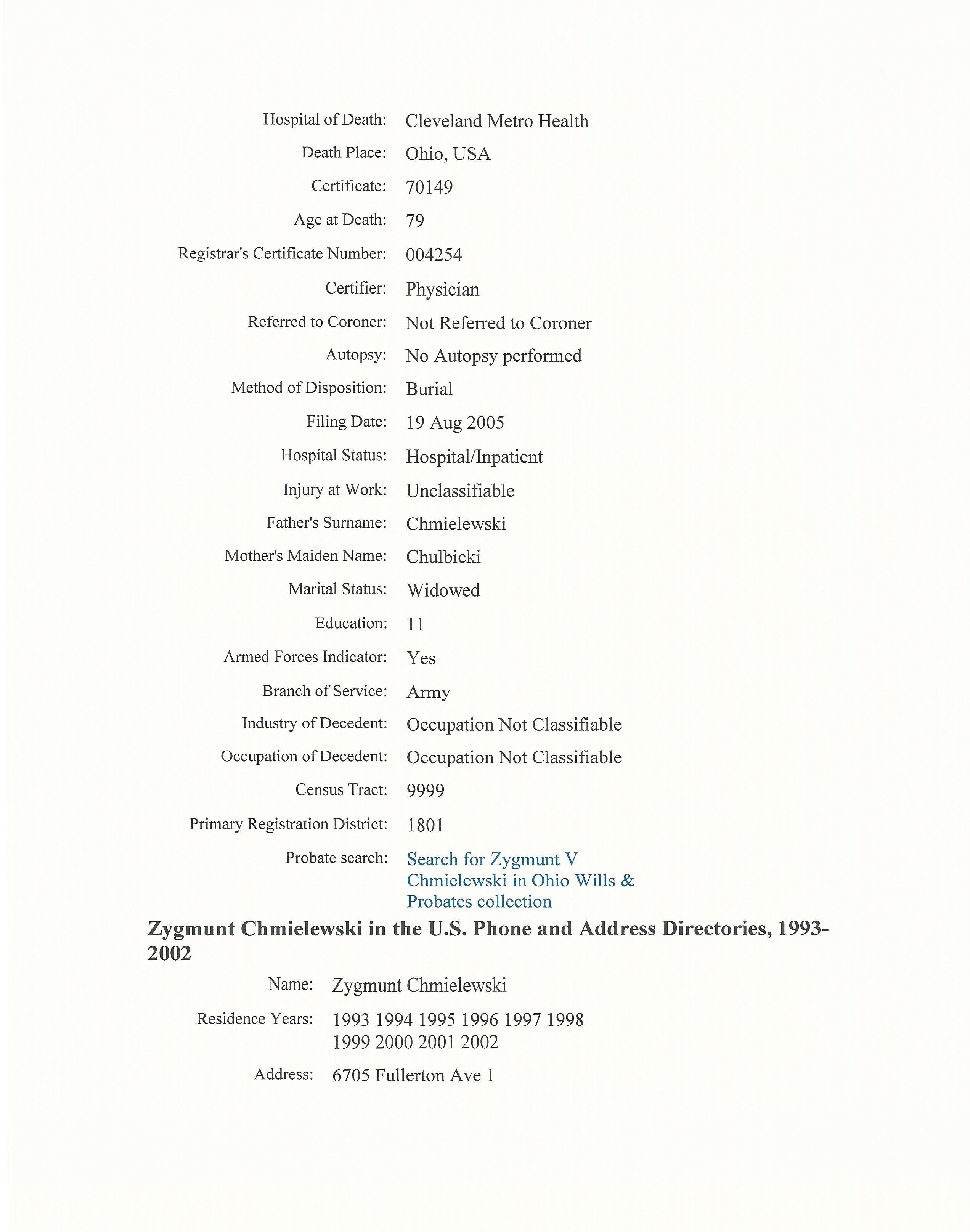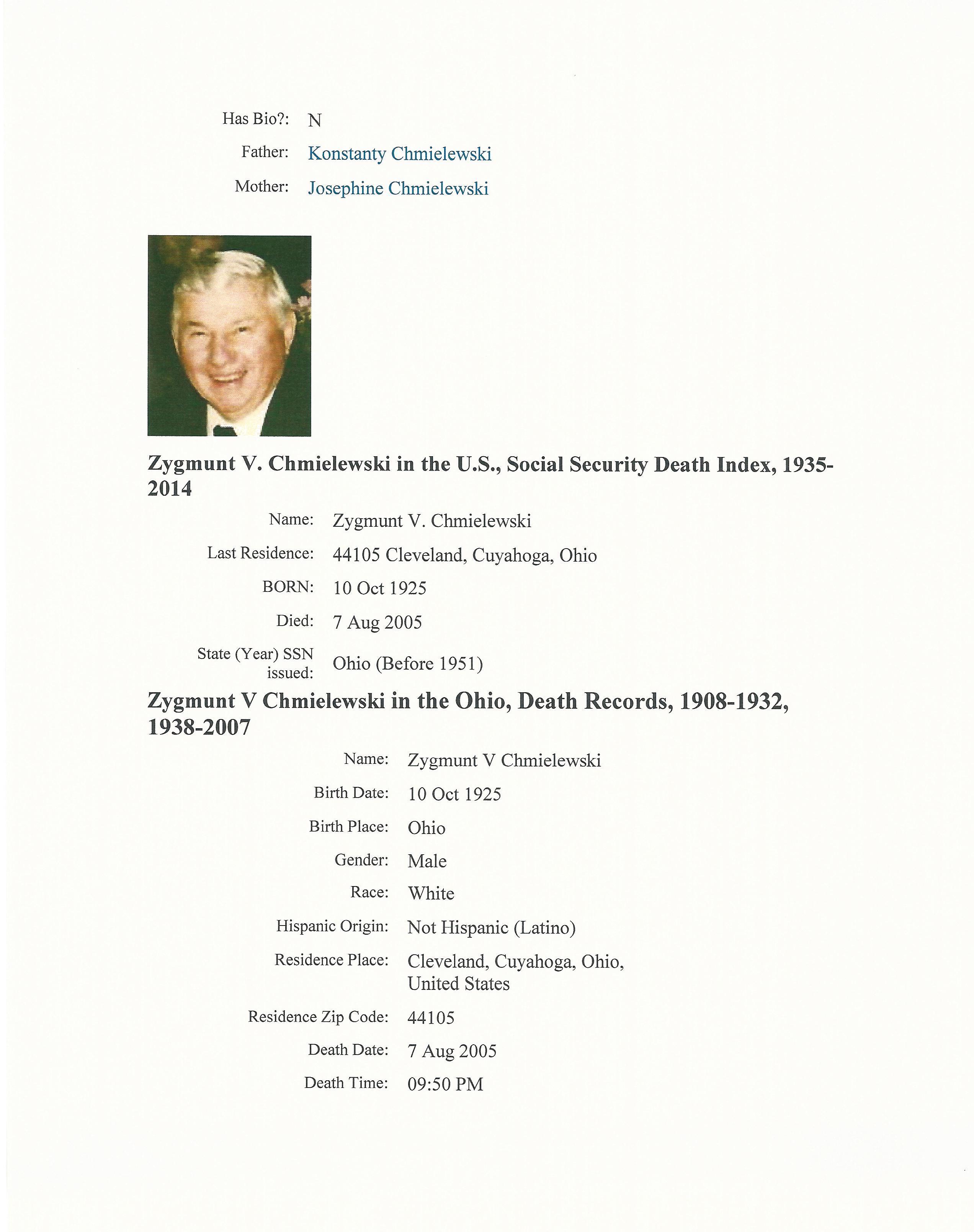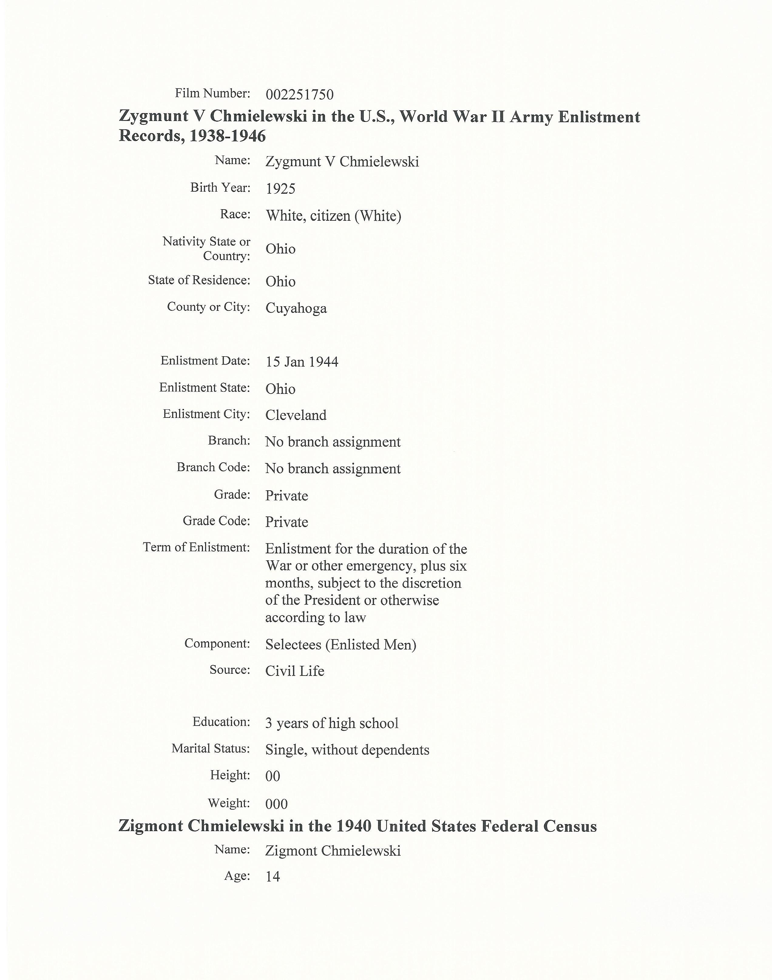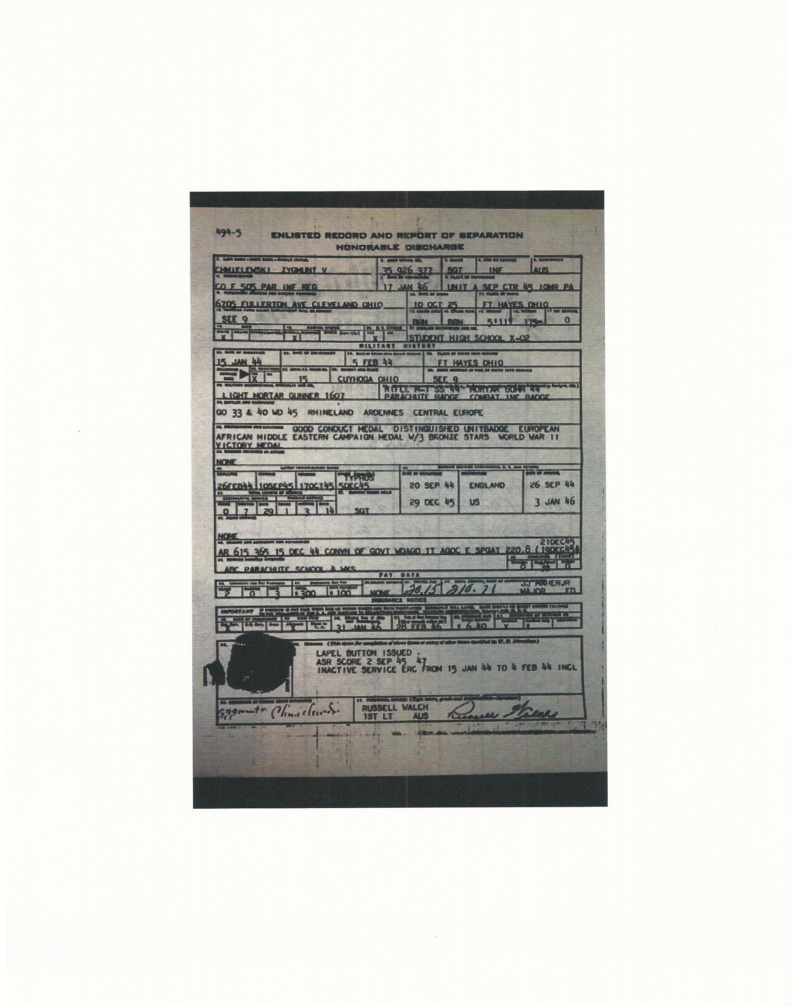 Sergeant (promoted from PFC by end of war) Zygmunt Chmielewski ASN 35926377 was born on October 10th, 1925 in Ohio and passed away on August 7th, 2005. He is documented of having jumped at Market Garden (Rhineland), then continued to fight in the Ardennes (Battle of the Bulge), and Central Europe finally entering German for occupation duty in 1945. He returned home with the 82nd Airborne 505th PIR on the ship the Queen Mary in later 1945. Online resources state that he was a recipient of the Bronze Star but this is not mentioned in his Honorable Discharge. He can be found with a wartime photo on the 101st Airborne website at this link.