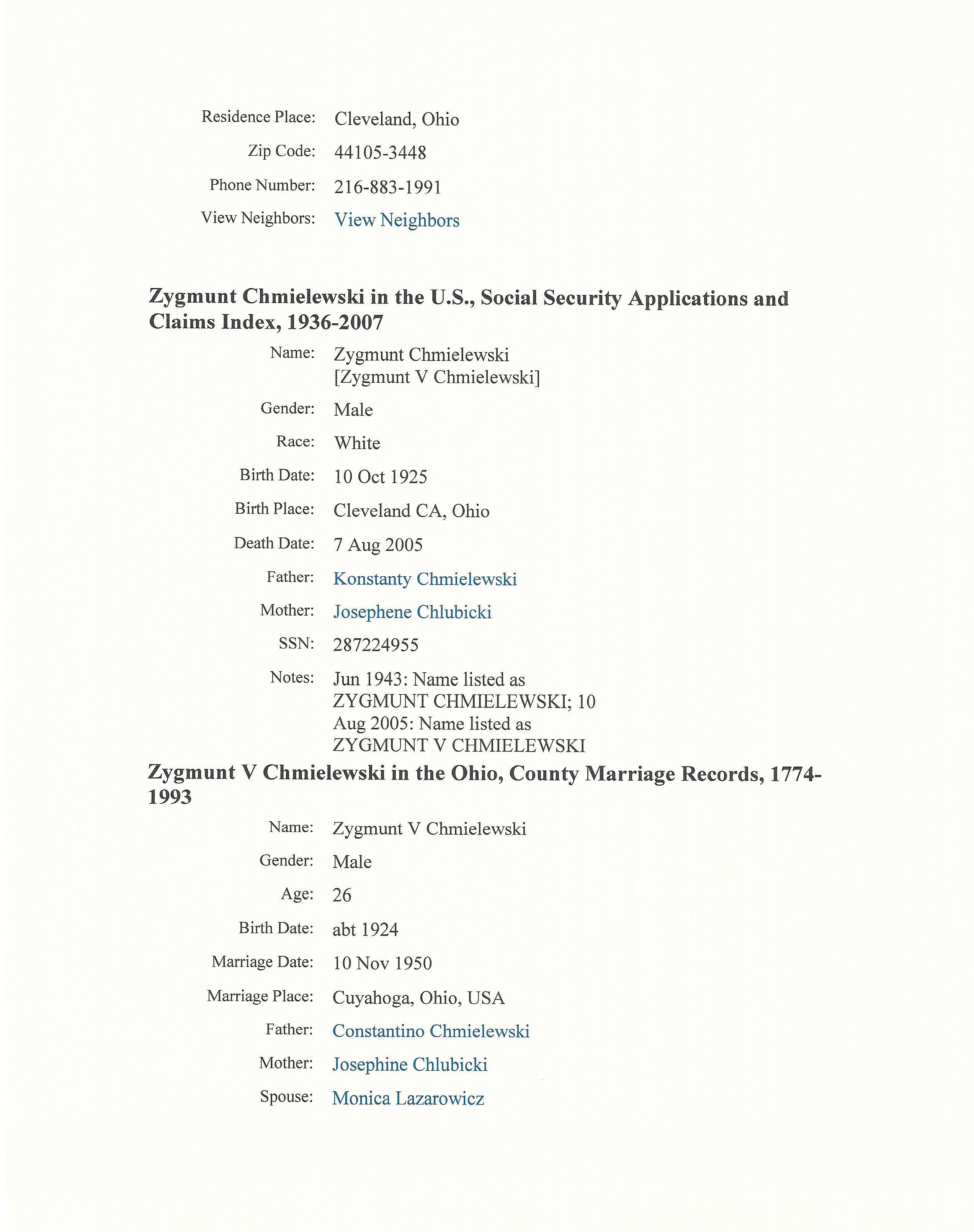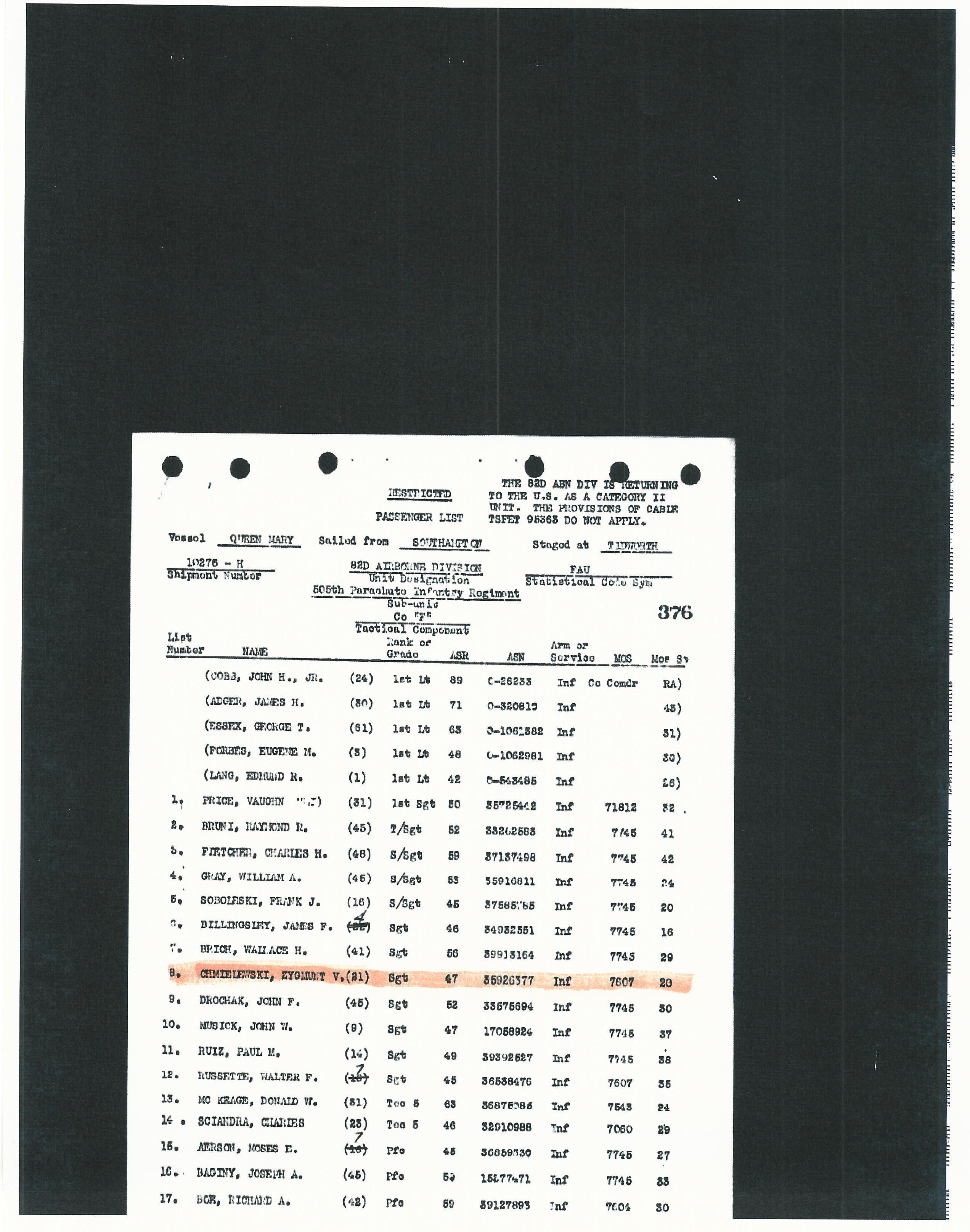 - Binder of research on Chmielewski which includes; copy of his Honorable Discharge, copy of passenger manifest from the Queen Mary which names Chmielewski, copy of Company A 506th PIR roster which names Chmielewski, copy of a wartime photo of him in uniform and much more.