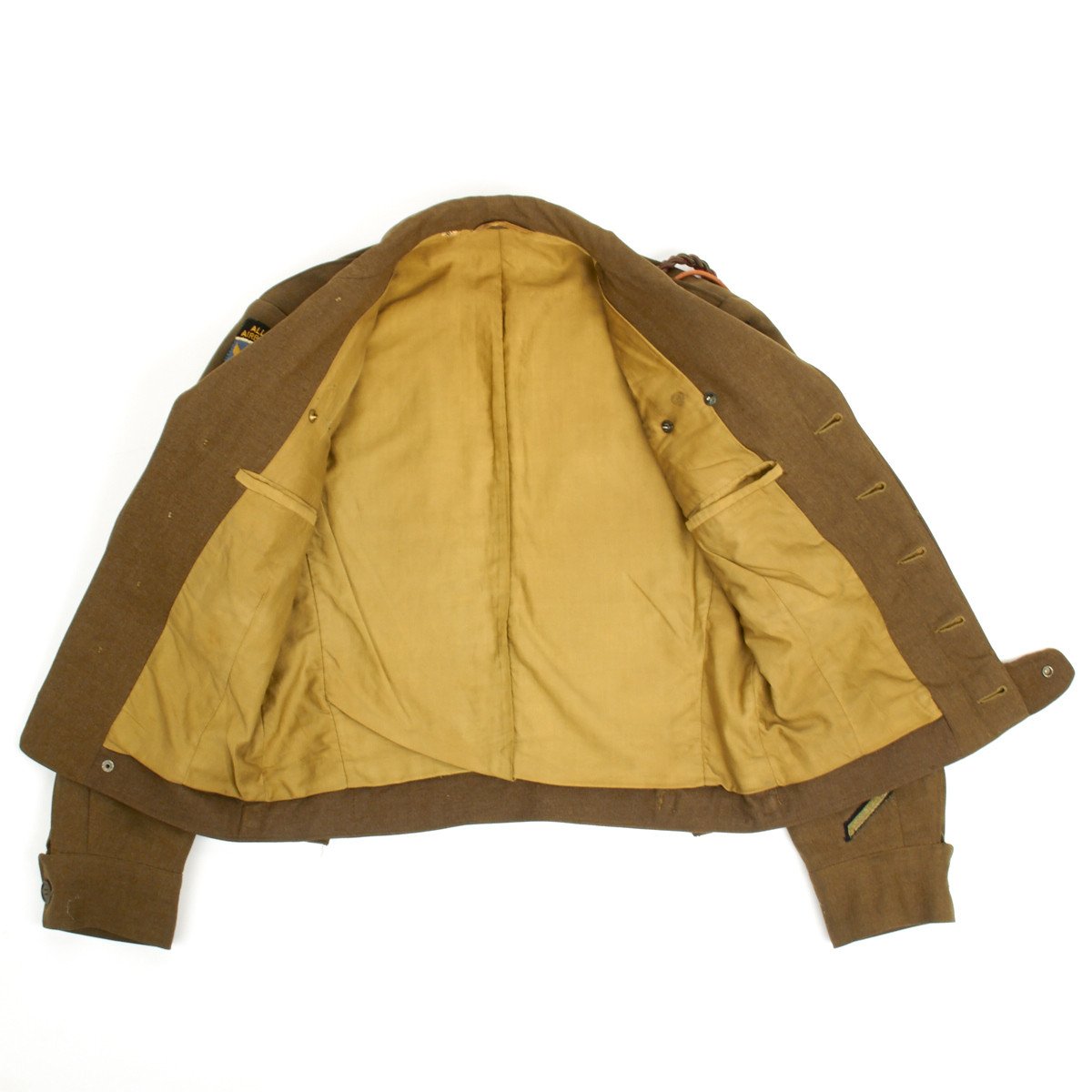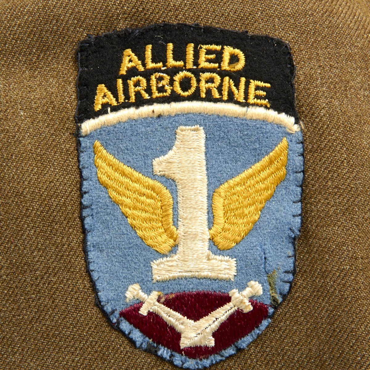 1st Allied Airborne patch on left shoulder, 101st Airborne patch on right shoulder. The Patches, ribbons, awards are as follows (please note that as this jacket is unnamed we cannot verify that all of these are correct for this soldier, but are WW2 era).