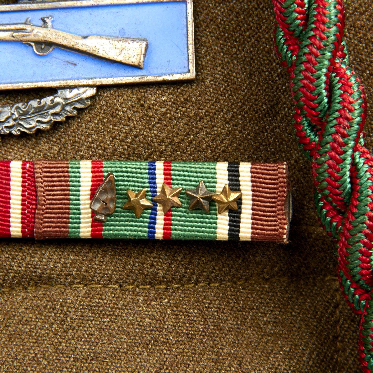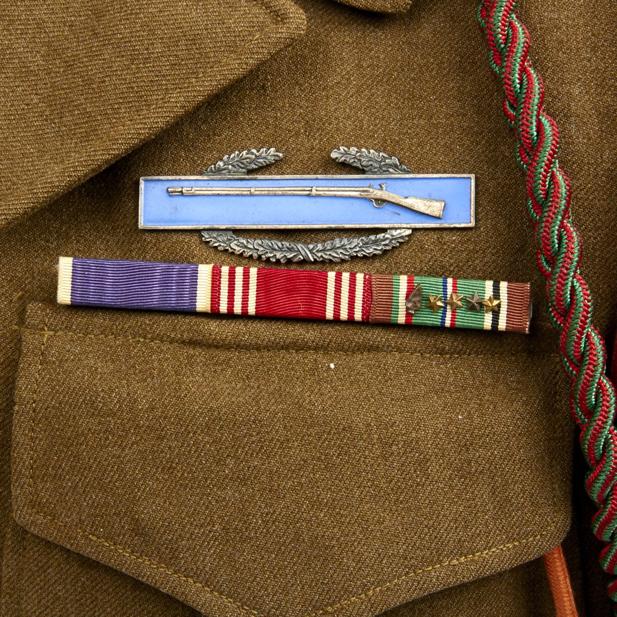 Wear on the patches, ribbons and material, has sterling pin back CIB (Combat Infantryman Badge). Lapel infantry insignia are both the screw back type IIIA.