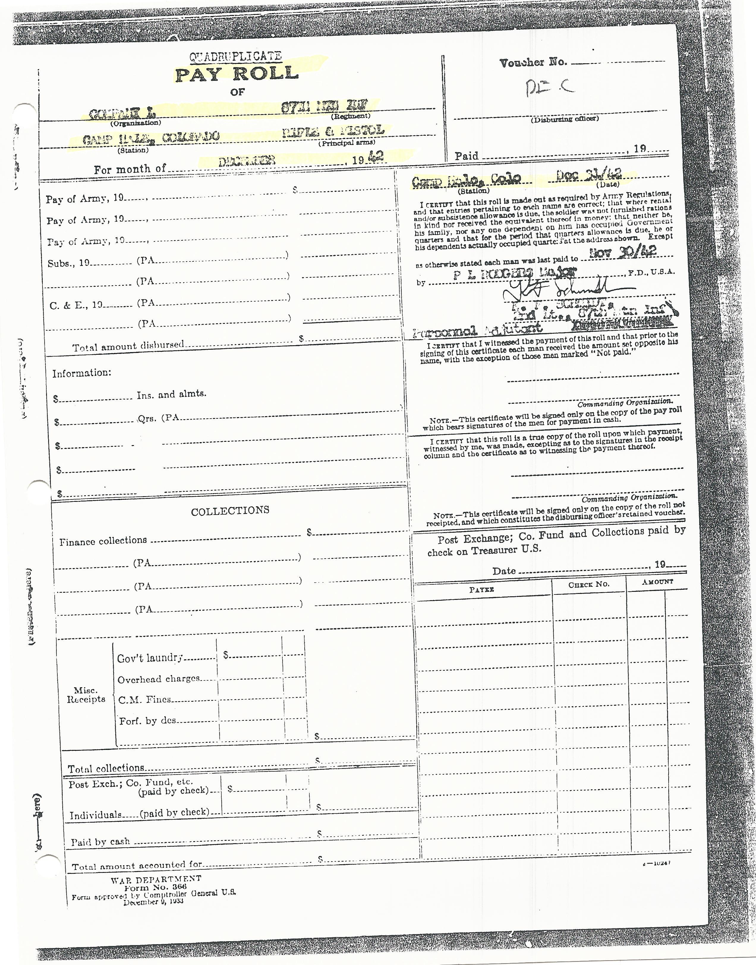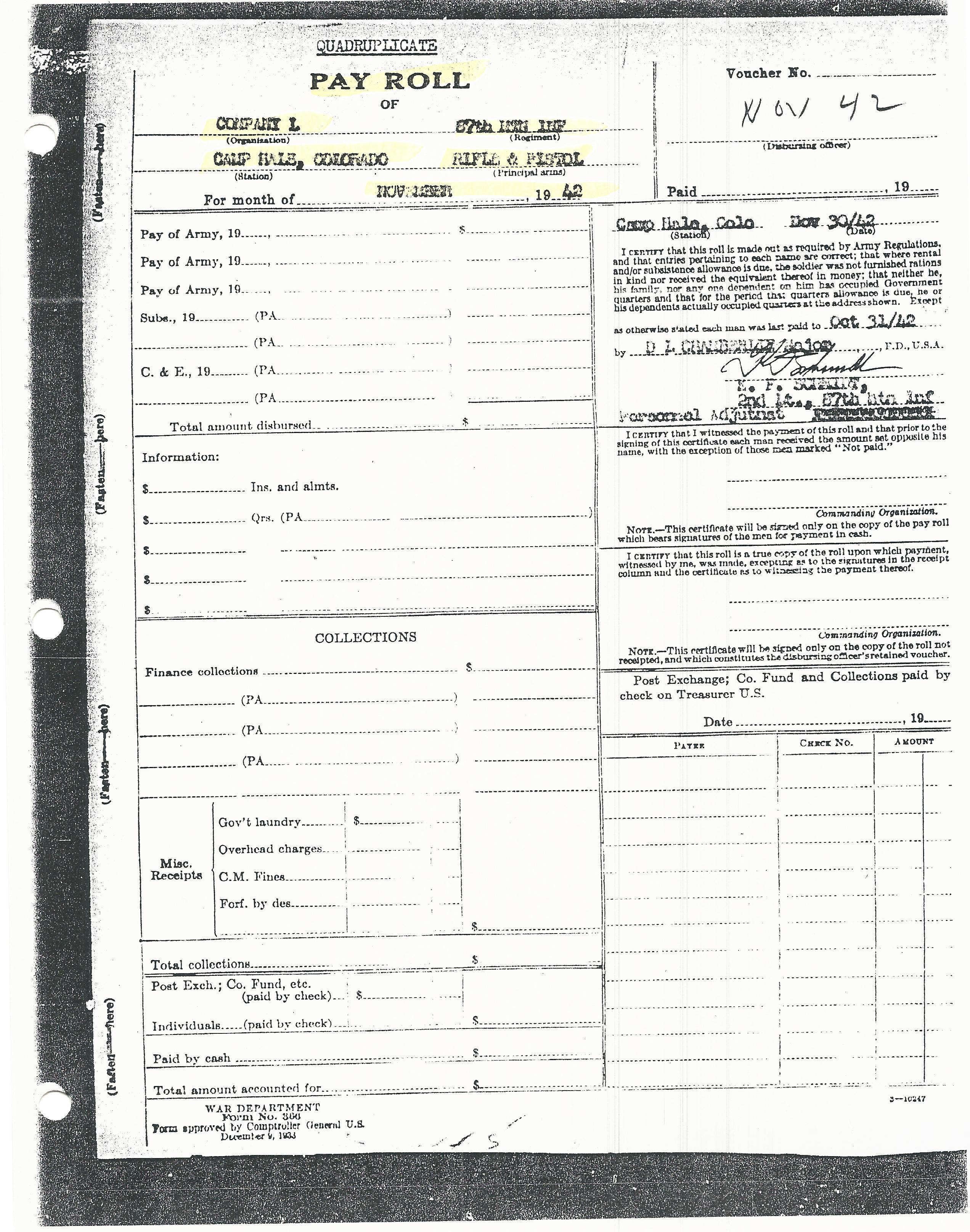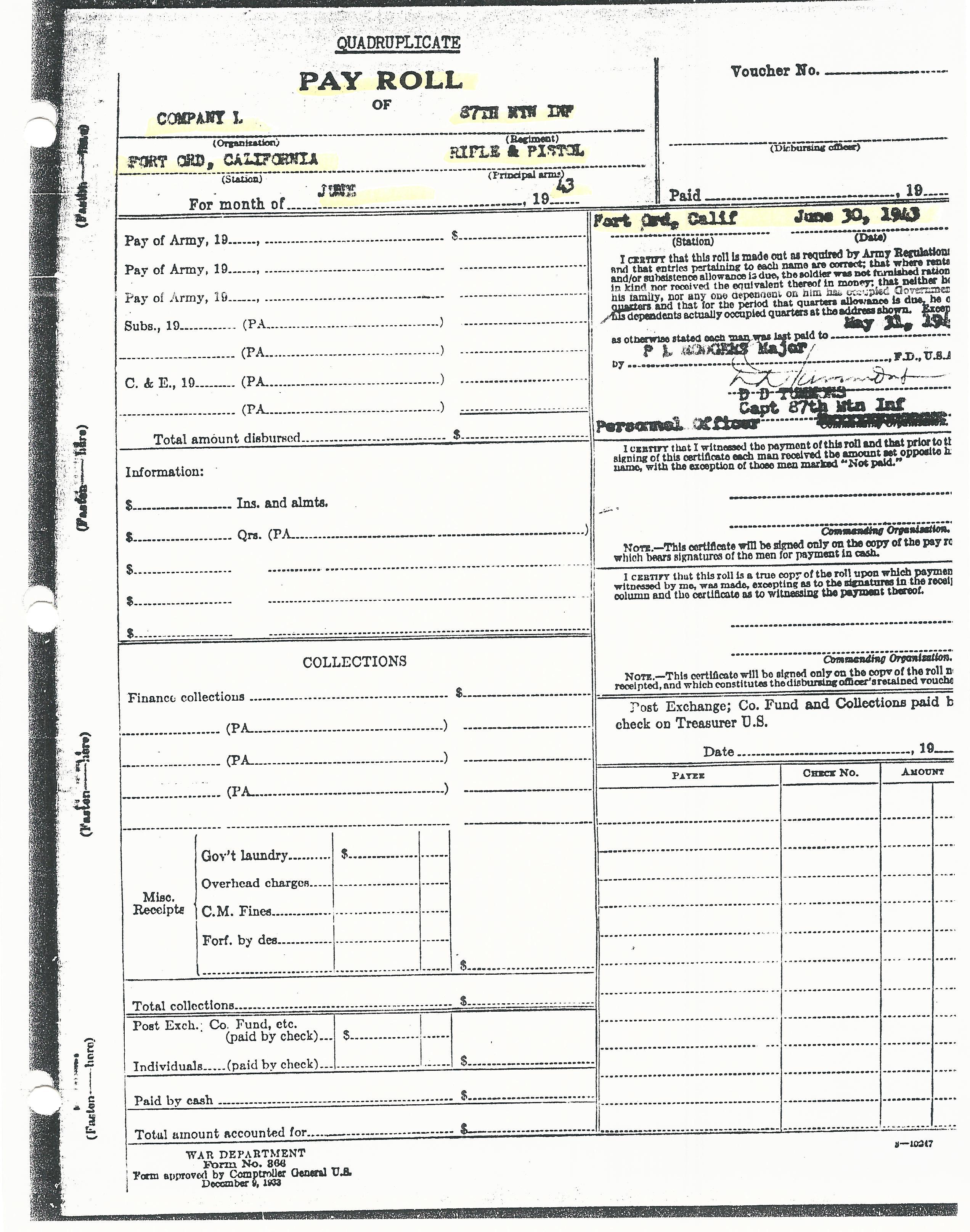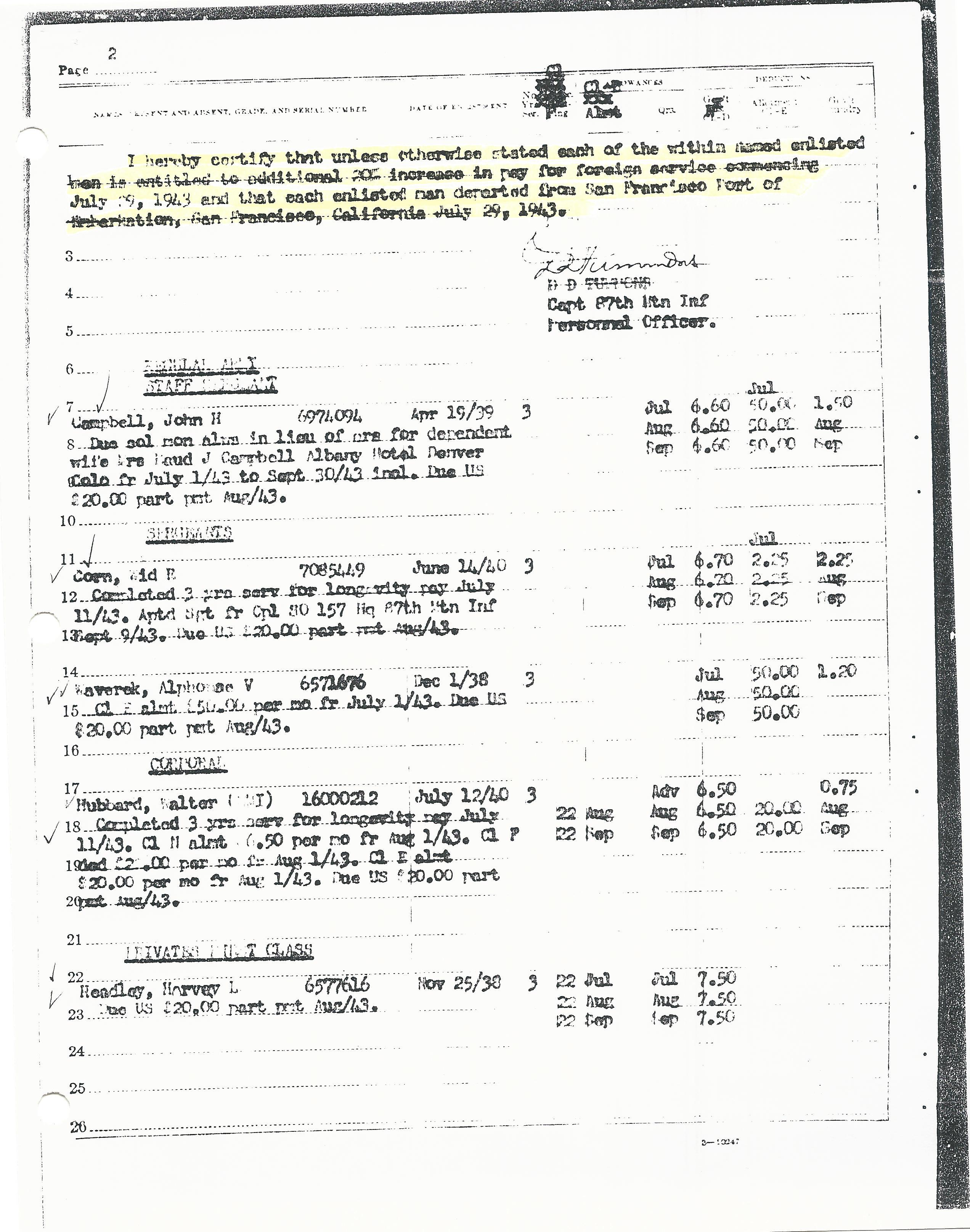 The September 1943 payroll report notes Donald having been demoted to Private and transferred to Company E in August, but we do not have documentation specifically concerning his demotion. This report also shows he was eligible for a 20% increase in pay for foreign service for the time he was at Kiska. Donald remained as part of the occupation force until the end of December, when the 87th returned to the States and all of the men were granted leave.